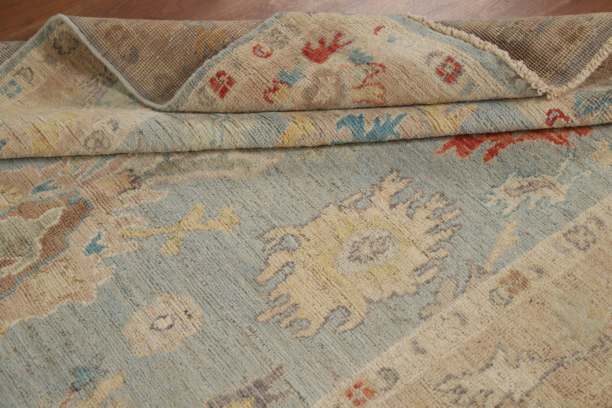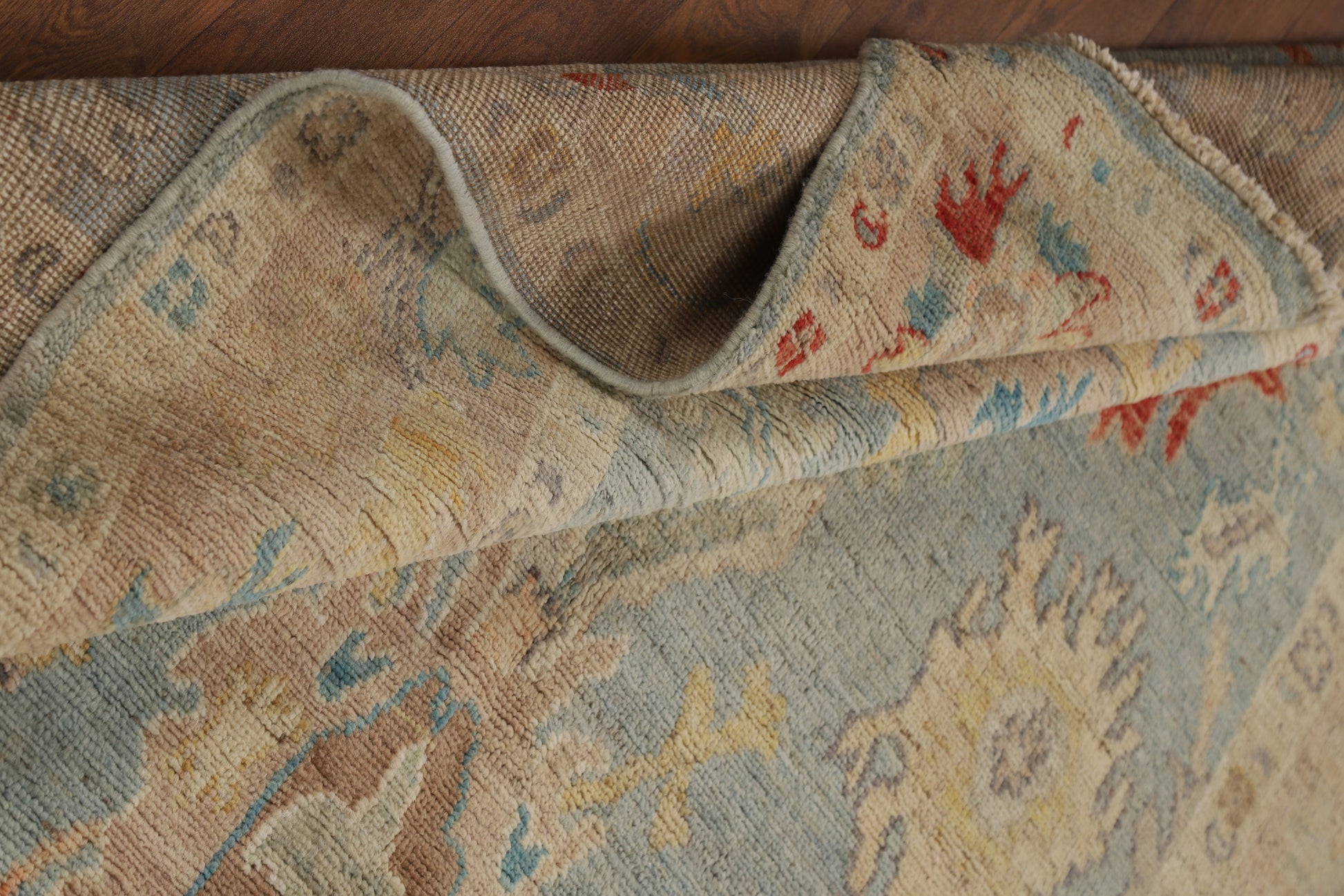 A Beautiful Genuine Turkey Oushak rug is Hand Knotted by skillful weavers in Turkey with 100% Wool Material. This rug is in New, First Quality condition. dimensions are 6' 11'' X 4' 11'' in foot and 211 X 150 in centimeter. the primary color is Navy Blue & Blues.