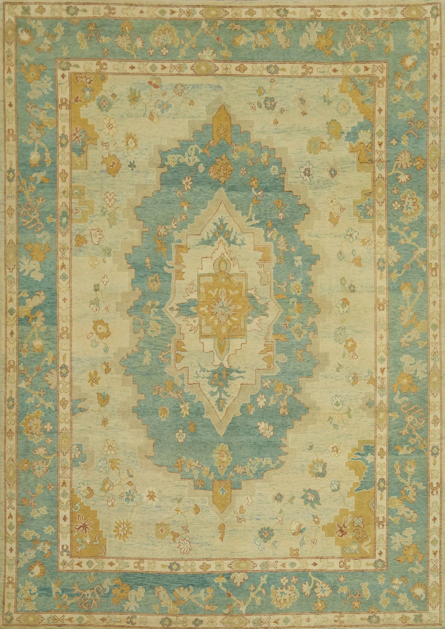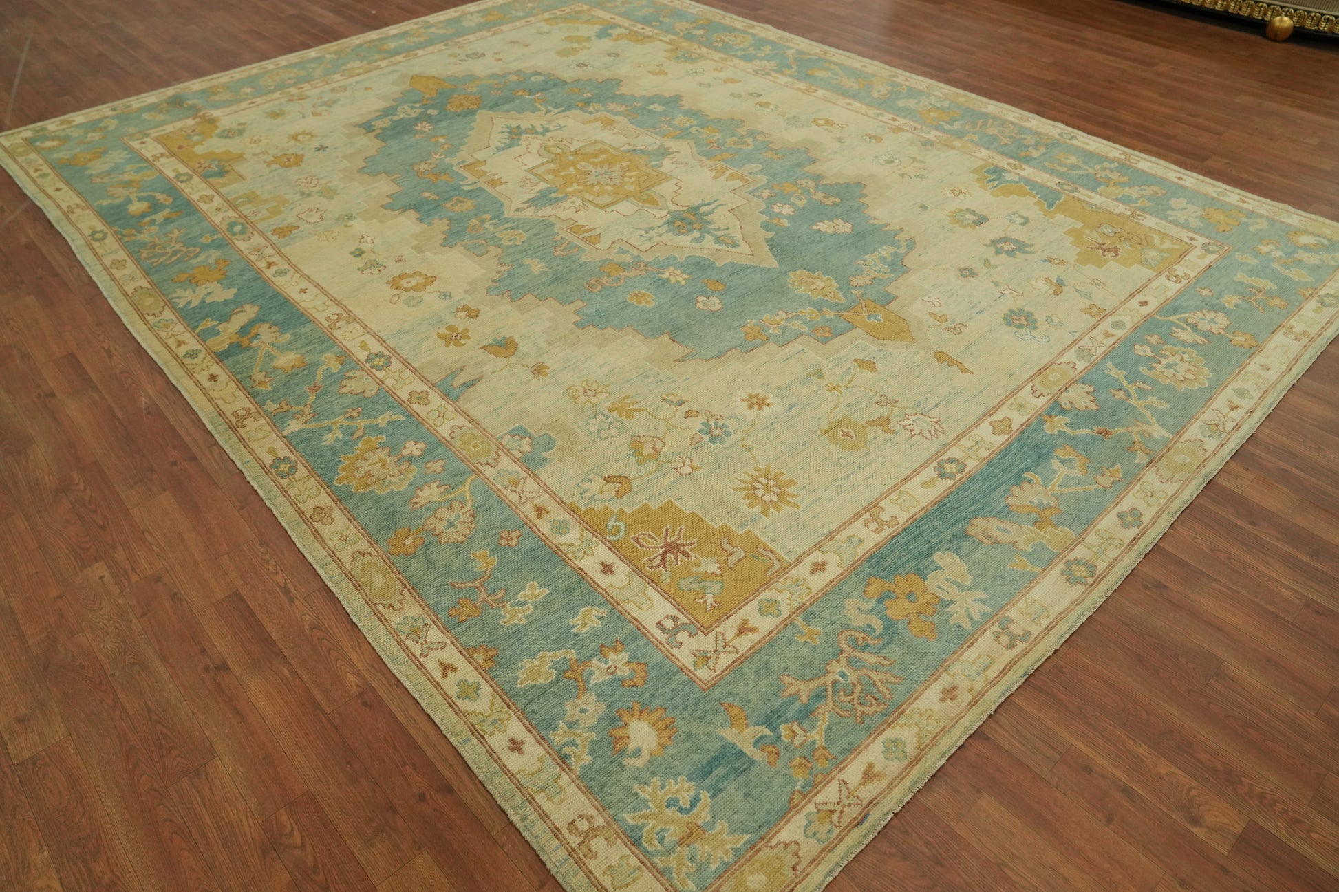 A Beautiful Genuine Turkey Oushak rug is Hand Knotted by skillful weavers in Turkey with 100% Wool Material. This rug is in New, First Quality condition. dimensions are 11' 10'' X 9' 0'' in foot and 361 X 274 in centimeter. the primary color is Navy Blue & Blues.