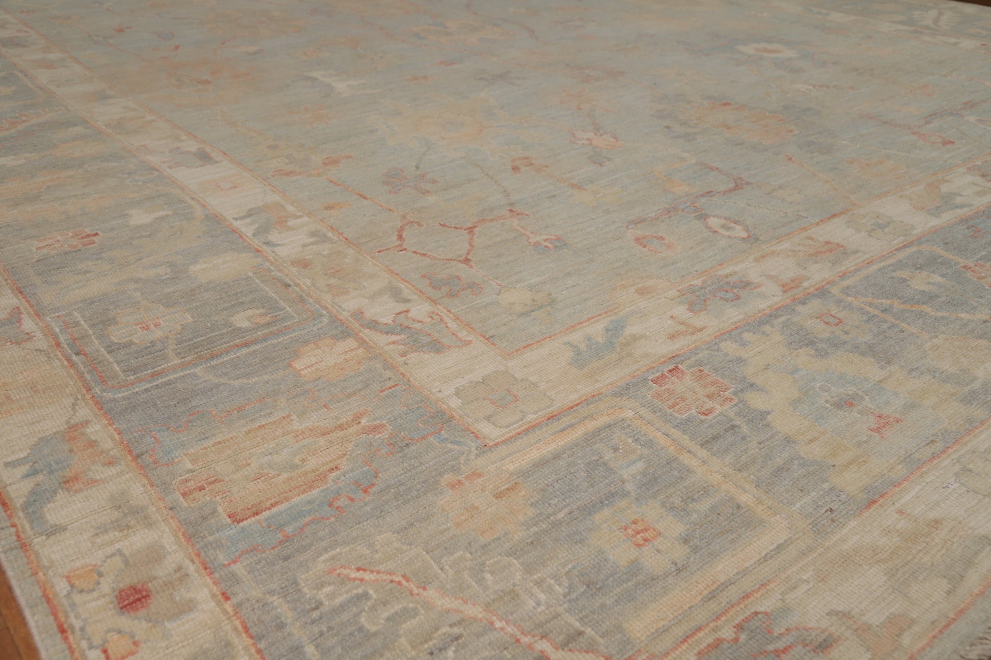 A Beautiful Genuine Turkey Oushak rug is Hand Knotted by skillful weavers in Turkey with 100% Wool Material. This rug is in New, First Quality condition. dimensions are 14' 1'' X 10' 2'' in foot and 429 X 310 in centimeter. the primary color is Navy Blue & Blues.