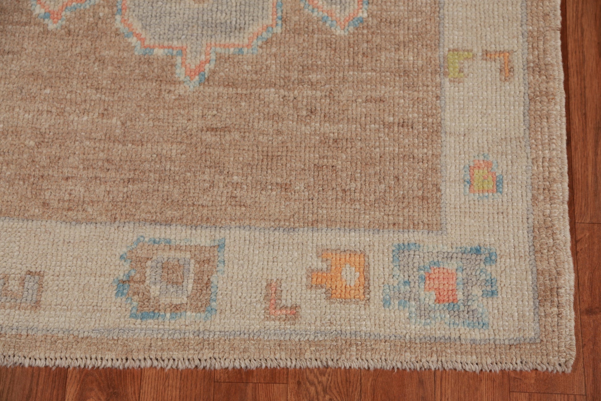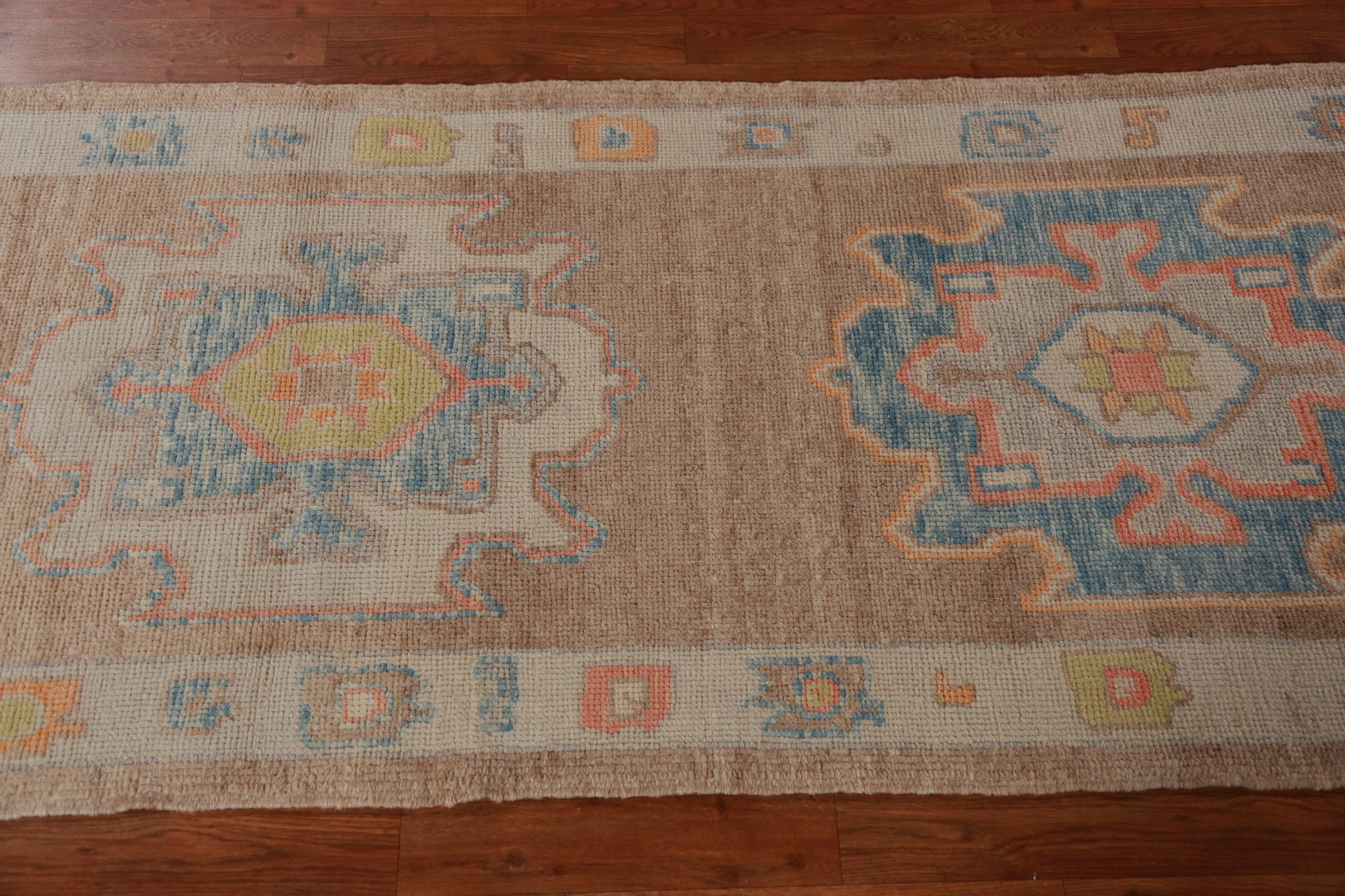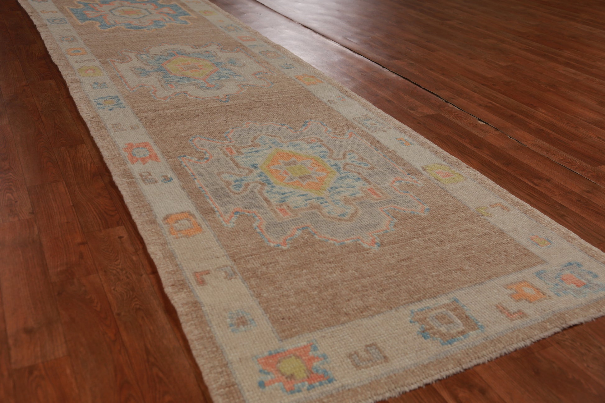 A Beautiful Genuine Turkey Oushak rug is Hand Knotted by skillful weavers in Turkey with 100% Wool Material. This rug is in New, First Quality condition. dimensions are 10' 2'' X 2' 11'' in foot and 310 X 89 in centimeter. the primary color is Brown.