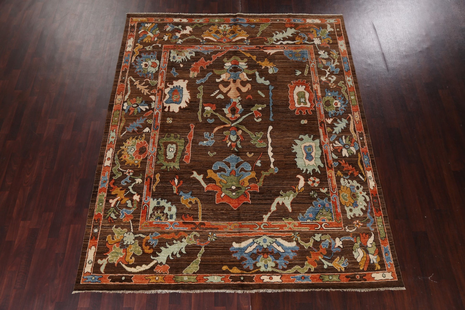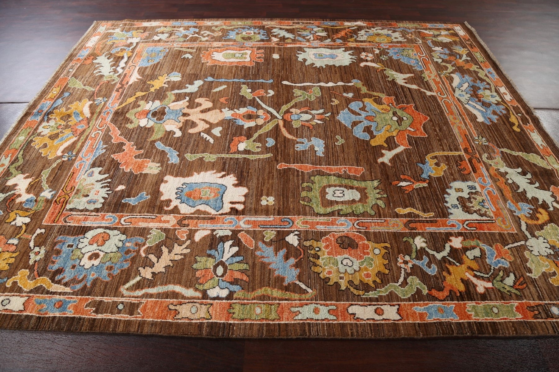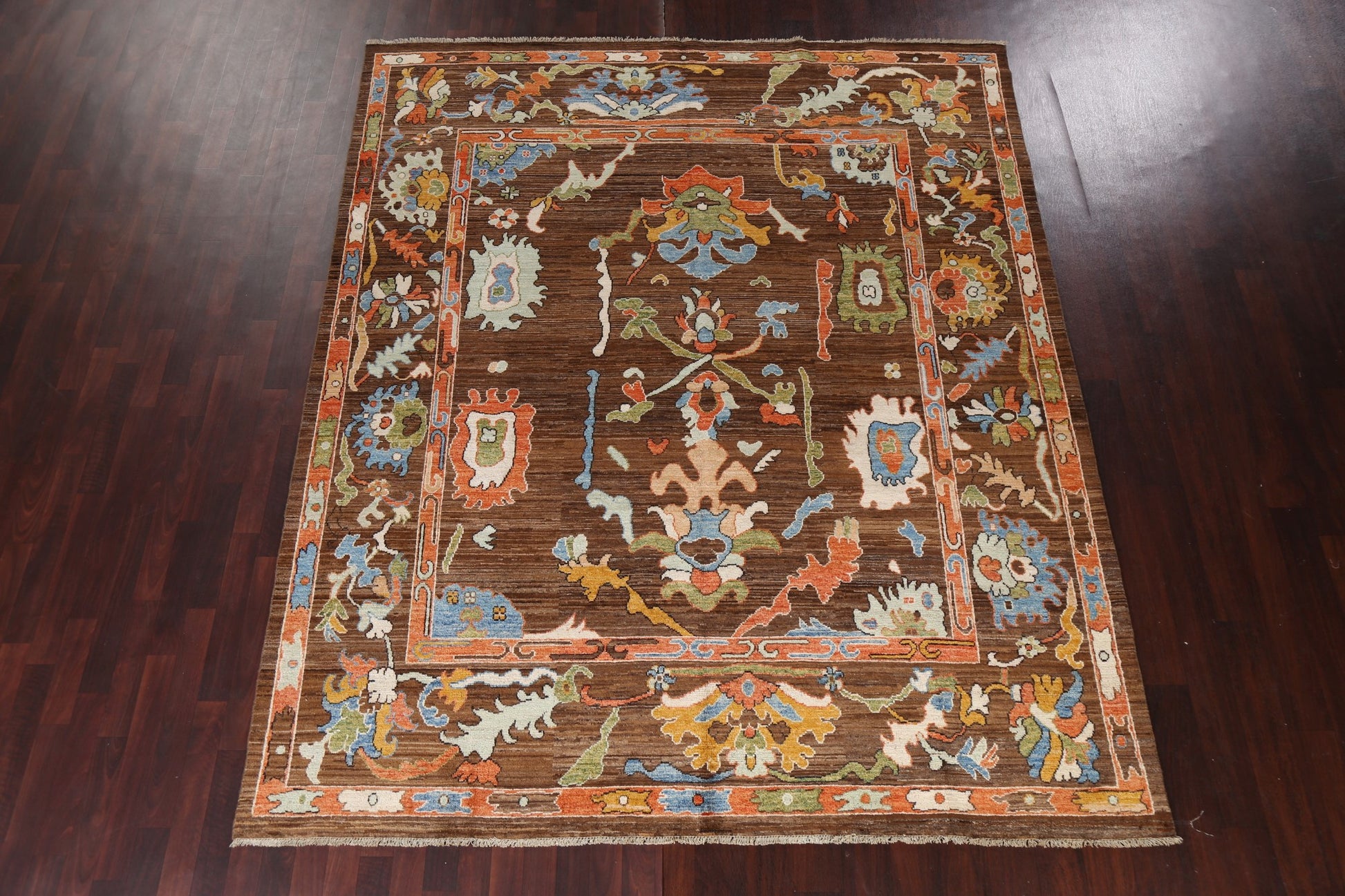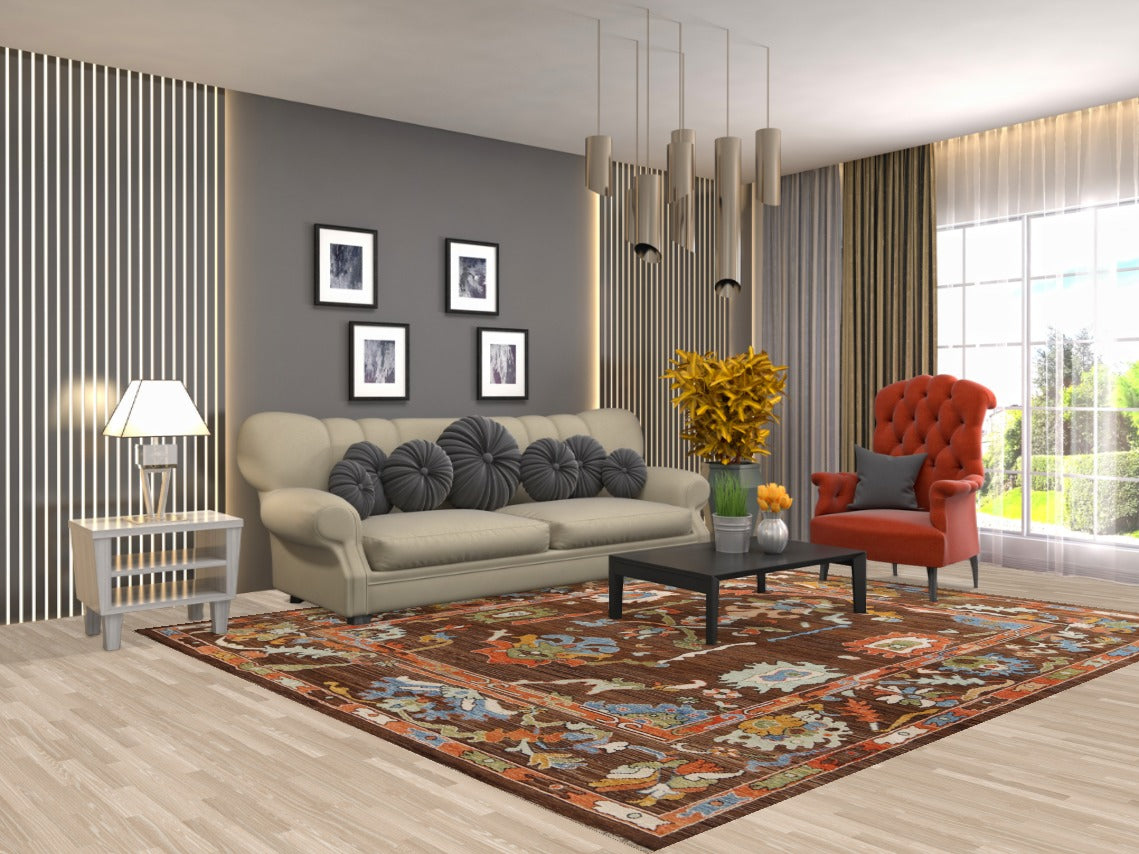 A Beautiful Genuine Pakistan Ziegler rug is Hand Knotted by skillful weavers in Pakistan with 100% Wool Material. This rug is in New, First Quality condition. dimensions are 9' 7'' X 8' 0'' in foot and 292 X 244 in centimeter. the primary color is Brown.