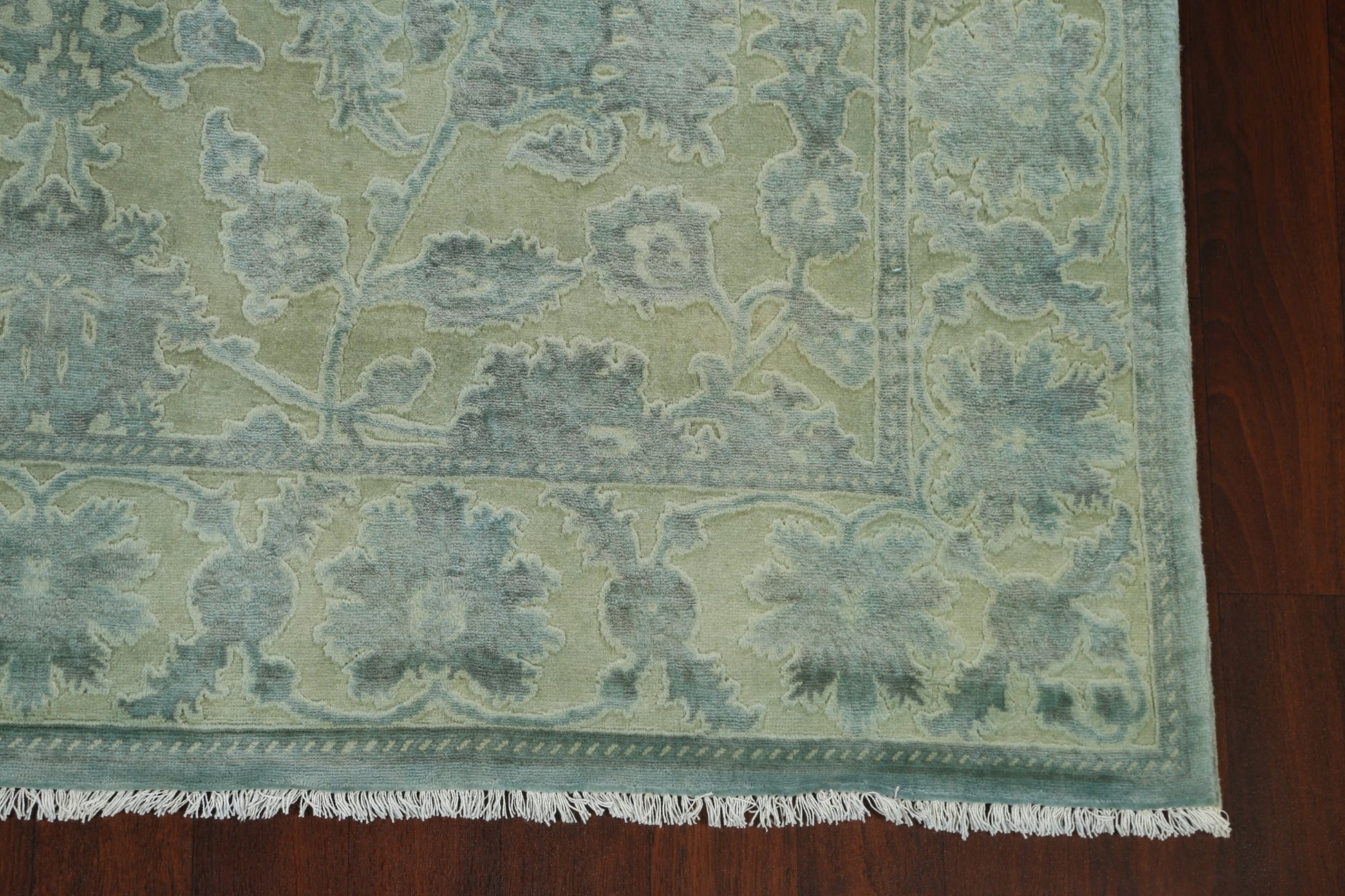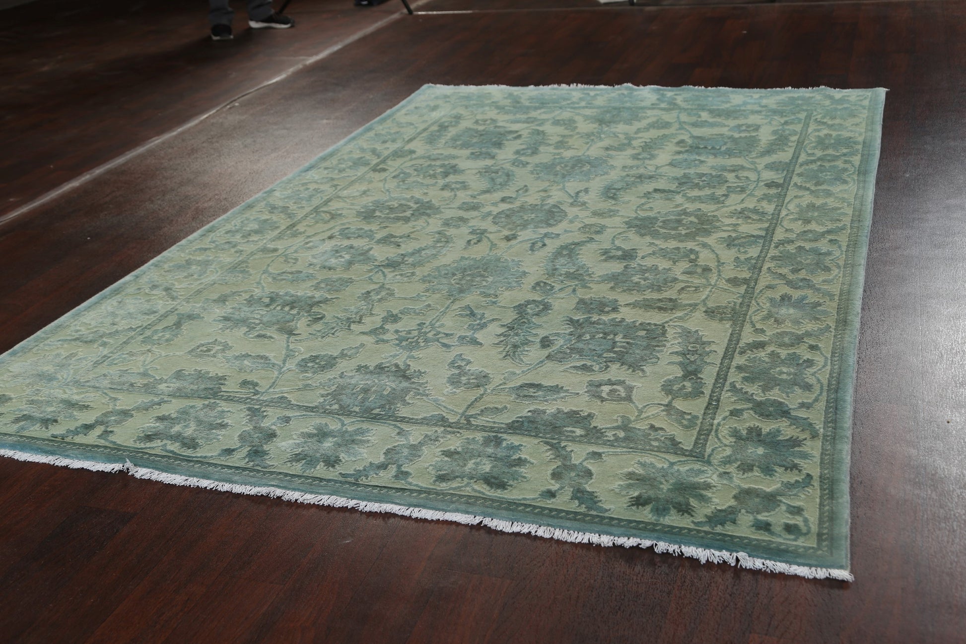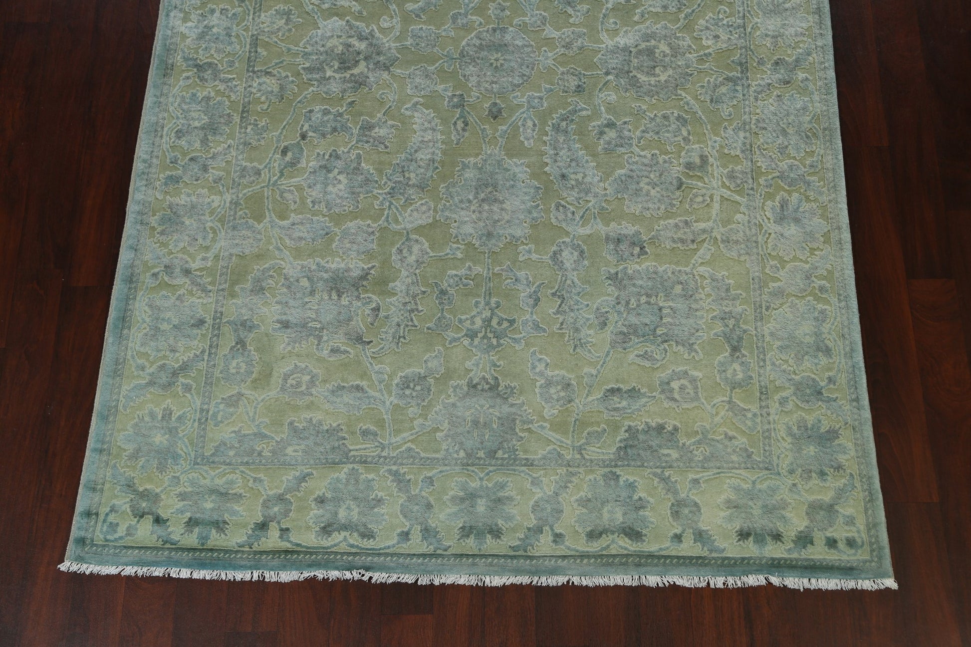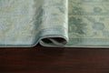 A Beautiful Genuine Pakistan Oushak-Chobi rug is Hand Knotted by skillful weavers in Pakistan with Manchester Wool Material. This rug is in New, First Quality condition. dimensions are 9' 10'' X 6' 5'' in foot and 300 X 196 in centimeter. the primary color is Green.