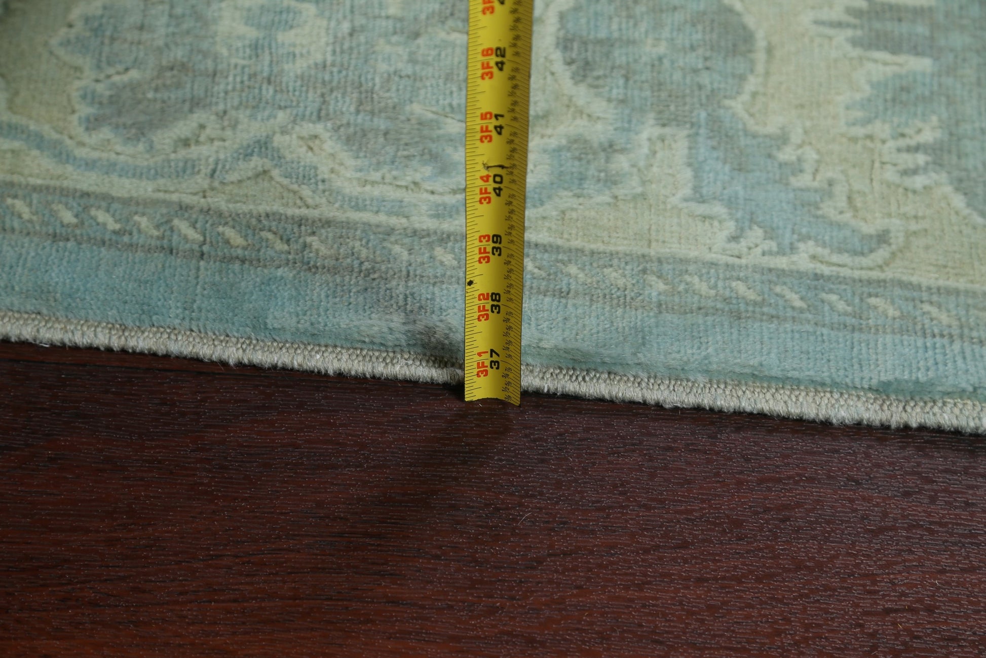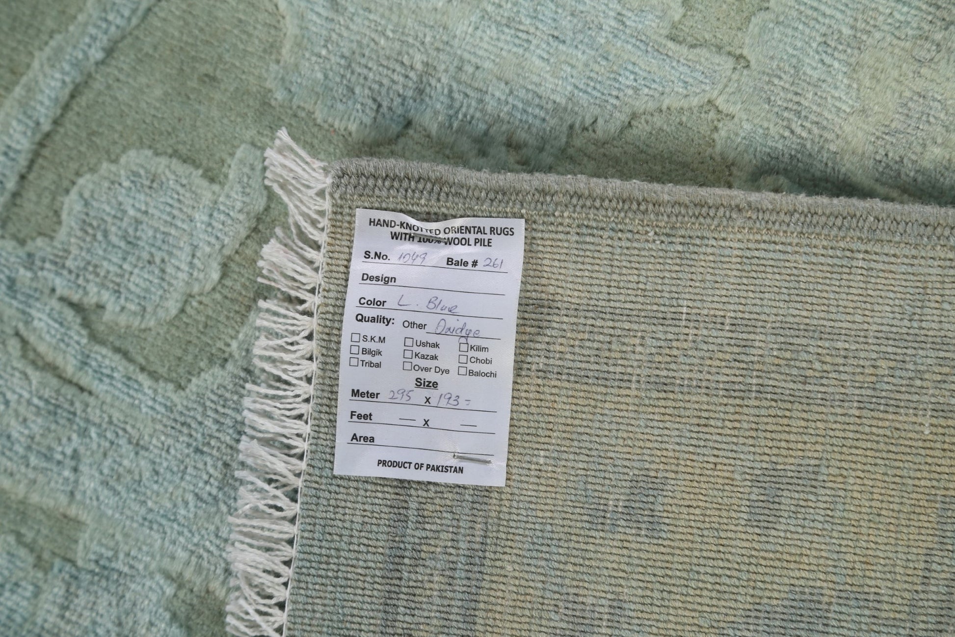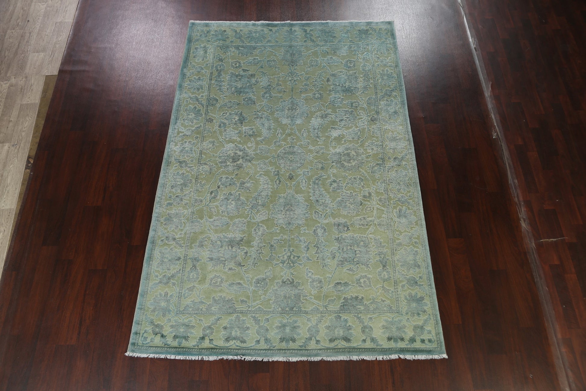 A Beautiful Genuine Pakistan Oushak-Chobi rug is Hand Knotted by skillful weavers in Pakistan with Manchester Wool Material. This rug is in New, First Quality condition. dimensions are 9' 10'' X 6' 5'' in foot and 300 X 196 in centimeter. the primary color is Green.