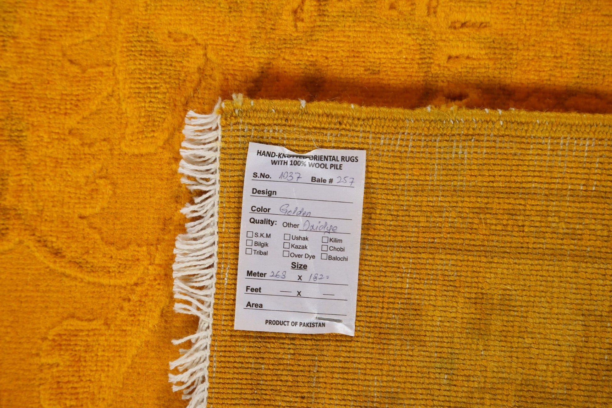 A Beautiful Genuine Pakistan Chobi-Peshawar rug is Hand Knotted by skillful weavers in Pakistan with Manchester Wool Material. This rug is in New, First Quality condition. dimensions are 8' 11'' X 6' 1'' in foot and 272 X 185 in centimeter. the primary color is Yellow & Gold.