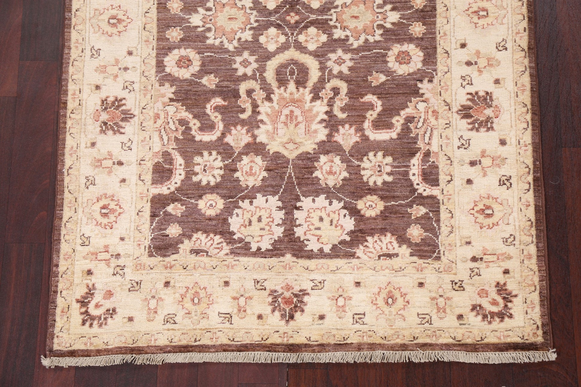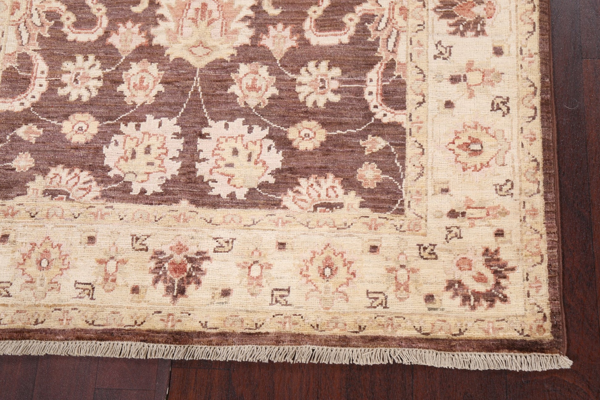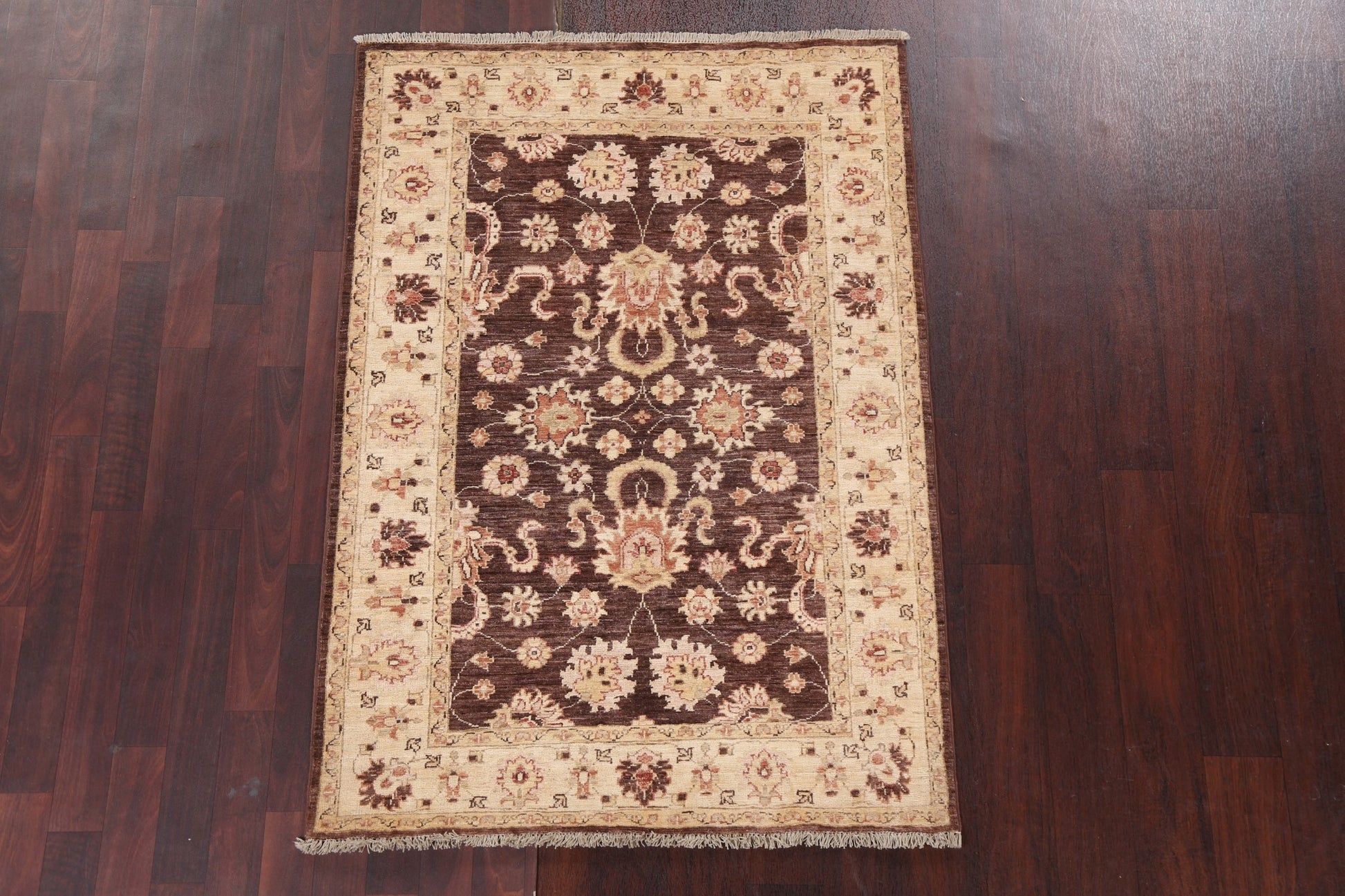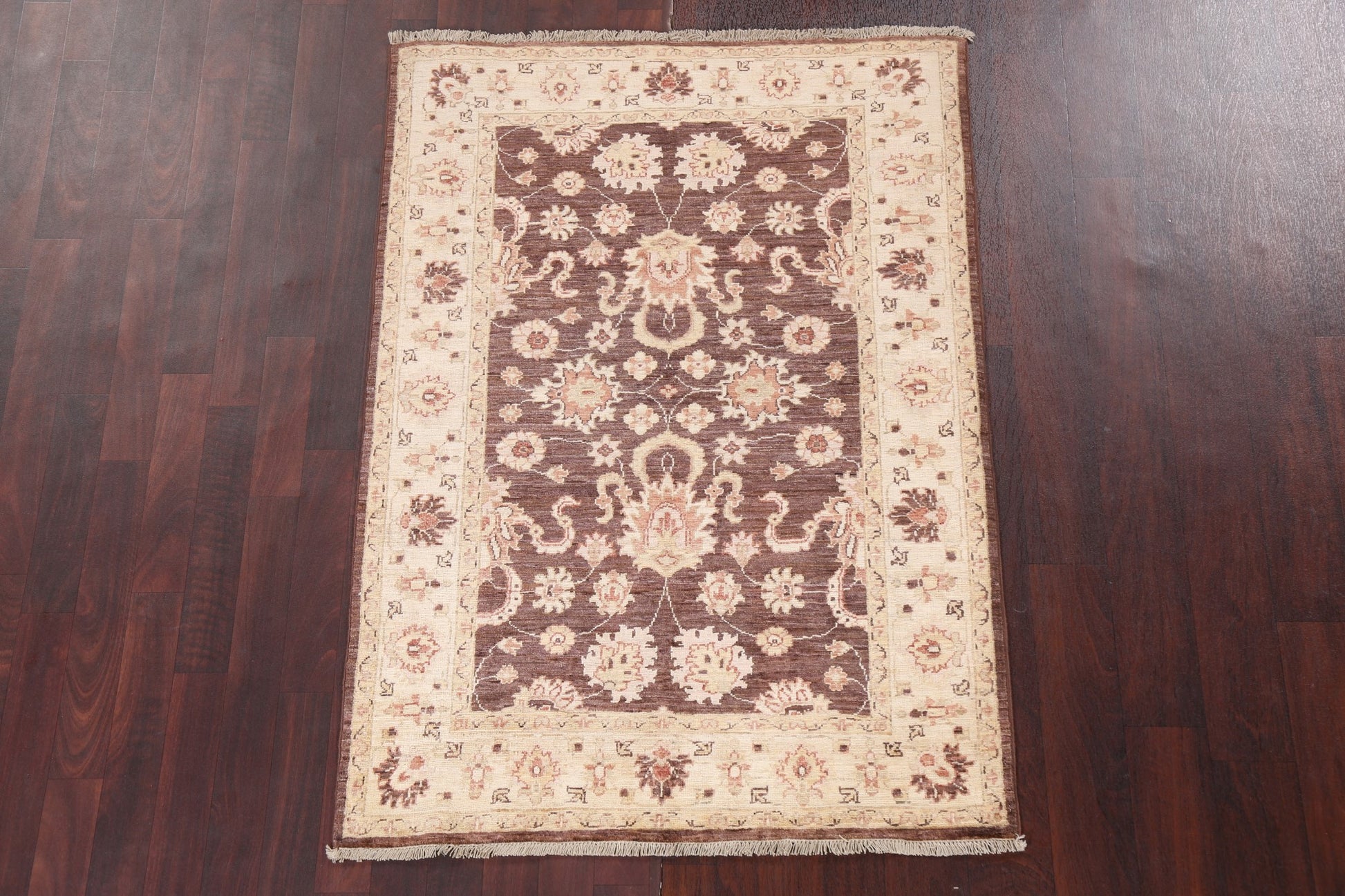 A Beautiful Genuine Pakistan Chobi-Peshawar rug is Hand Knotted by skillful weavers in Pakistan with 100% Wool Material. This rug is in New, First Quality condition. dimensions are 4' 10'' X 3' 5'' in foot and 147 X 104 in centimeter. the primary color is Brown.