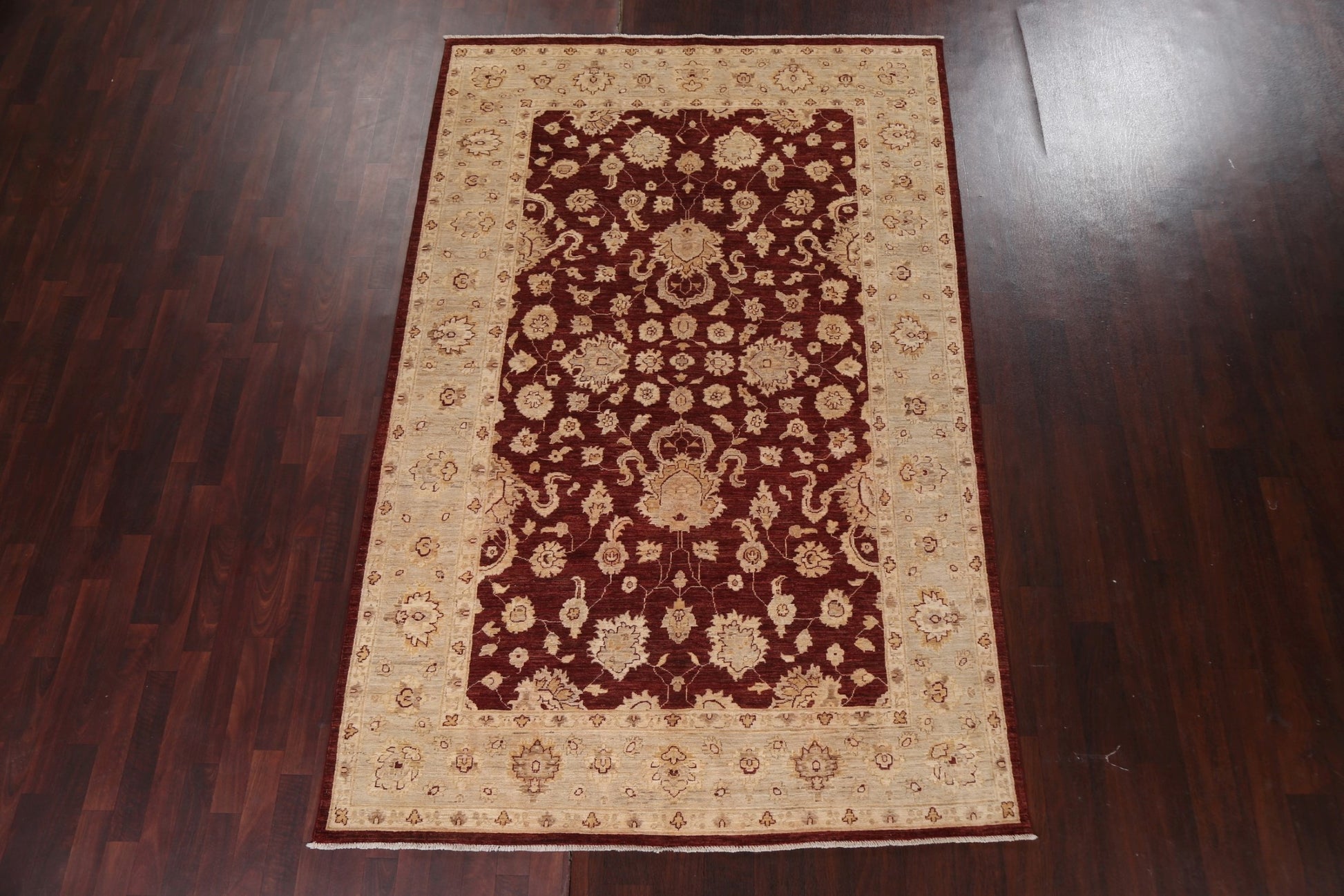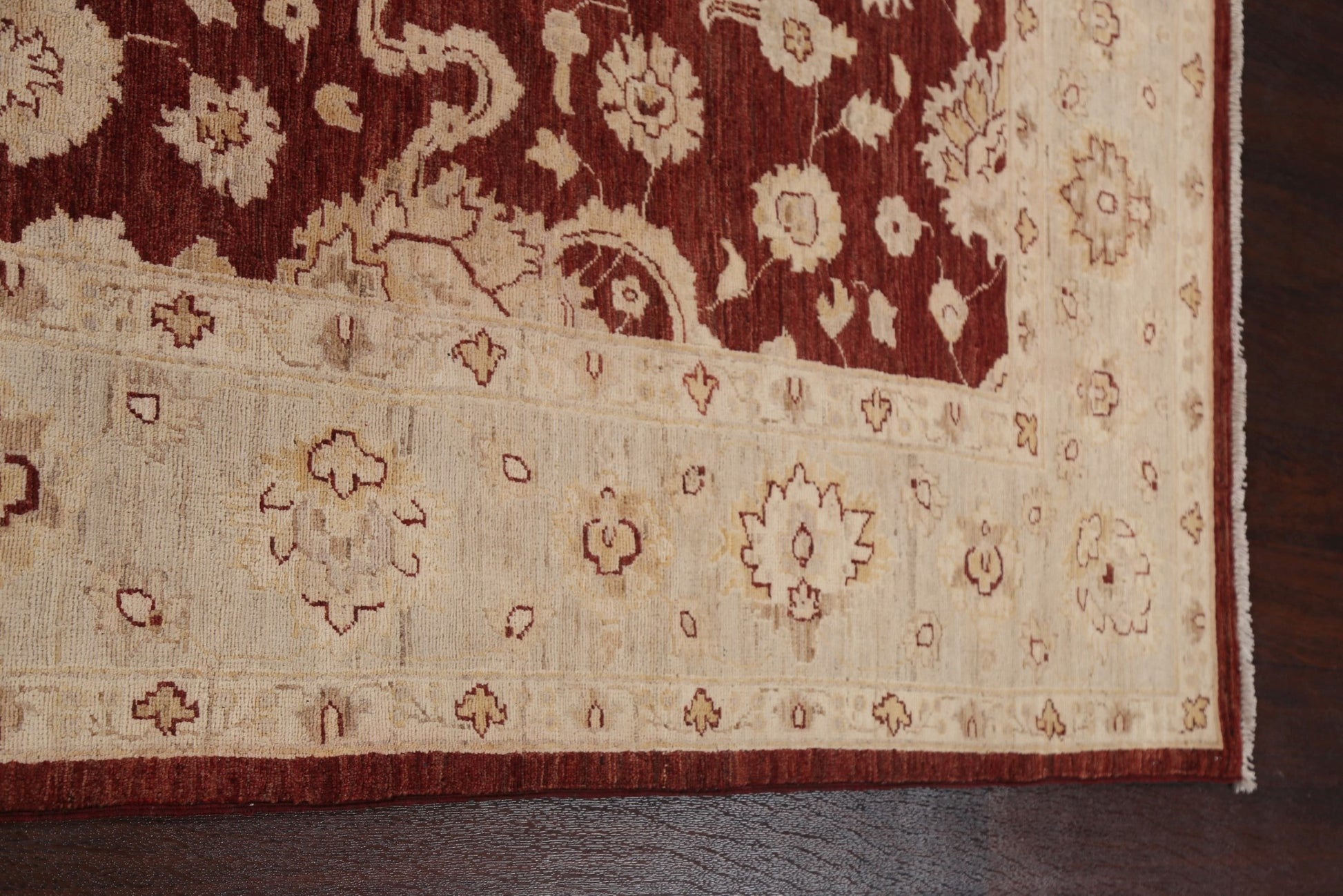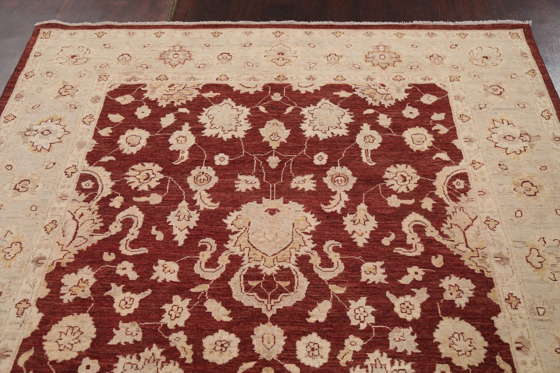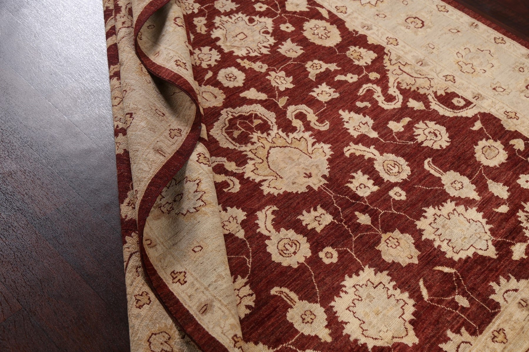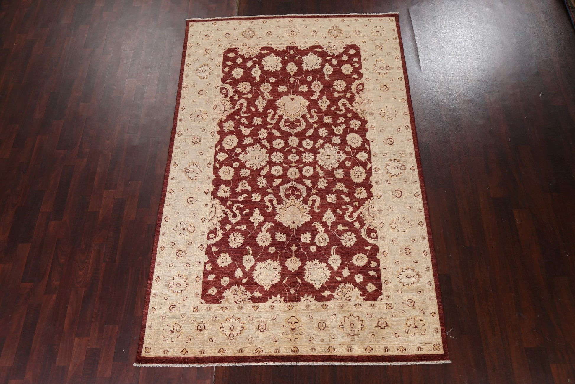 A Beautiful Genuine Pakistan Chobi-Peshawar rug is Hand Knotted by skillful weavers in Pakistan with 100% Wool Material. This rug is in New, First Quality condition. dimensions are 9' 3'' X 5' 11'' in foot and 282 X 180 in centimeter. the primary color is Red.