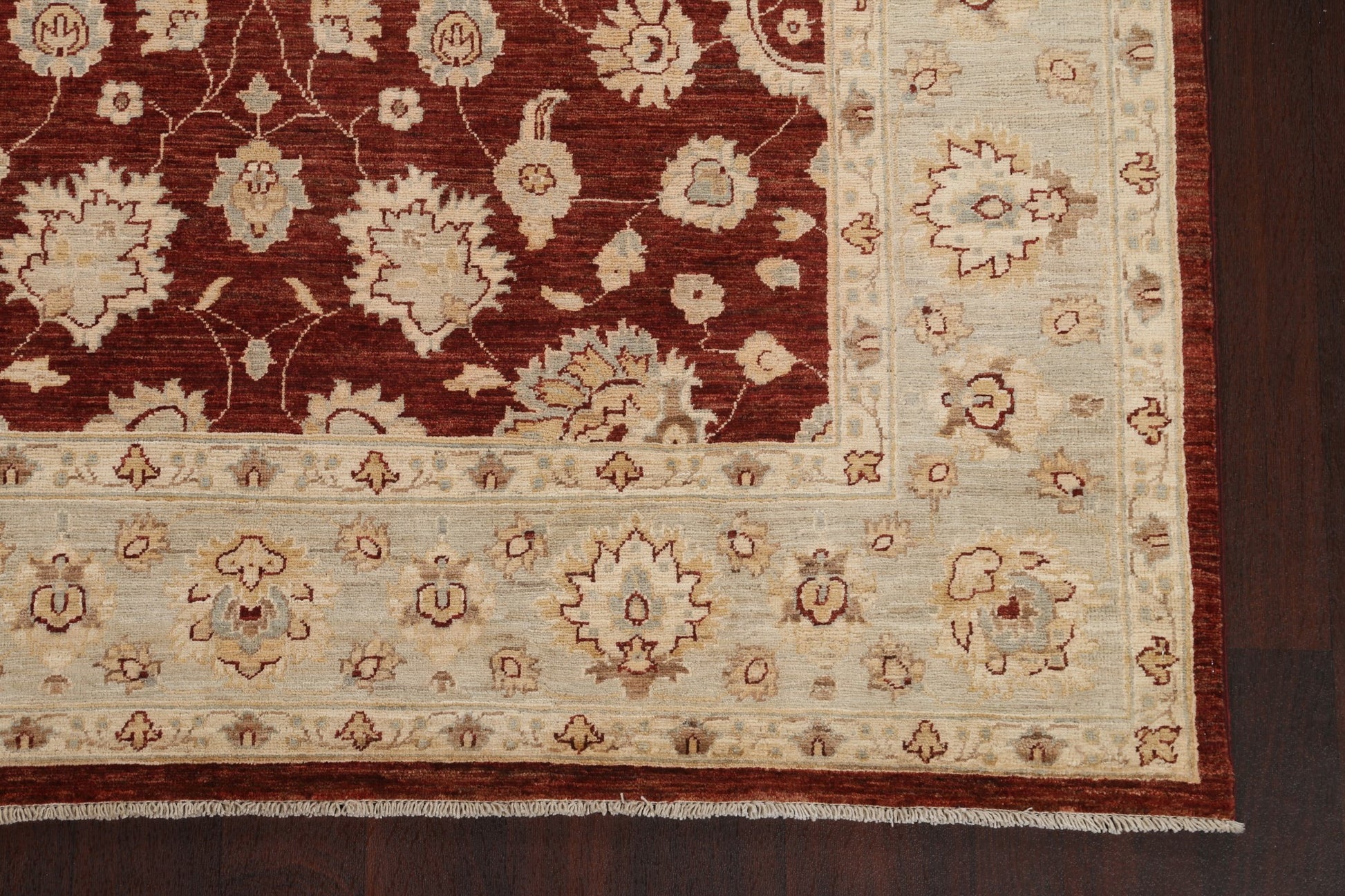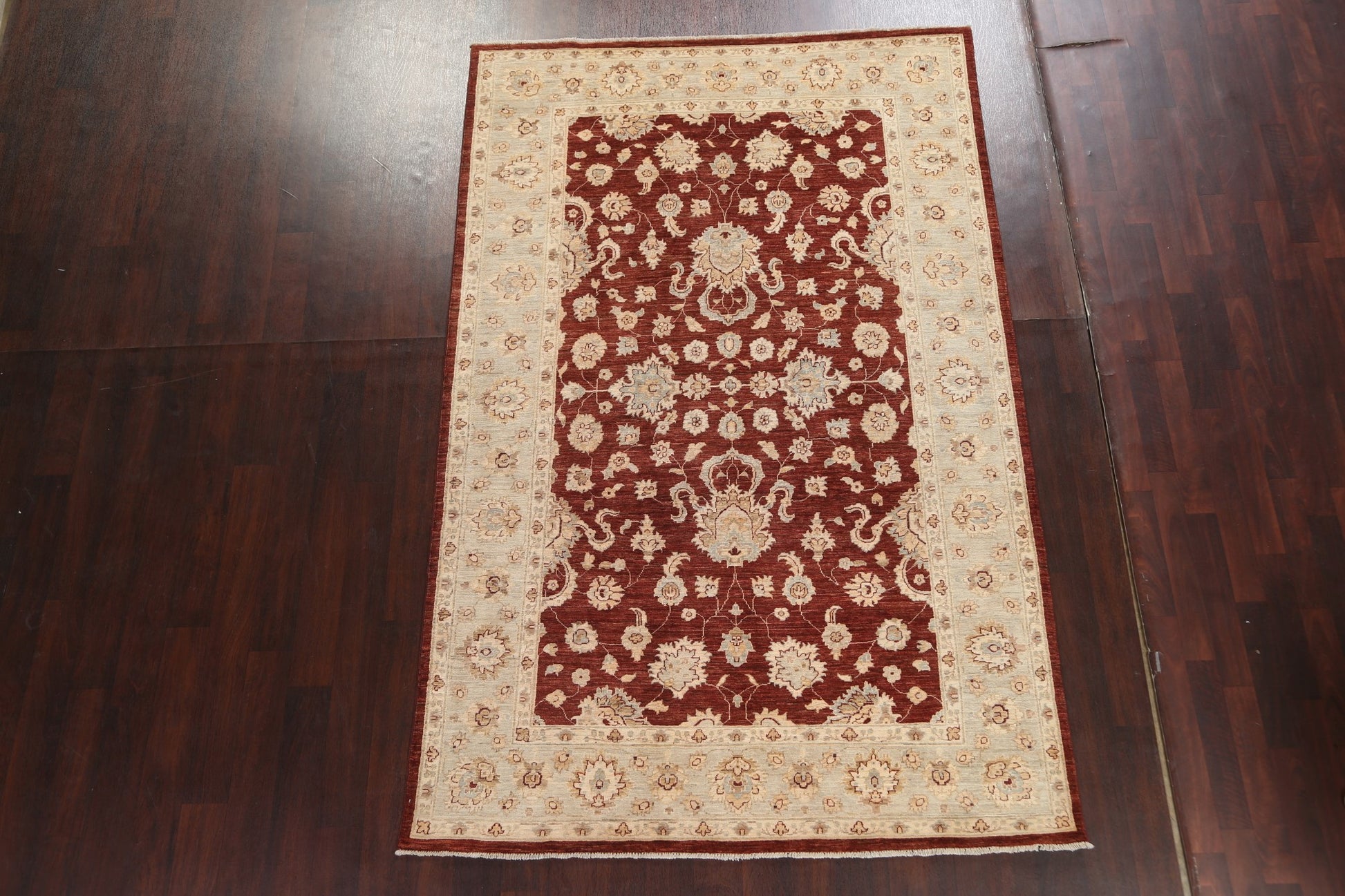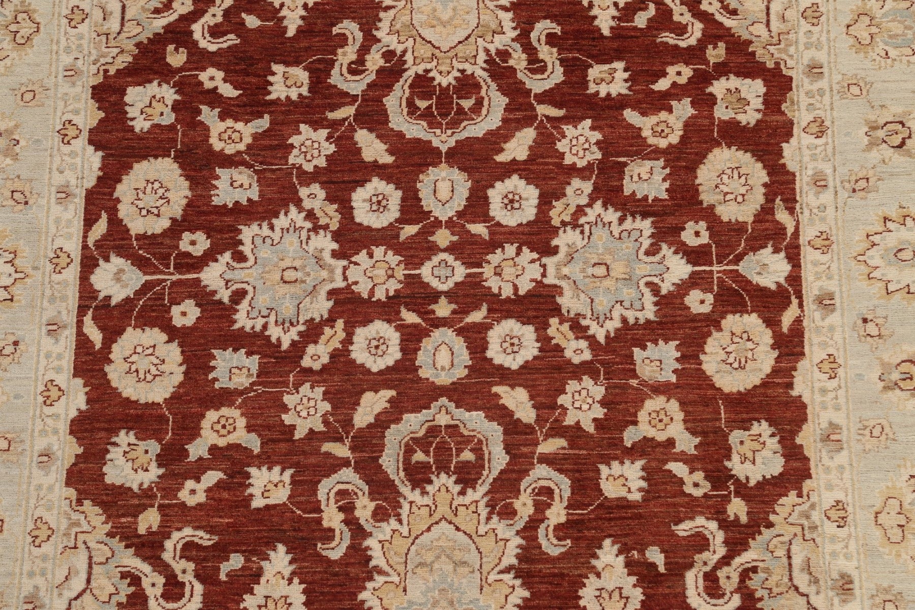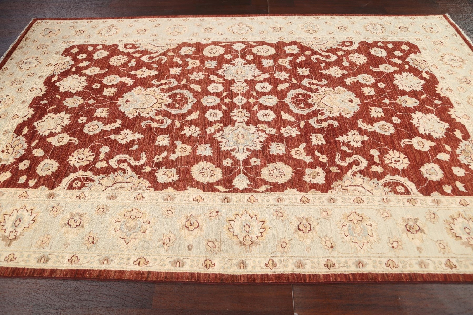 A Beautiful Genuine Pakistan Chobi-Peshawar rug is Hand Knotted by skillful weavers in Pakistan with 100% Wool Material. This rug is in New, First Quality condition. dimensions are 9' 0'' X 5' 9'' in foot and 274 X 175 in centimeter. the primary color is Red.