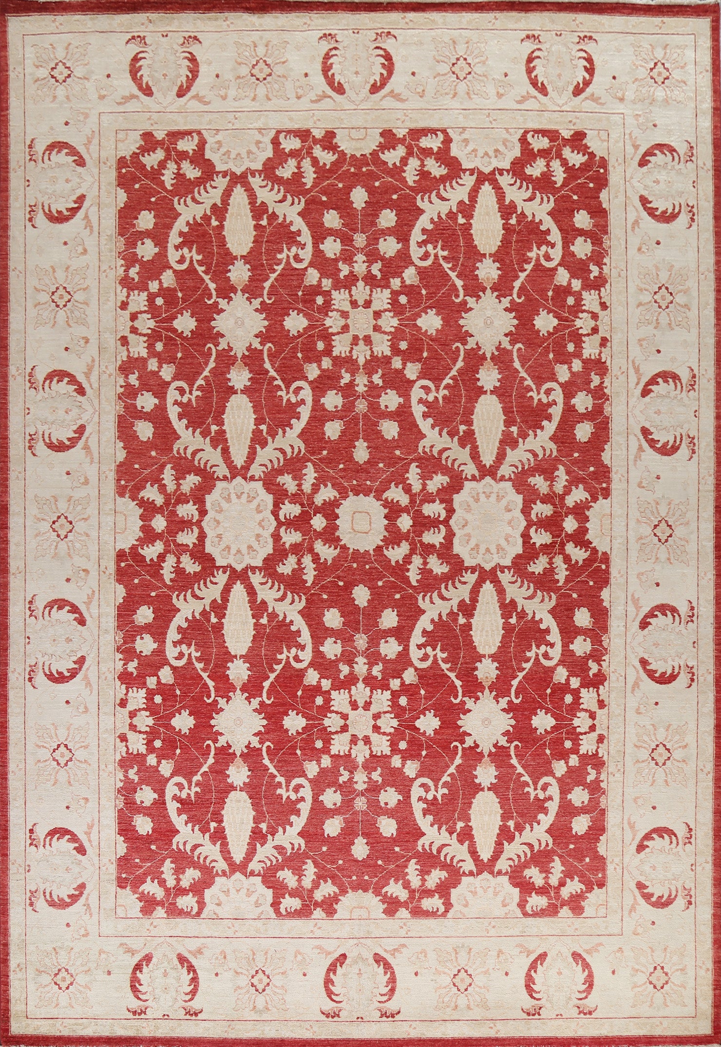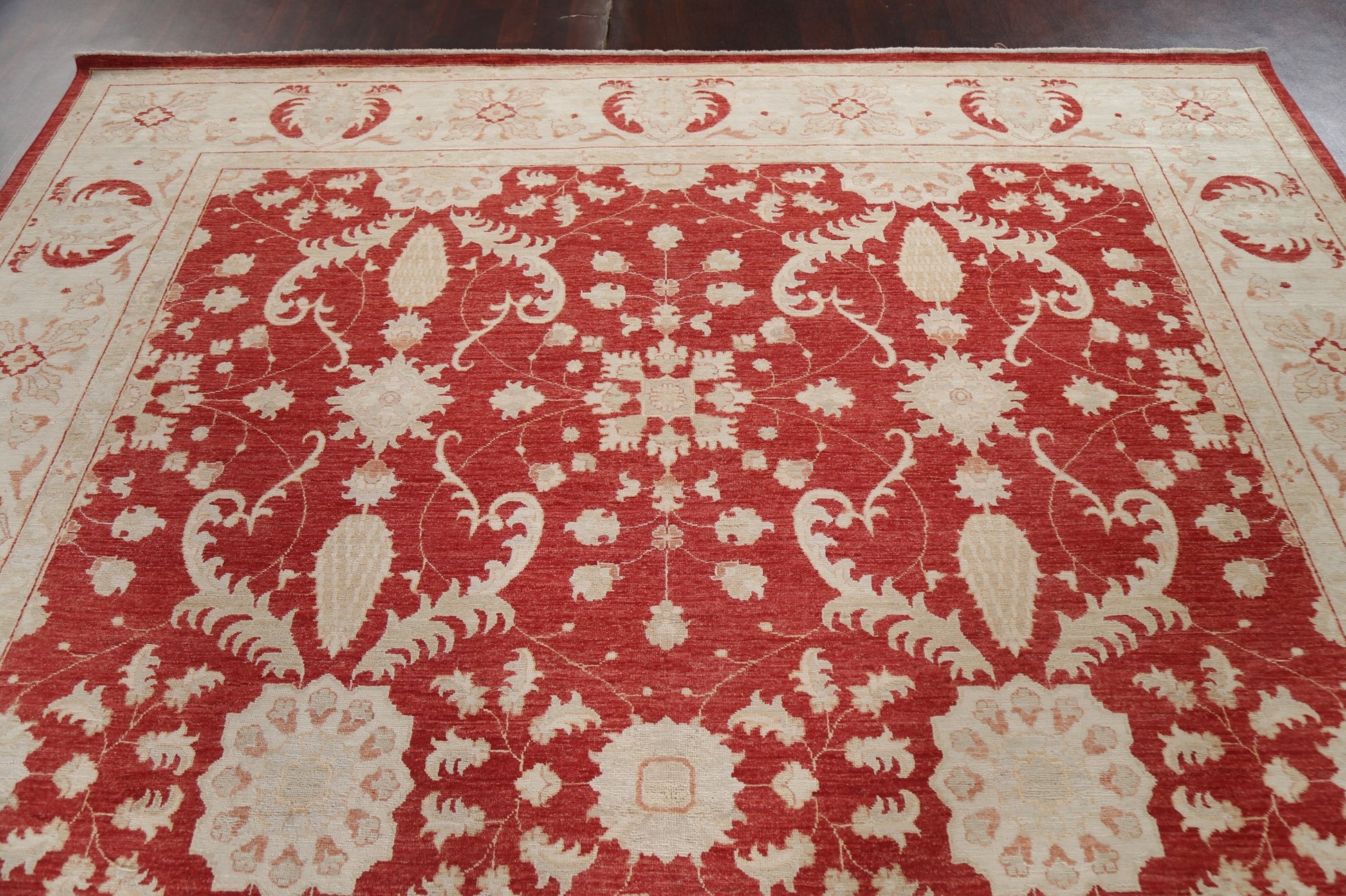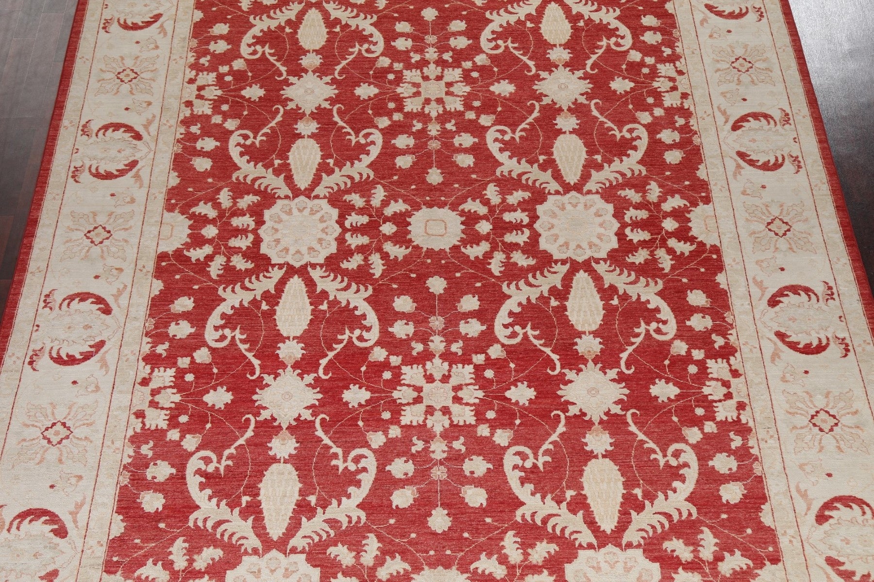 A Beautiful Genuine Pakistan Chobi-Peshawar rug is Hand Knotted by skillful weavers in Pakistan with 100% Wool Material. This rug is in New, First Quality condition. dimensions are 11' 2'' X 9' 1'' in foot and 340 X 277 in centimeter. the primary color is Red.