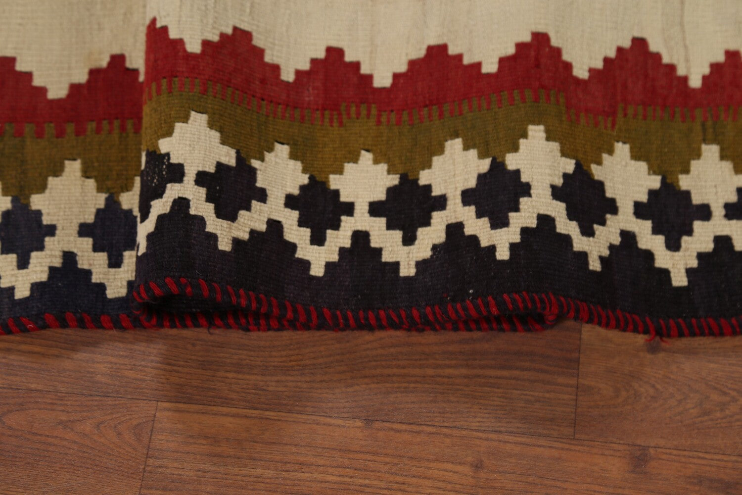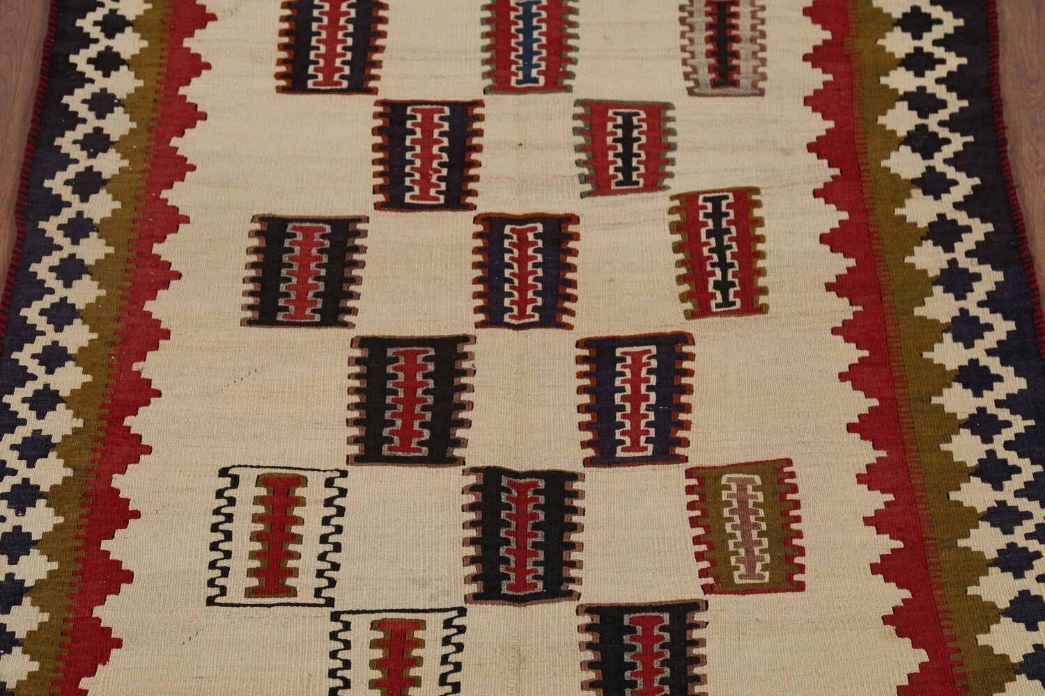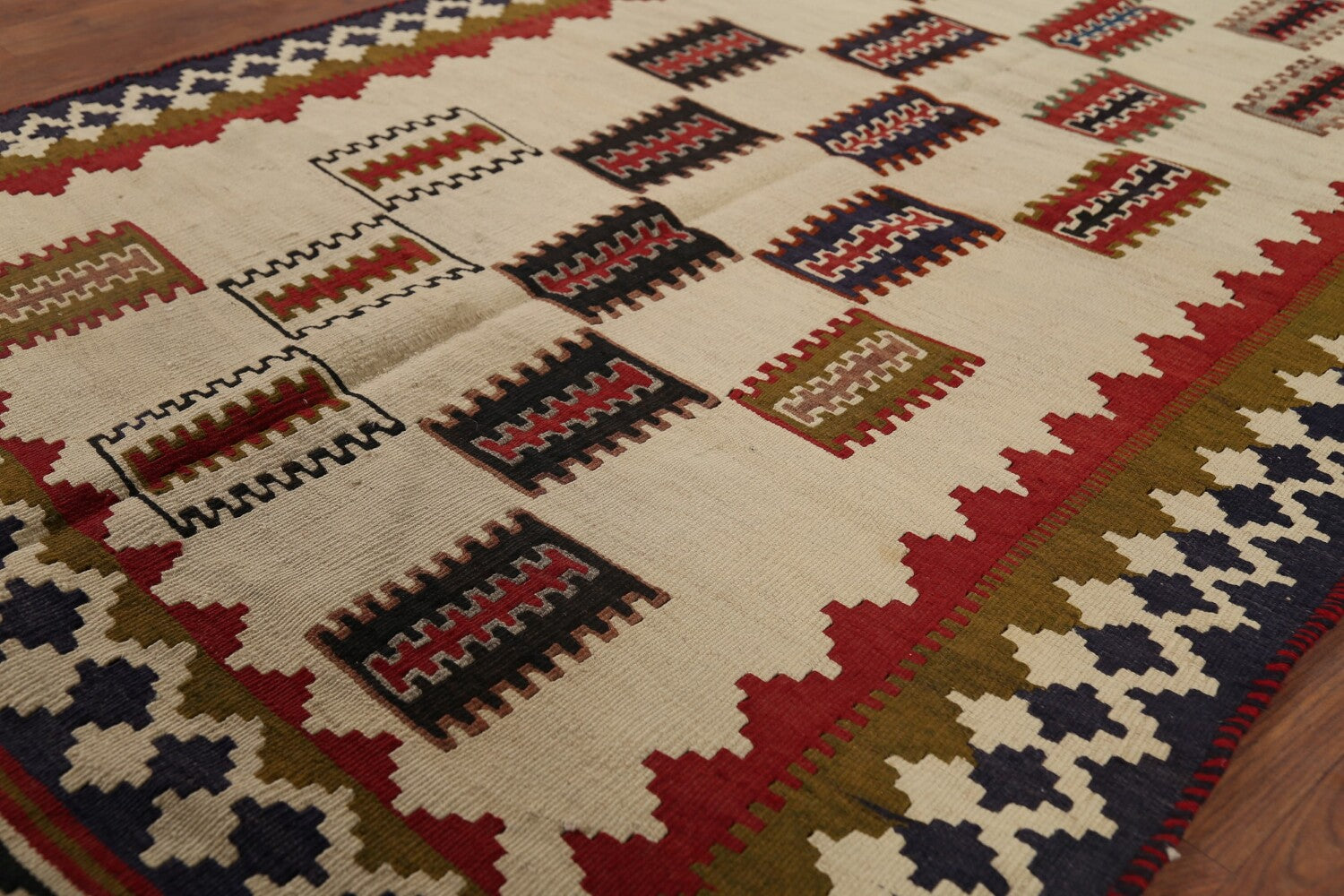 A Beautiful Genuine Persia ( Persia ) Kilim (Qashqai) rug is Hand Woven by skillful weavers in Persia ( Persia ) with 100% Wool Material. This rug is in Very Good condition. dimensions are 6' 11'' X 3' 6'' in foot and 211 X 107 in centimeter. the primary color is Beige & Ivories.