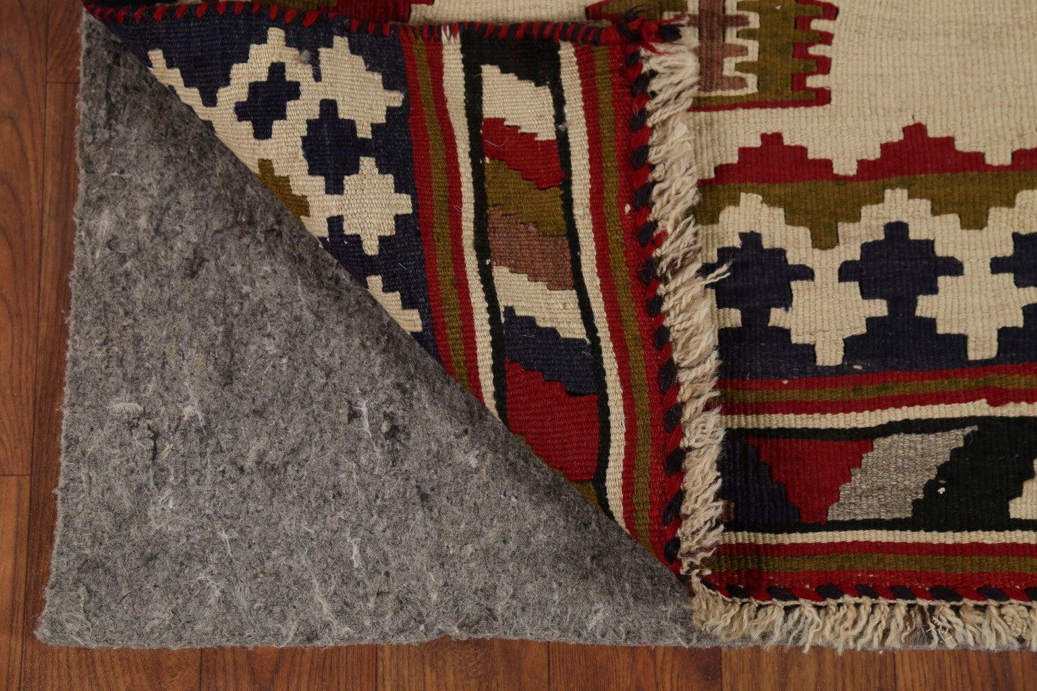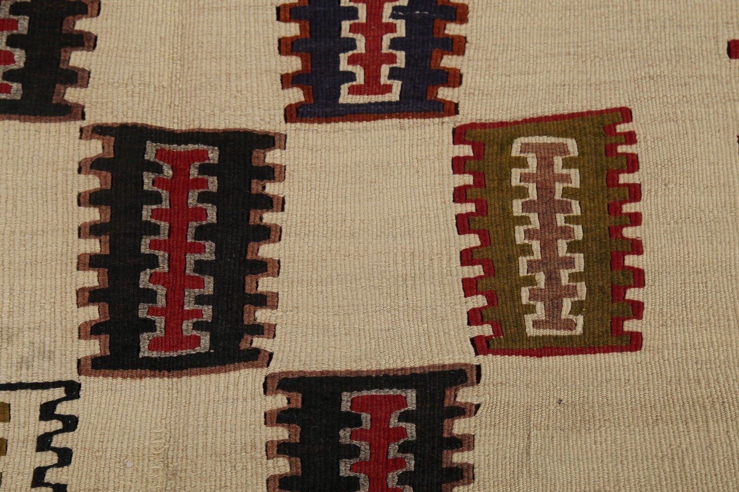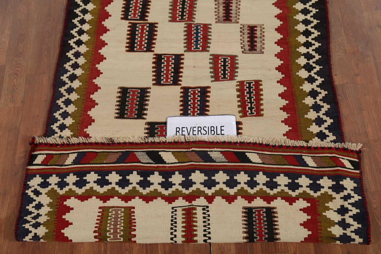 A Beautiful Genuine Persia ( Persia ) Kilim (Qashqai) rug is Hand Woven by skillful weavers in Persia ( Persia ) with 100% Wool Material. This rug is in Very Good condition. dimensions are 6' 11'' X 3' 6'' in foot and 211 X 107 in centimeter. the primary color is Beige & Ivories.