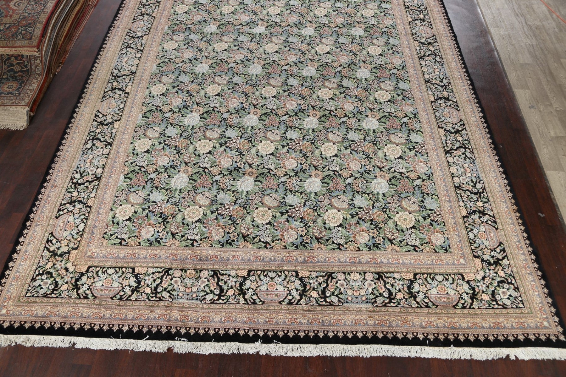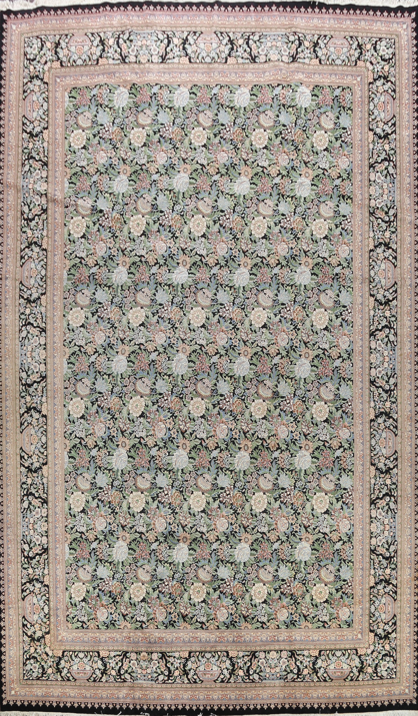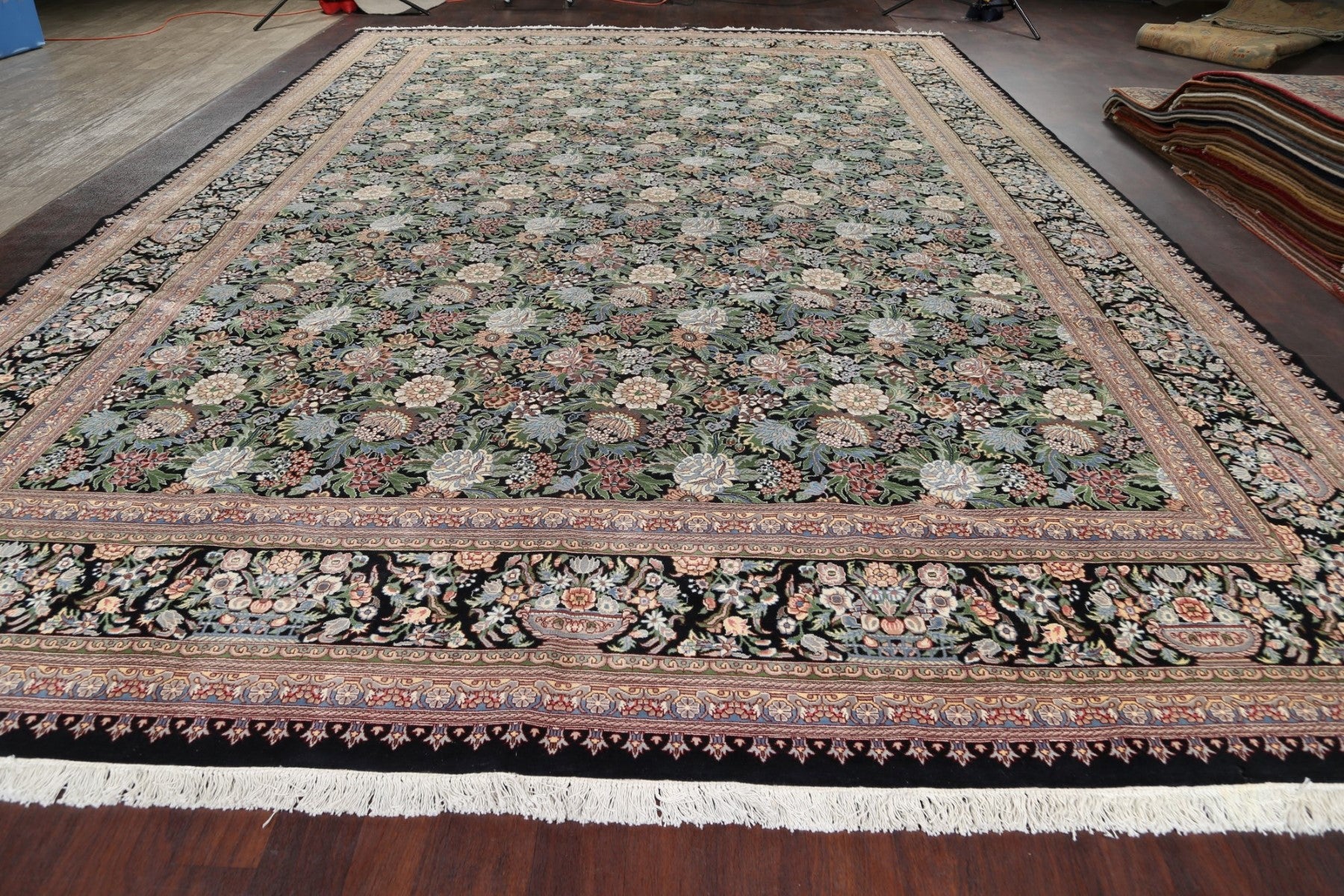 A Beautiful Genuine Pakistan Aubusson rug is Hand Knotted by skillful weavers in Pakistan with 100% Wool Material. This rug is in New, First Quality condition. dimensions are 17' 10'' X 12' 1'' in foot and 544 X 368 in centimeter. the primary color is Black.