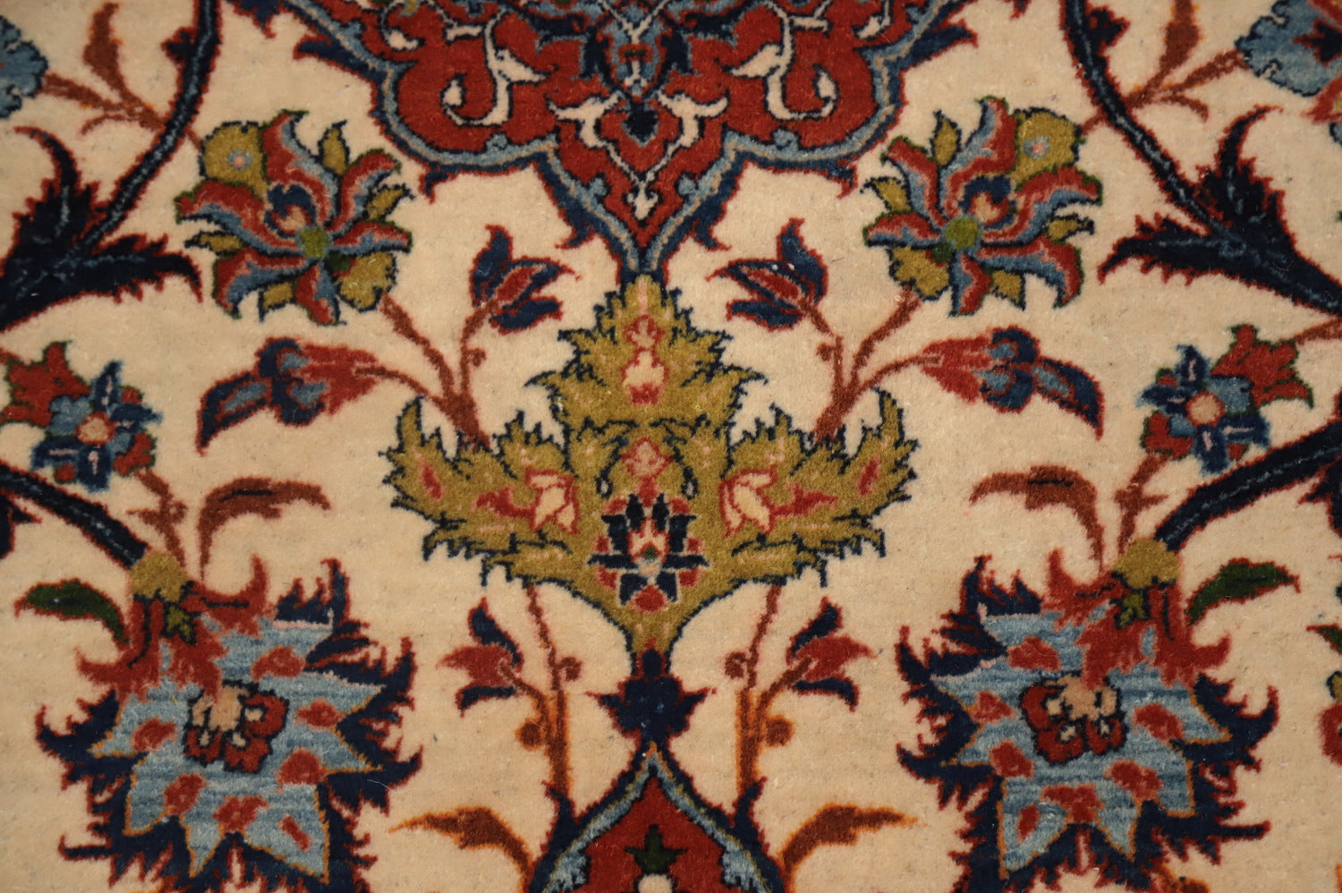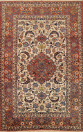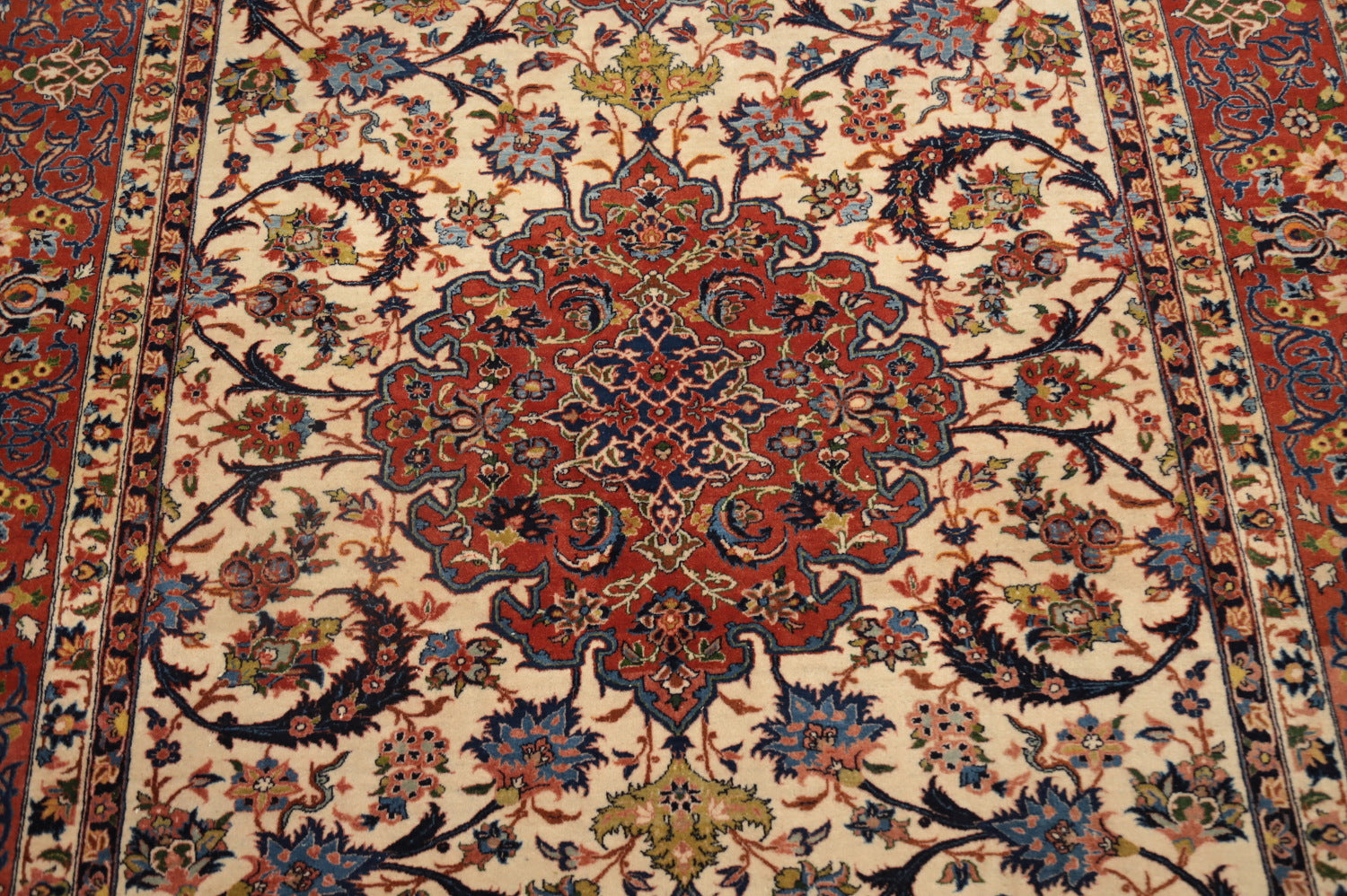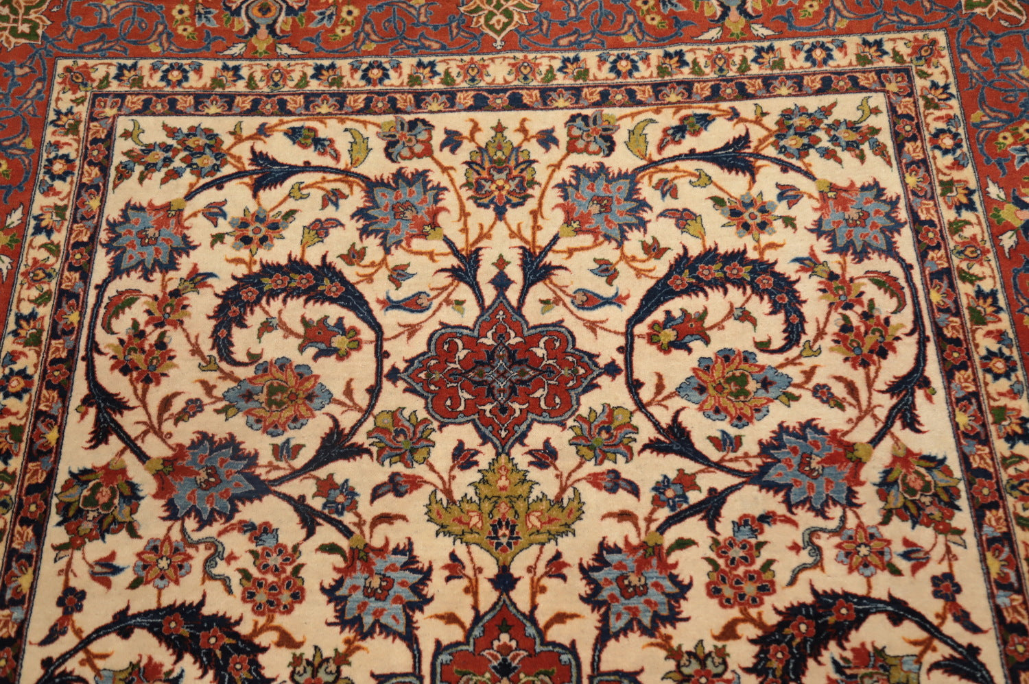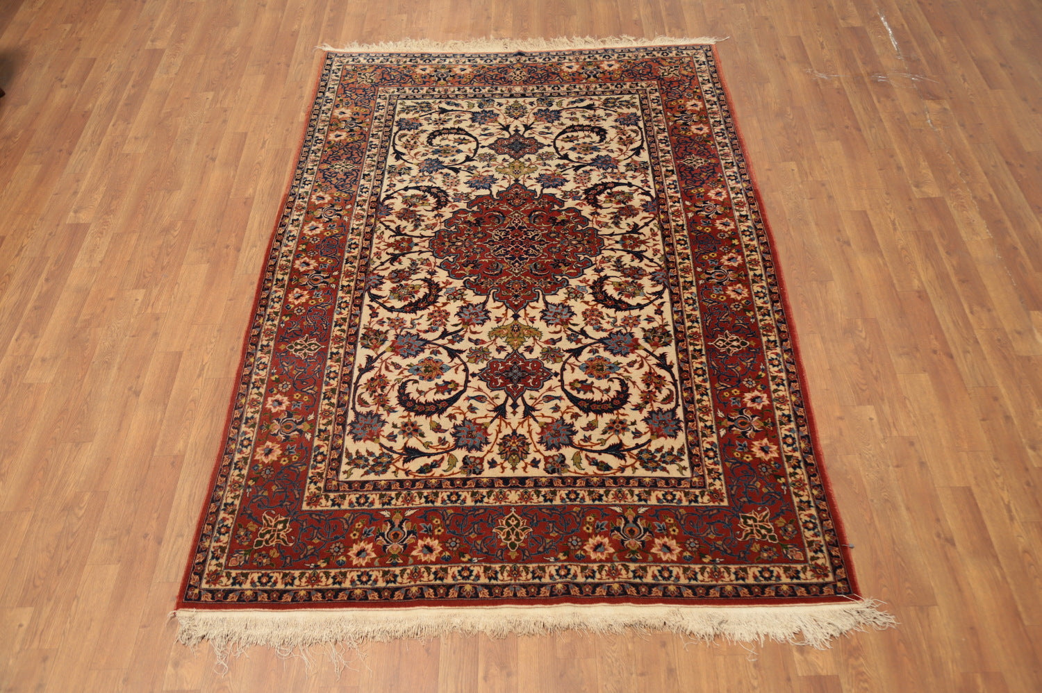 A Beautiful Genuine Persia ( Persia ) Isfahan rug is Hand Knotted by skillful weavers in Persia ( Persia ) with 100% Wool Material. This rug is in Very Good condition. dimensions are 7' 5'' X 5' 1'' in foot and 226 X 155 in centimeter. the primary color is Beige & Ivories.
