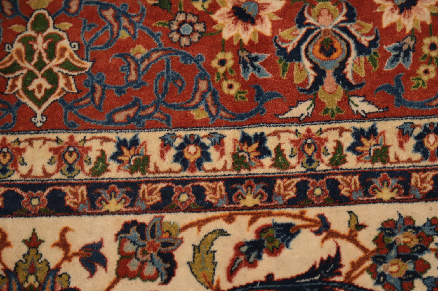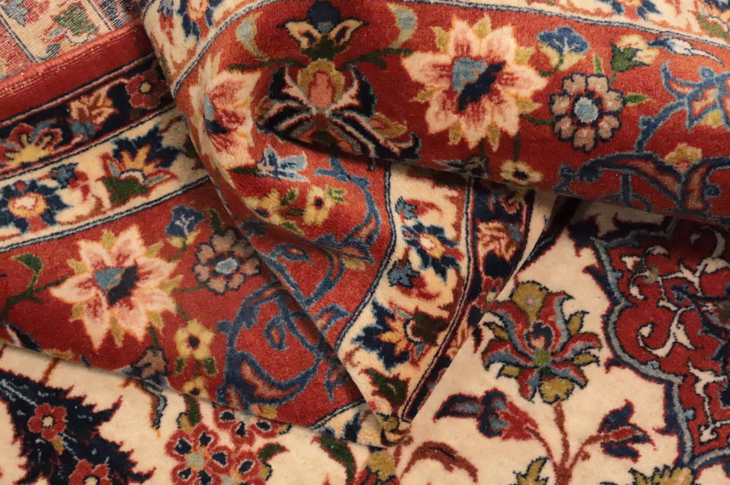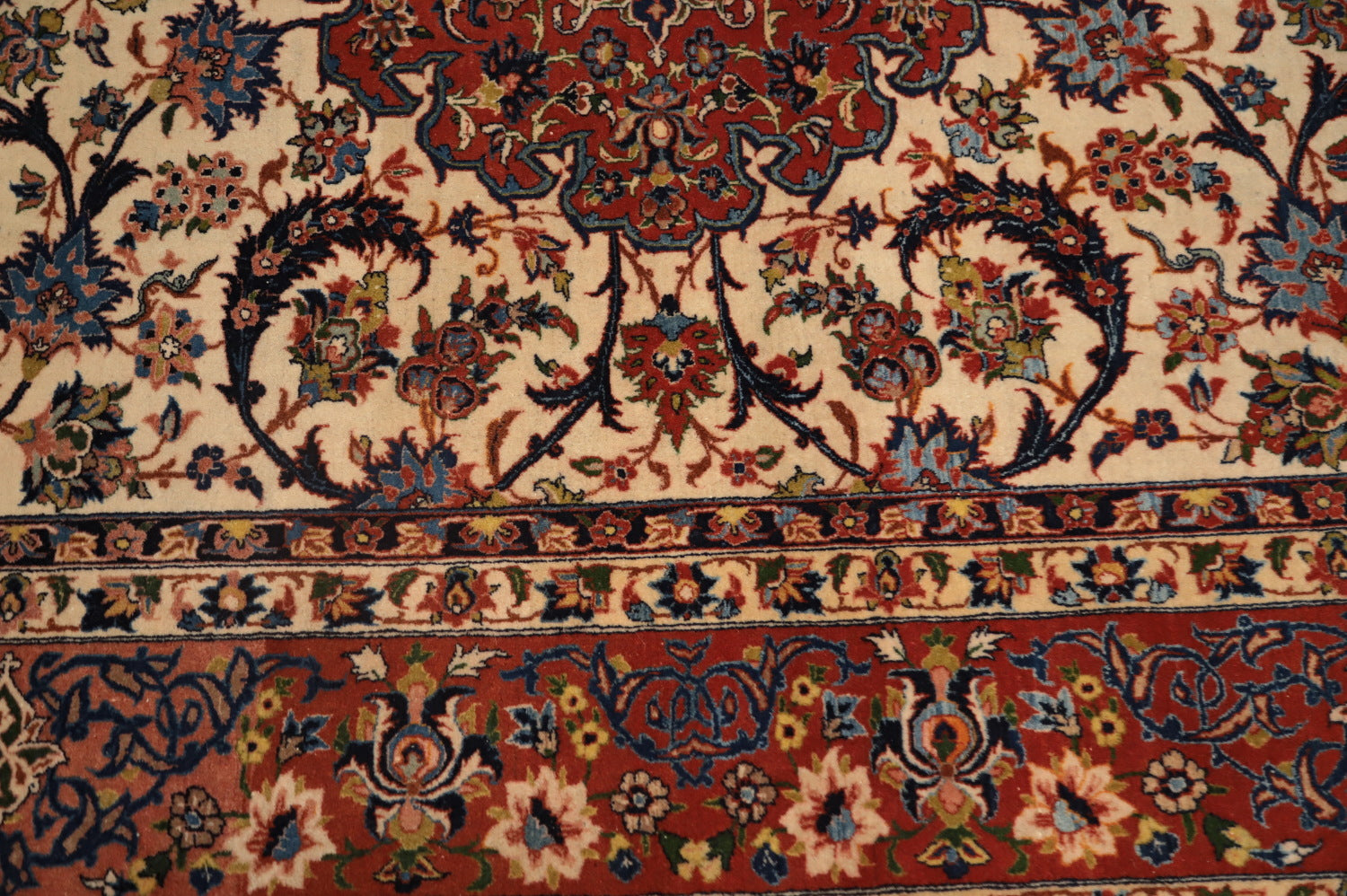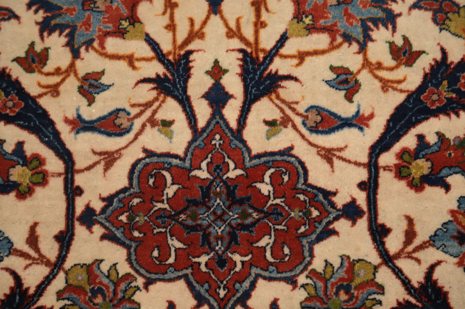 A Beautiful Genuine Persia ( Persia ) Isfahan rug is Hand Knotted by skillful weavers in Persia ( Persia ) with 100% Wool Material. This rug is in Very Good condition. dimensions are 7' 5'' X 5' 1'' in foot and 226 X 155 in centimeter. the primary color is Beige & Ivories.