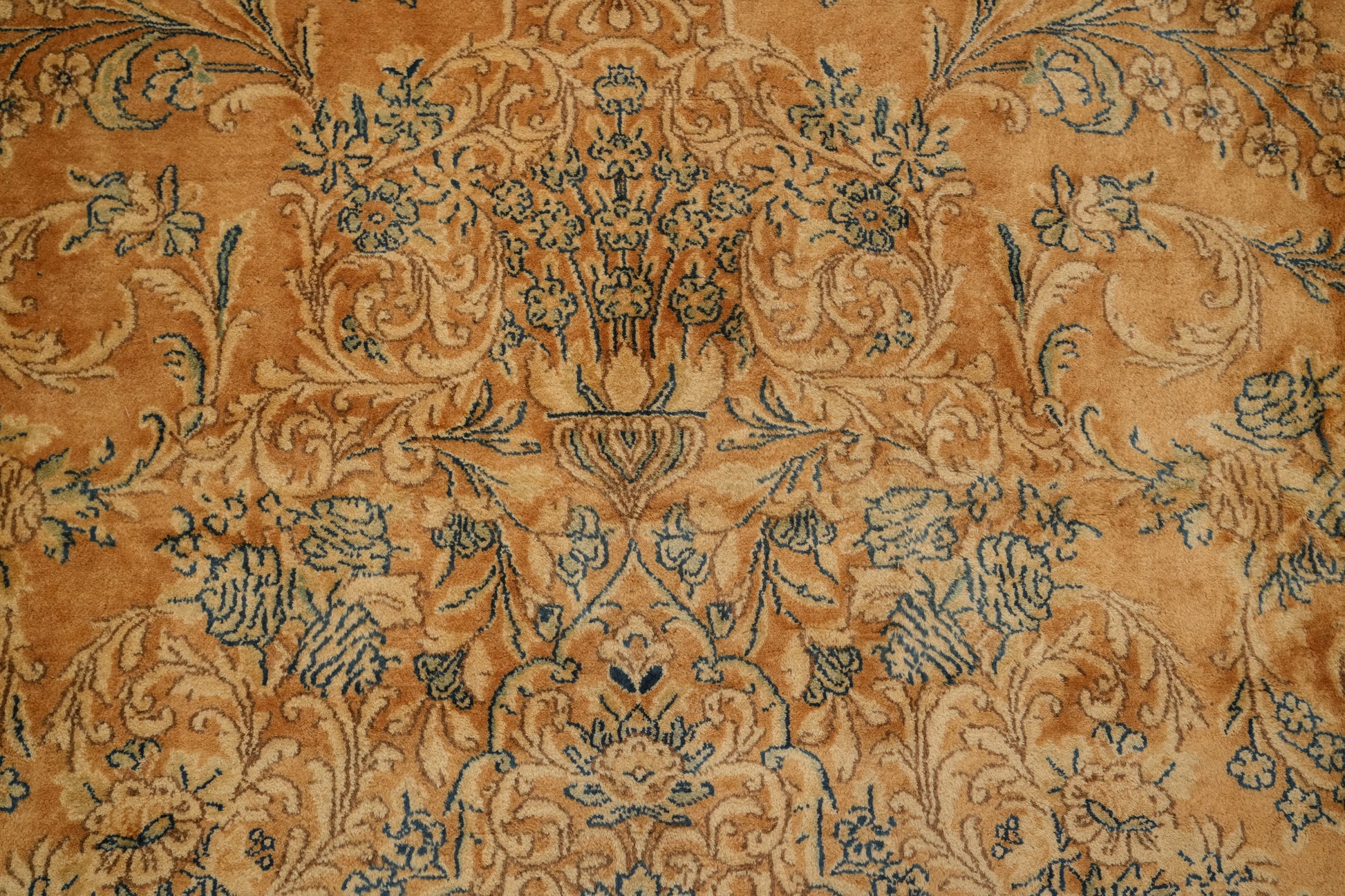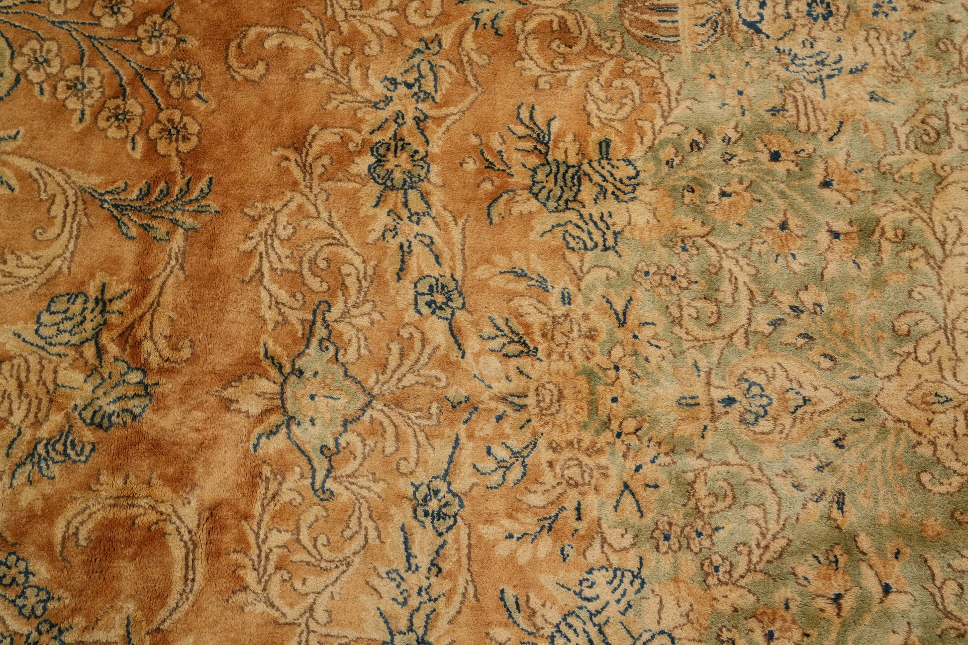 A Beautiful Genuine Persia ( Persia ) Kerman rug is Hand Knotted by skillful weavers in Persia ( Persia ) with 100% Wool Material. This rug is in Very Good condition. dimensions are 20' 2'' X 11' 5'' in foot and  615 X 348 in centimeter. the primary color is Oranges & Rust.