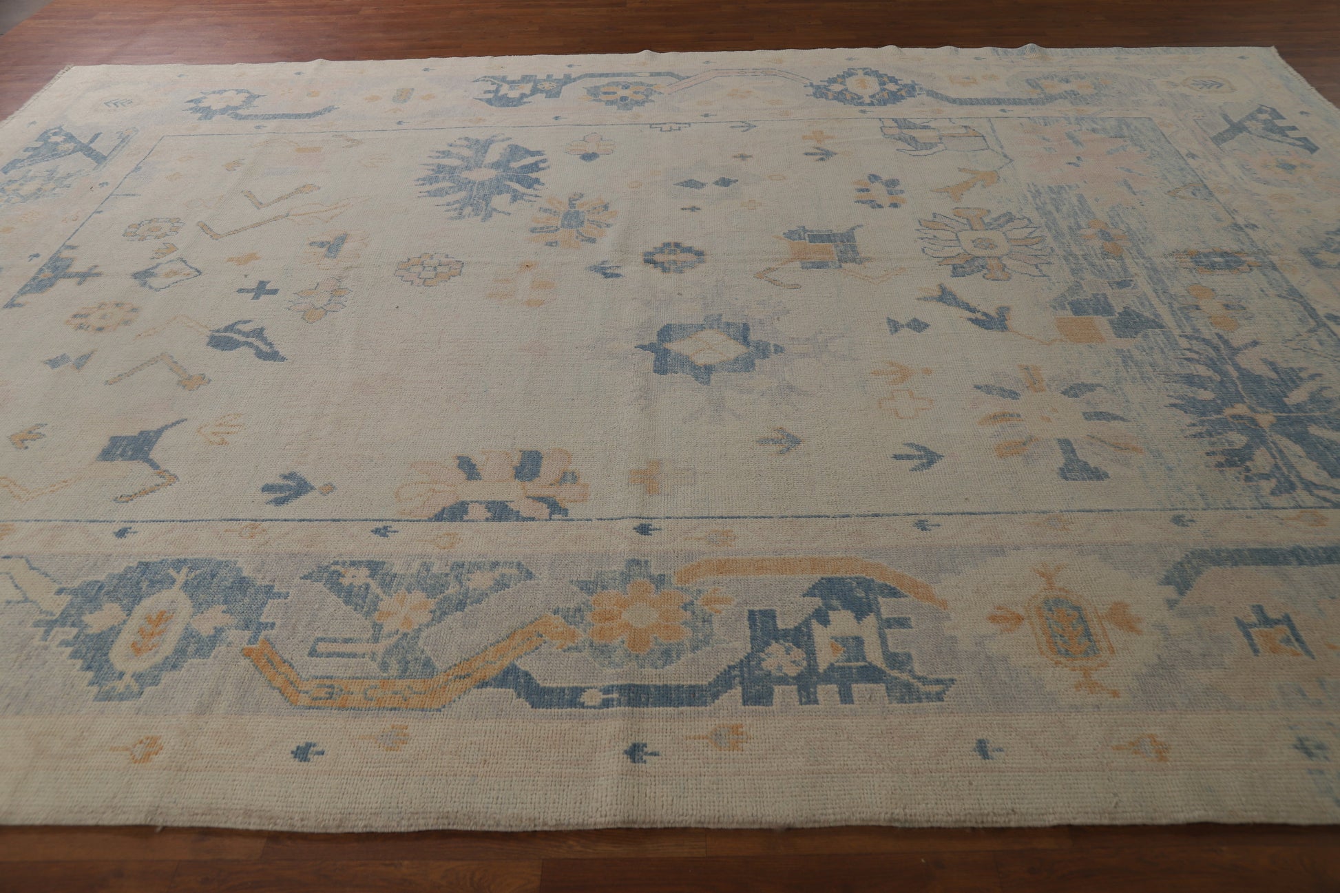 A Beautiful Genuine Turkey Oushak rug is Hand Knotted by skillful weavers in Turkey with 100% Wool Material. This rug is in New, First Quality condition. dimensions are 12' 8'' X 9' 6'' in foot and 386 X 290 in centimeter. the primary color is Beige & Ivories.