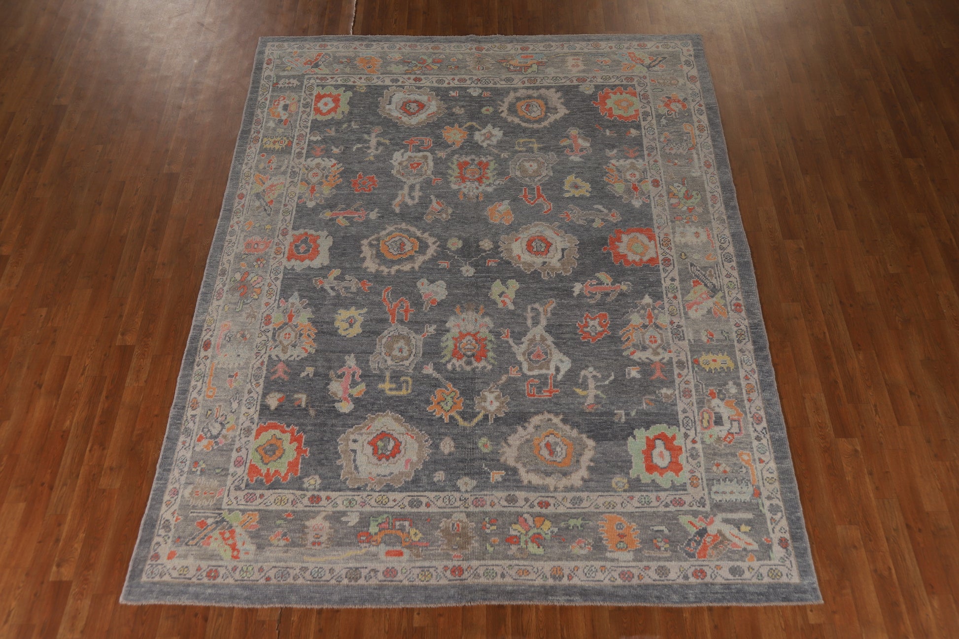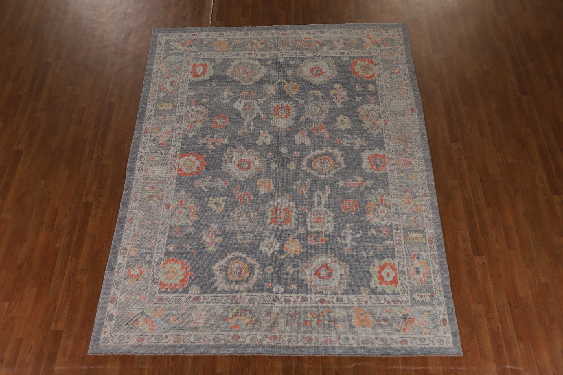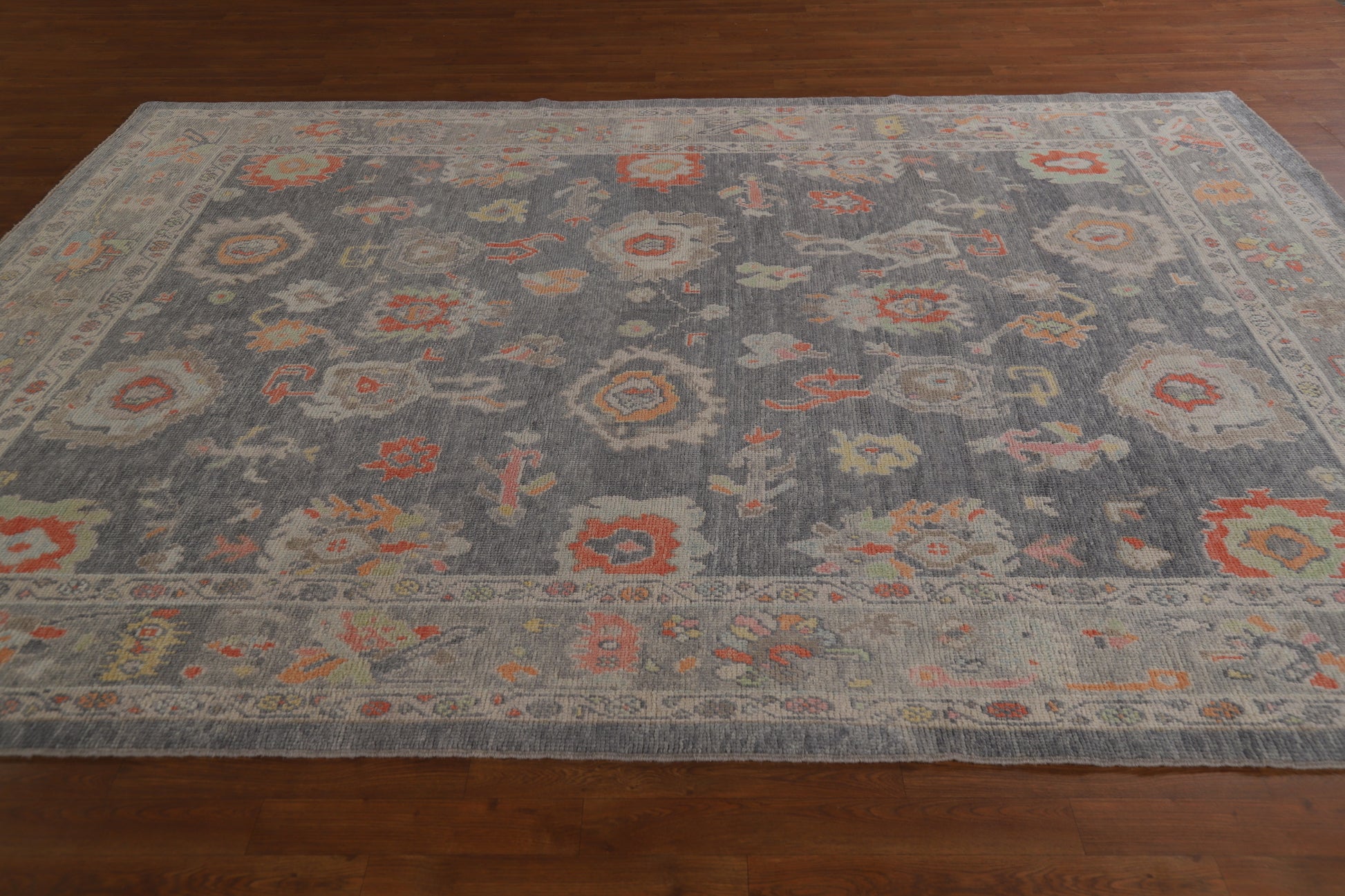 A Beautiful Genuine Turkey Oushak rug is Hand Knotted by skillful weavers in Turkey with 100% Wool Material. This rug is in New, First Quality condition. dimensions are 10' 2'' X 7' 11'' in foot and 310 X 241 in centimeter. the primary color is Greys & Charcoal.
