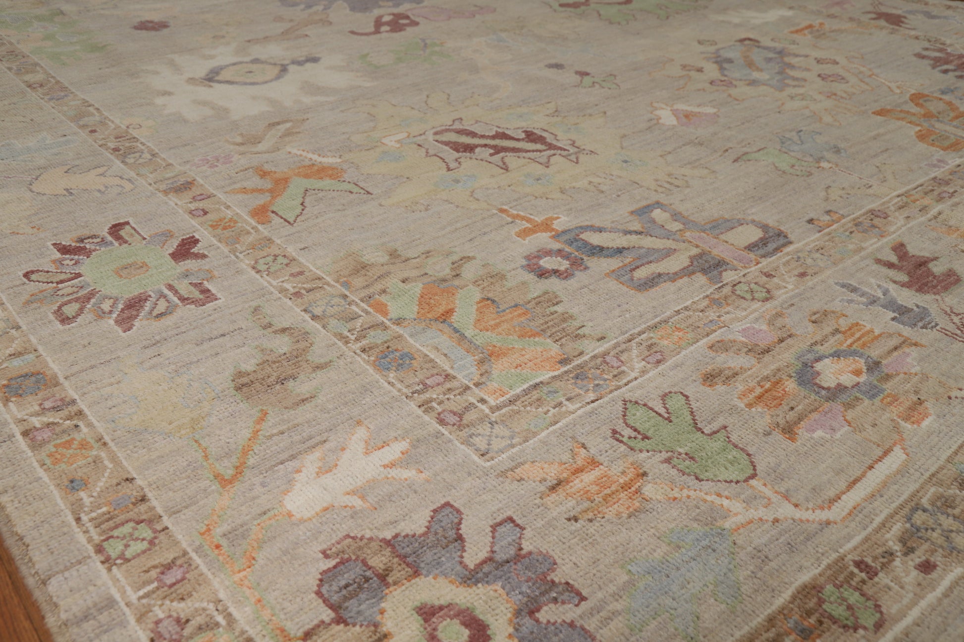 A Beautiful Genuine Turkey Oushak rug is Hand Knotted by skillful weavers in Turkey with 100% Wool Material. This rug is in New, First Quality condition. dimensions are 9' 10'' X 8' 2'' in foot and 300 X 249 in centimeter. the primary color is Beige & Ivories.