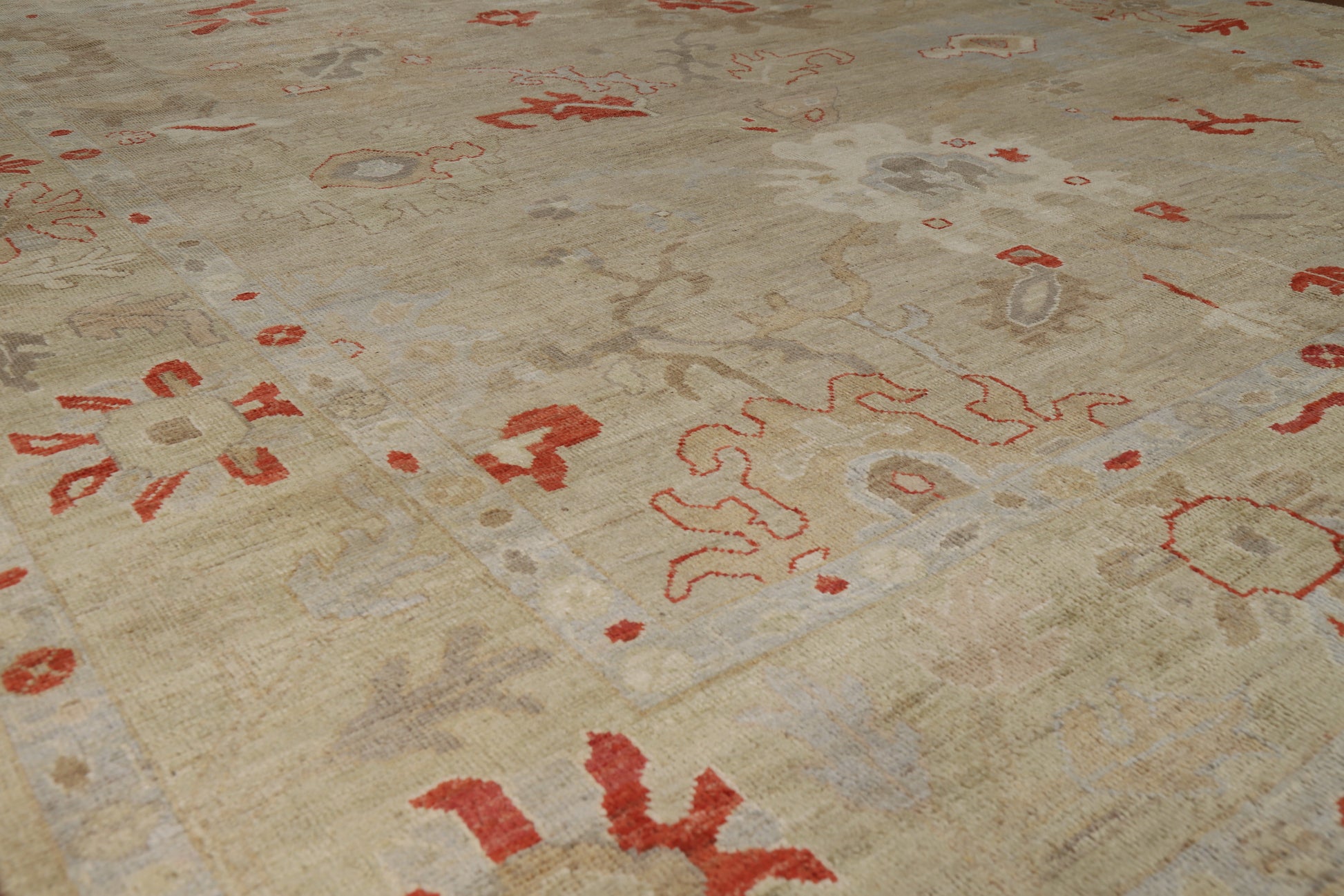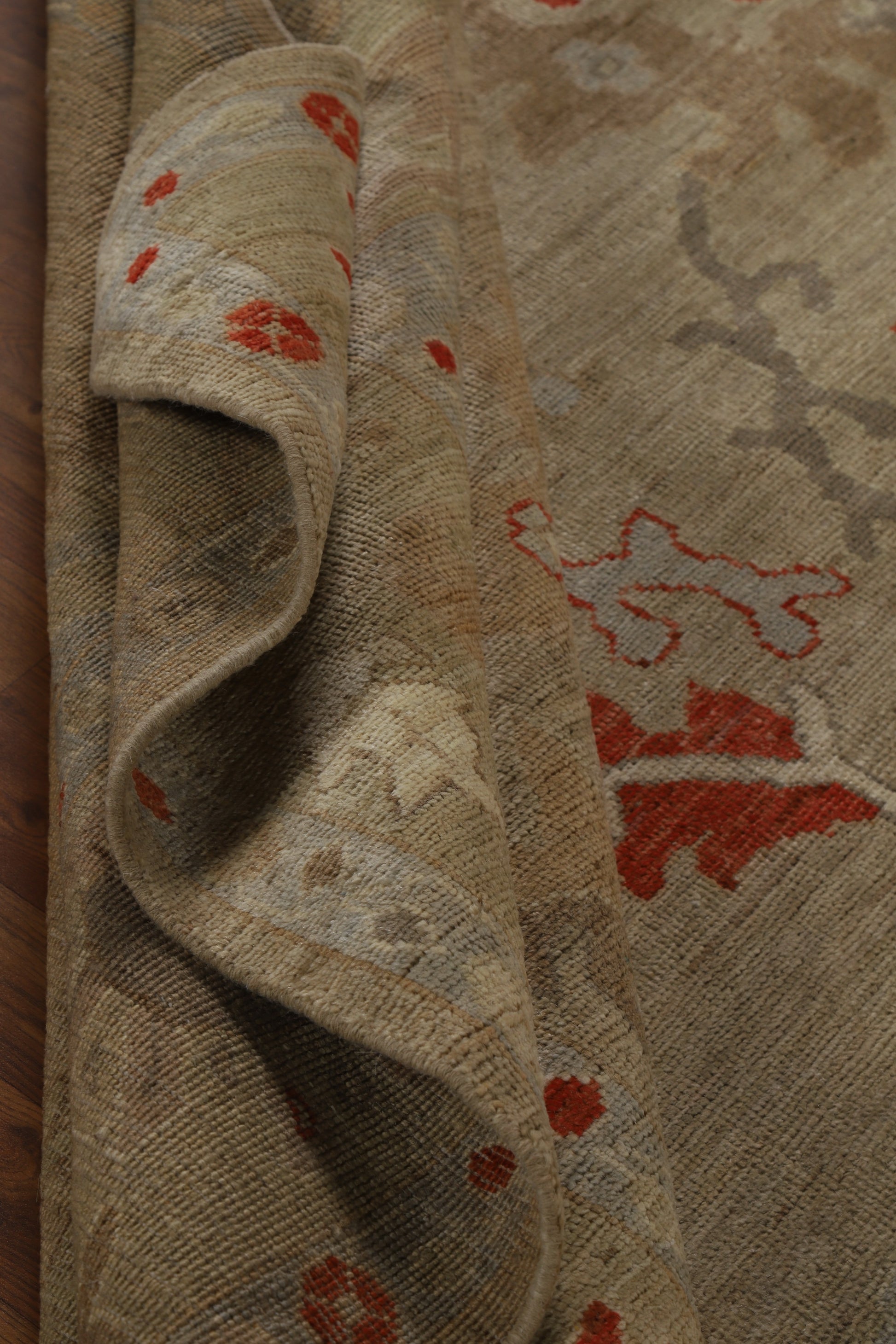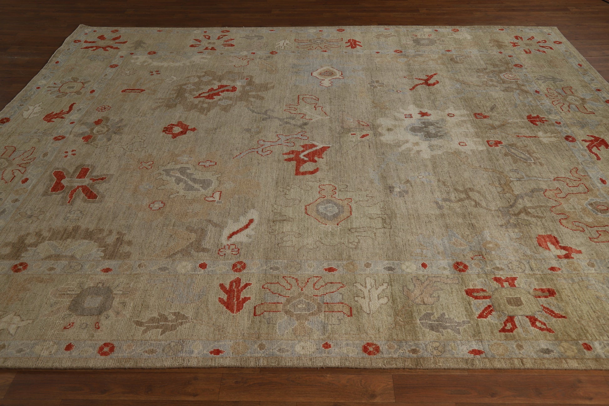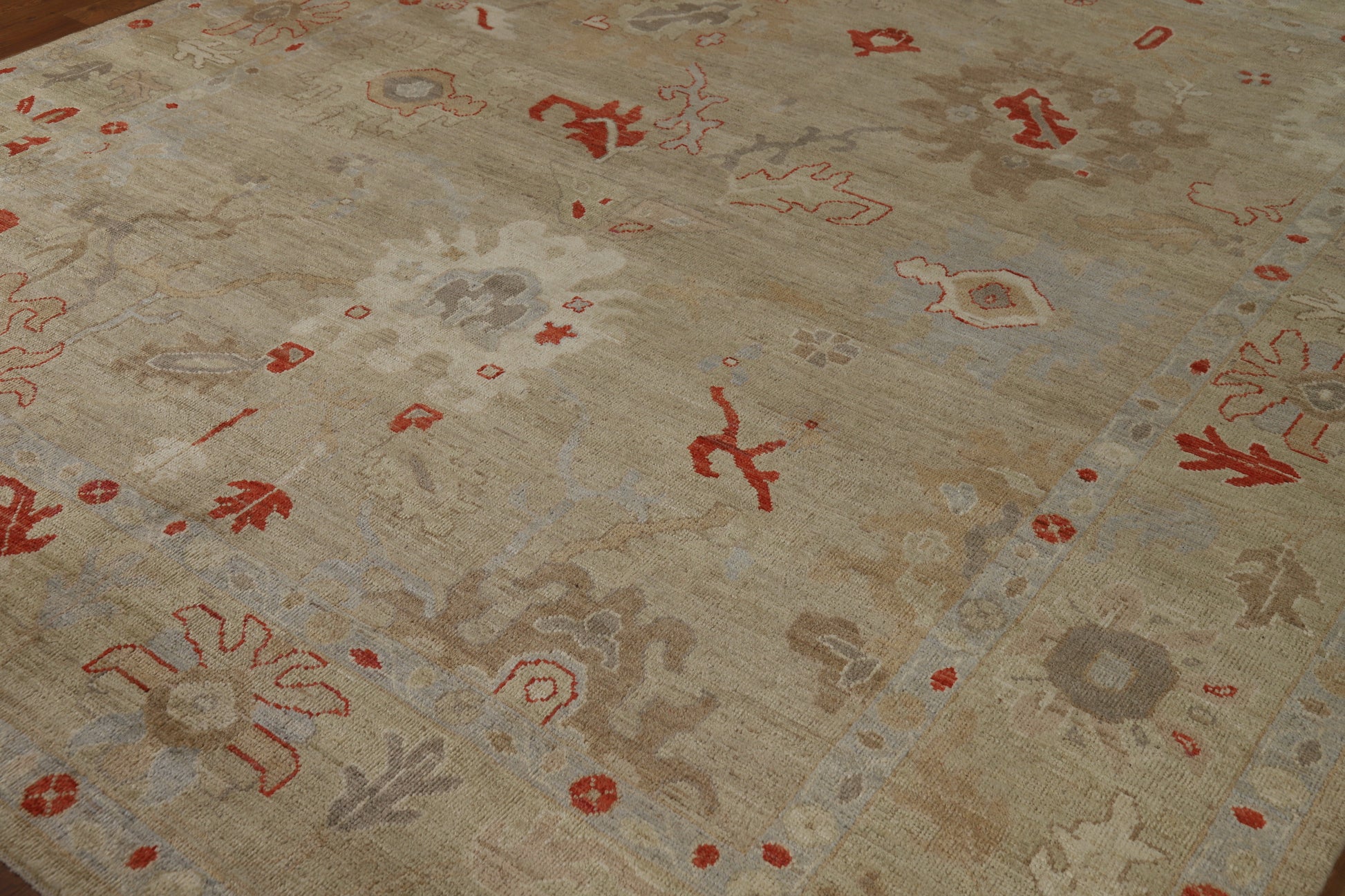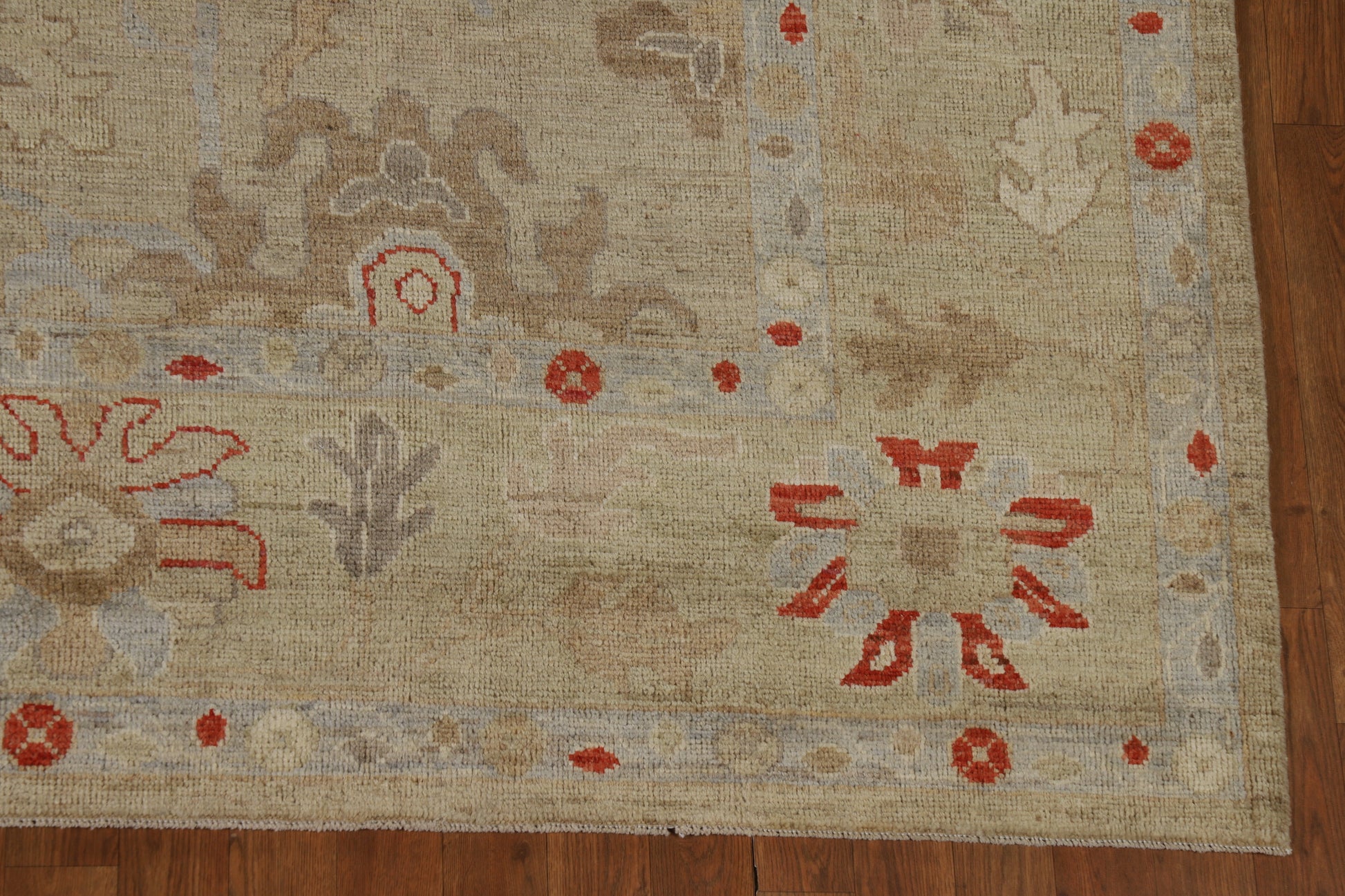 A Beautiful Genuine Turkey Oushak rug is Hand Knotted by skillful weavers in Turkey with 100% Wool Material. This rug is in New, First Quality condition. dimensions are 9' 9'' X 8' 4'' in foot and 297 X 254 in centimeter. the primary color is Beige & Ivories.