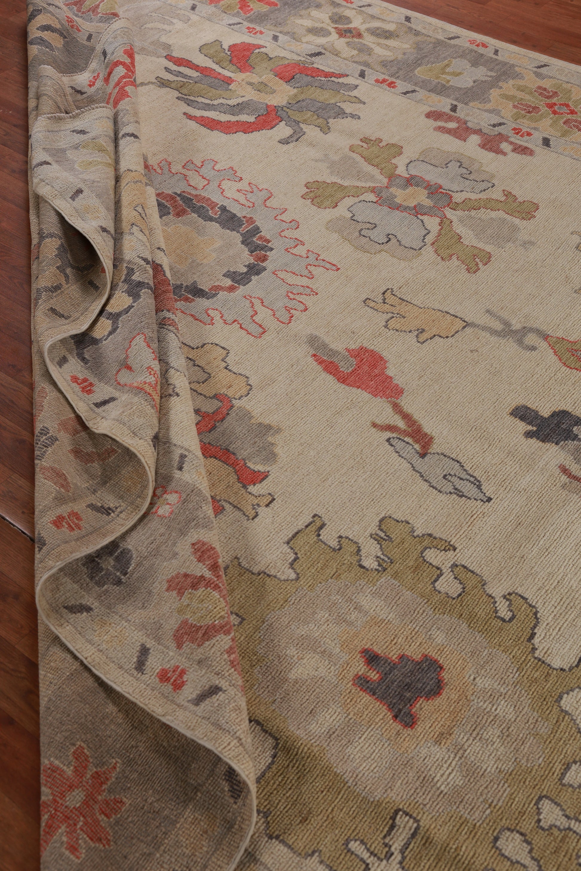 A Beautiful Genuine Turkey Oushak rug is Hand Knotted by skillful weavers in Turkey with 100% Wool Material. This rug is in New, First Quality condition. dimensions are 12' 5'' X 9' 1'' in foot and 378 X 277 in centimeter. the primary color is Beige & Ivories.