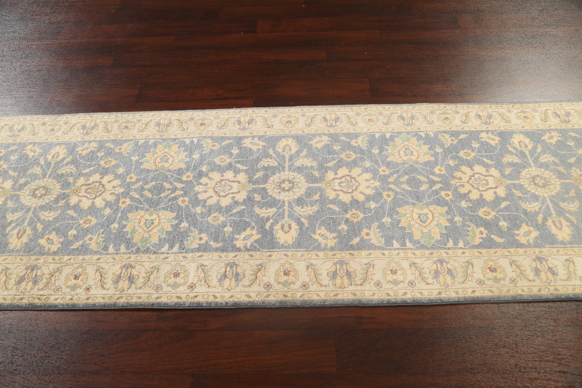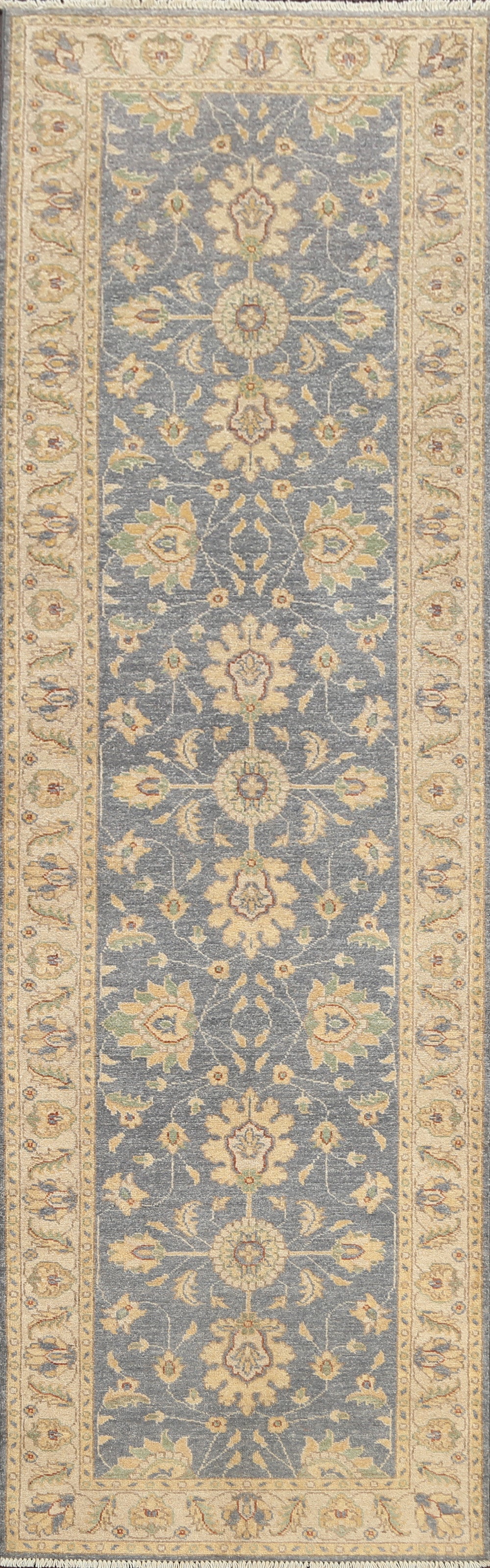 A Beautiful Genuine Pakistan Peshawar-Chobi rug is Hand Knotted by skillful weavers in Pakistan with 100% Wool Material. This rug is in New, First Quality condition. dimensions are 9' 9'' X 2' 10'' in foot and 297 X 86 in centimeter. the primary color is Greys & Charcoal.