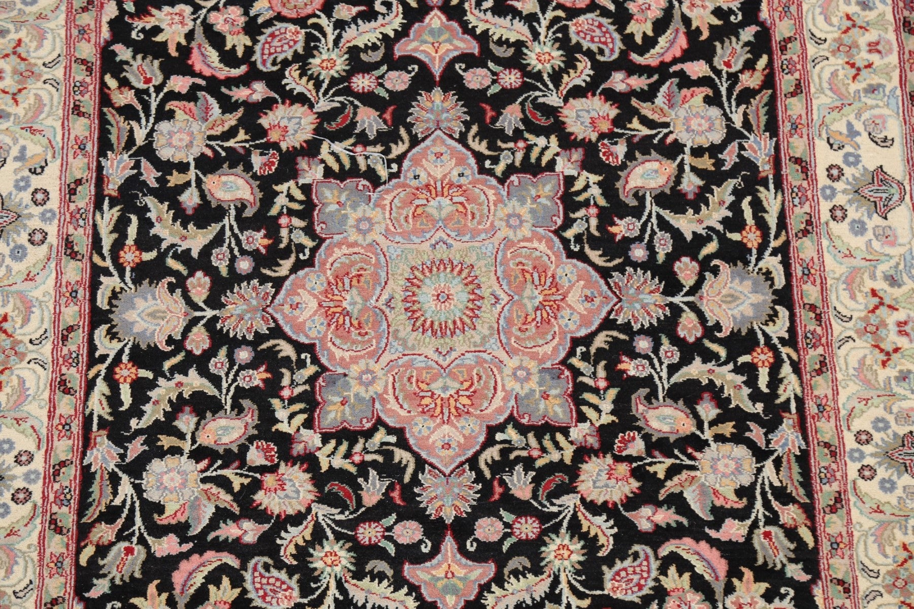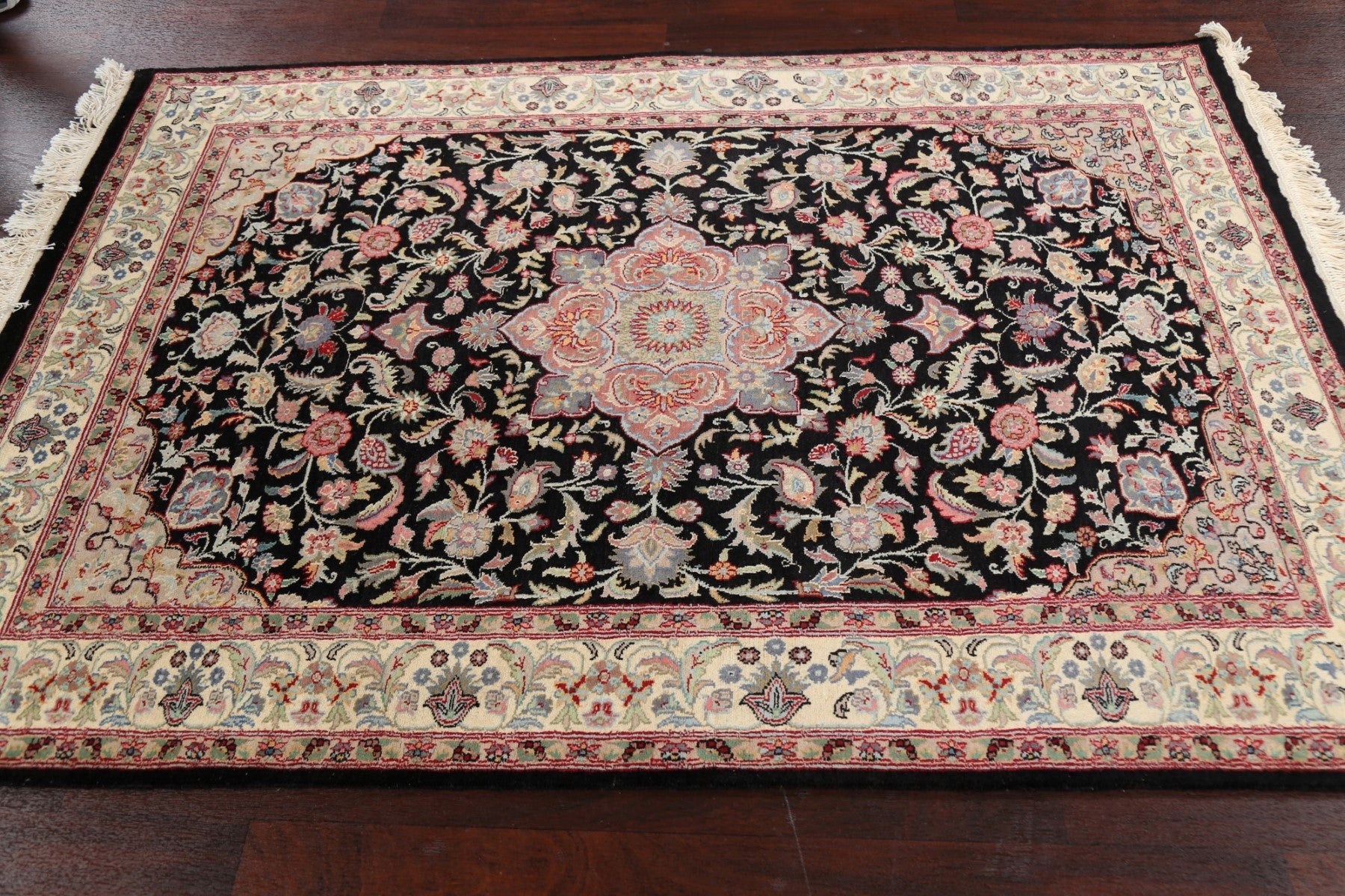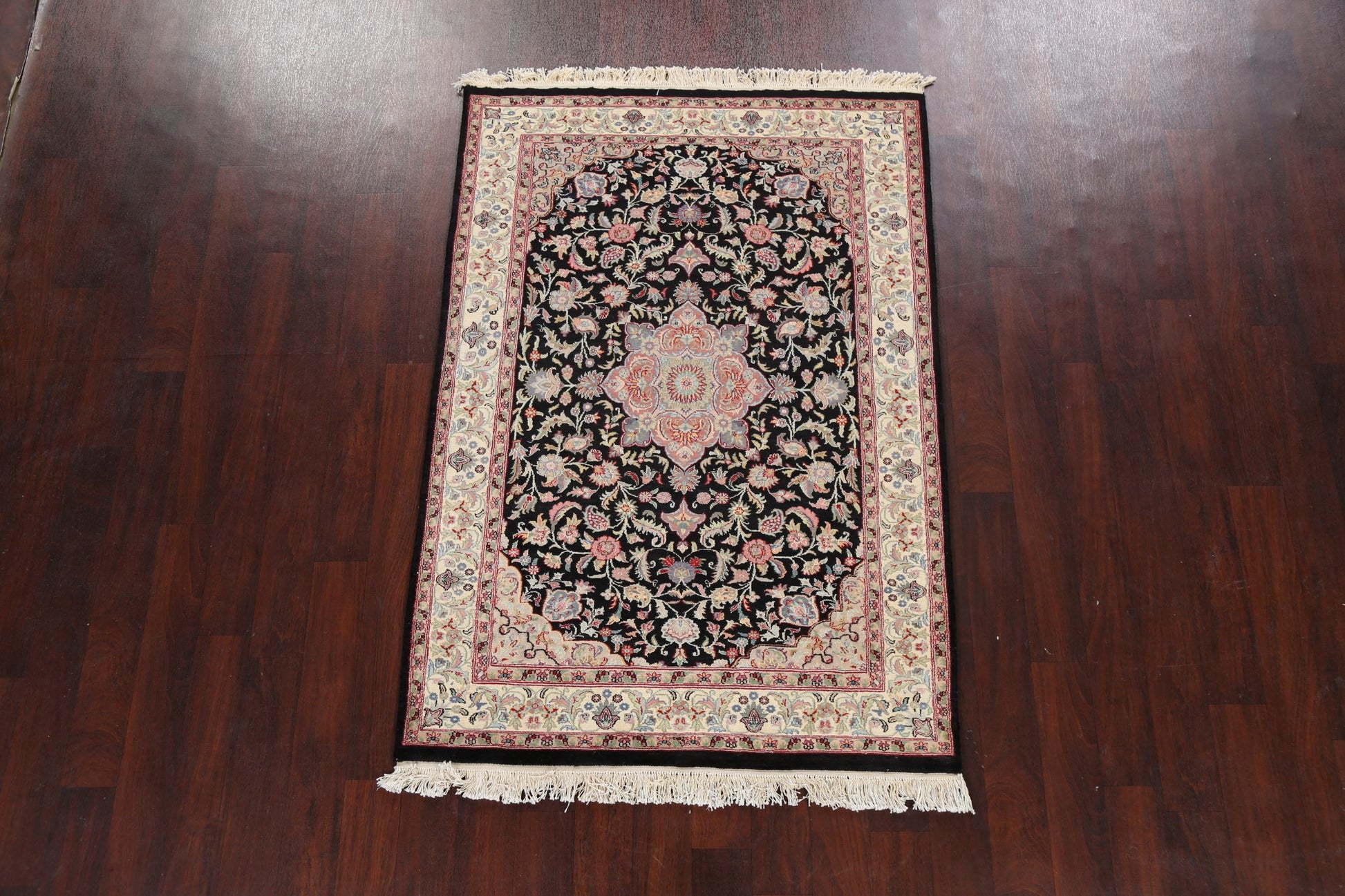 A Beautiful Genuine Pakistan Tabriz rug is Hand Knotted by skillful weavers in Pakistan with Wool & Silk Material. This rug is in New, First Quality condition. dimensions are 5' 11'' X 4' 0'' in foot and 180 X 122 in centimeter. the primary color is Black.