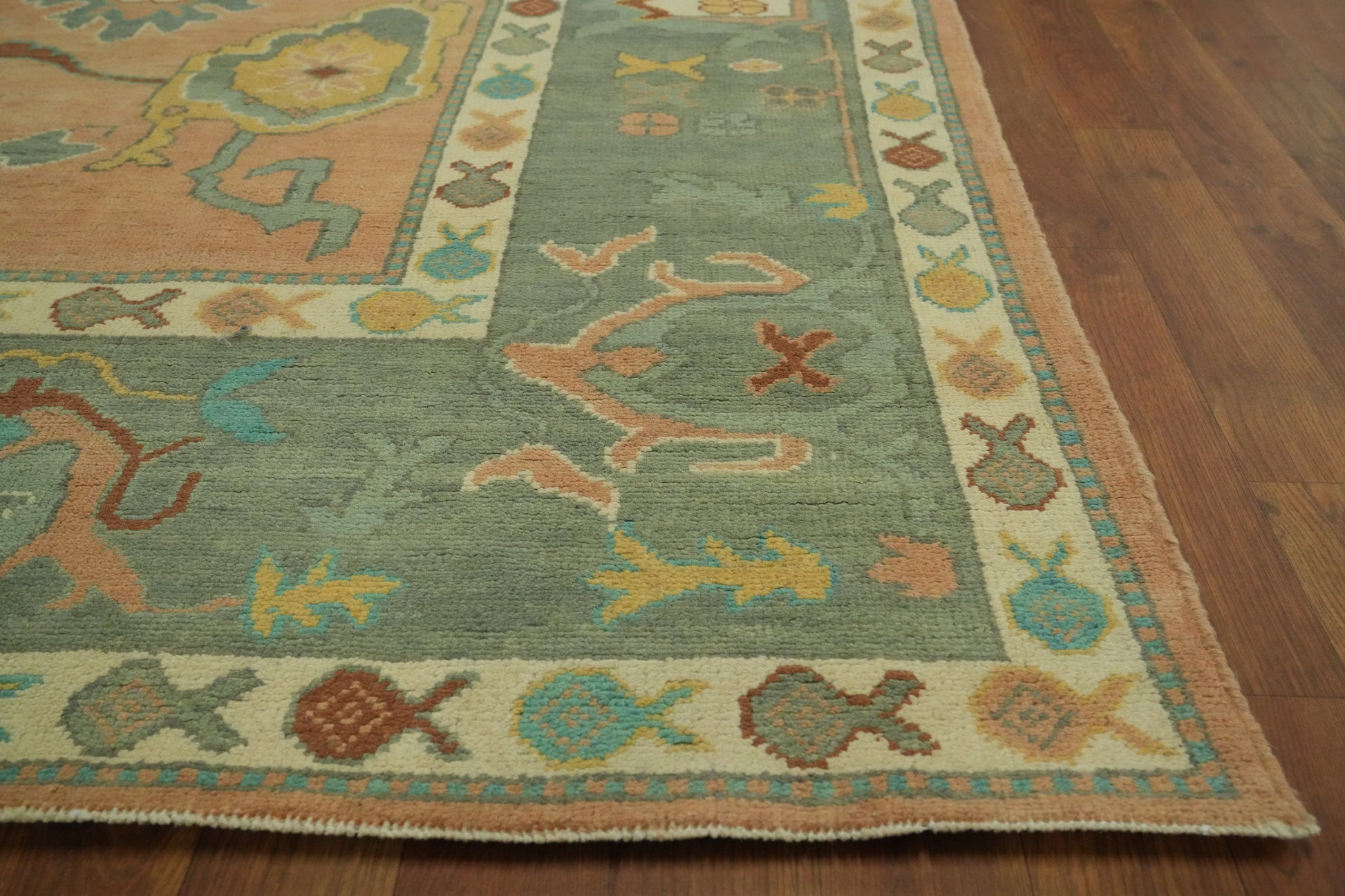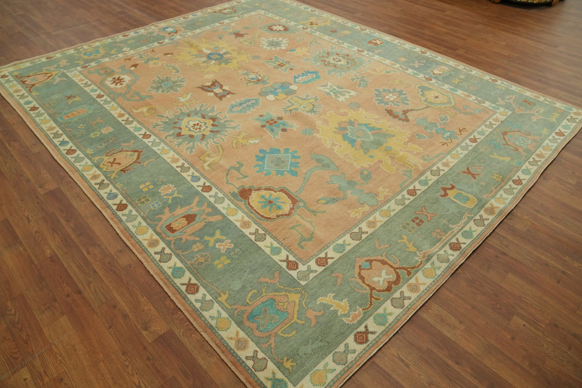 A Beautiful Genuine Turkey Oushak rug is Hand Knotted by skillful weavers in Turkey with 100% Wool Material. This rug is in New, First Quality condition. dimensions are 9' 11'' X 8' 5'' in foot and 302 X 257 in centimeter. the primary color is Peach.