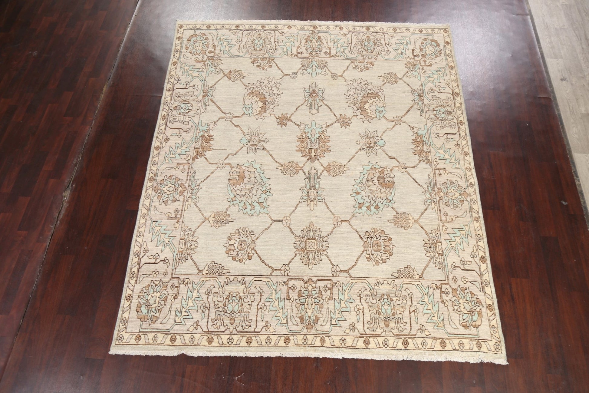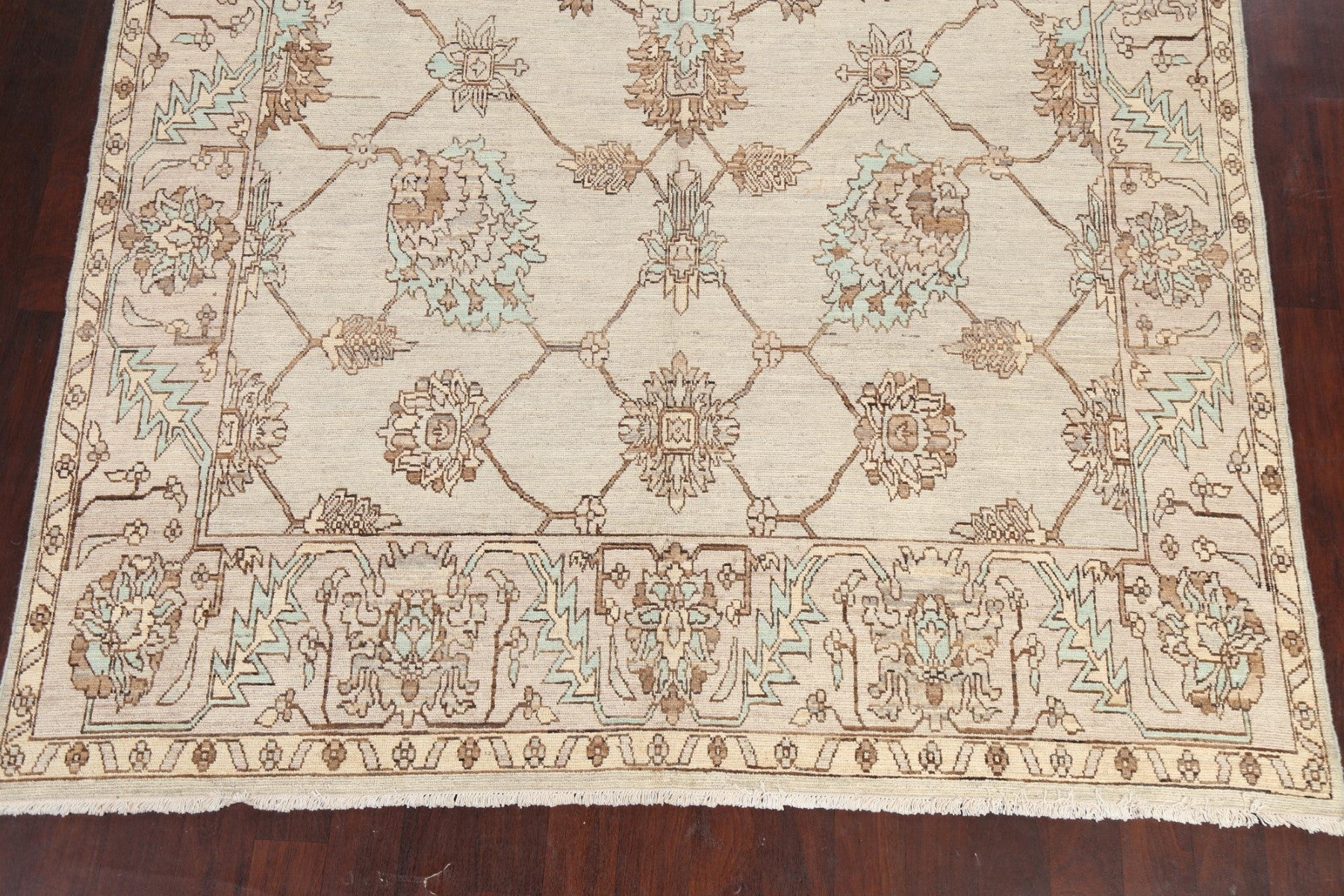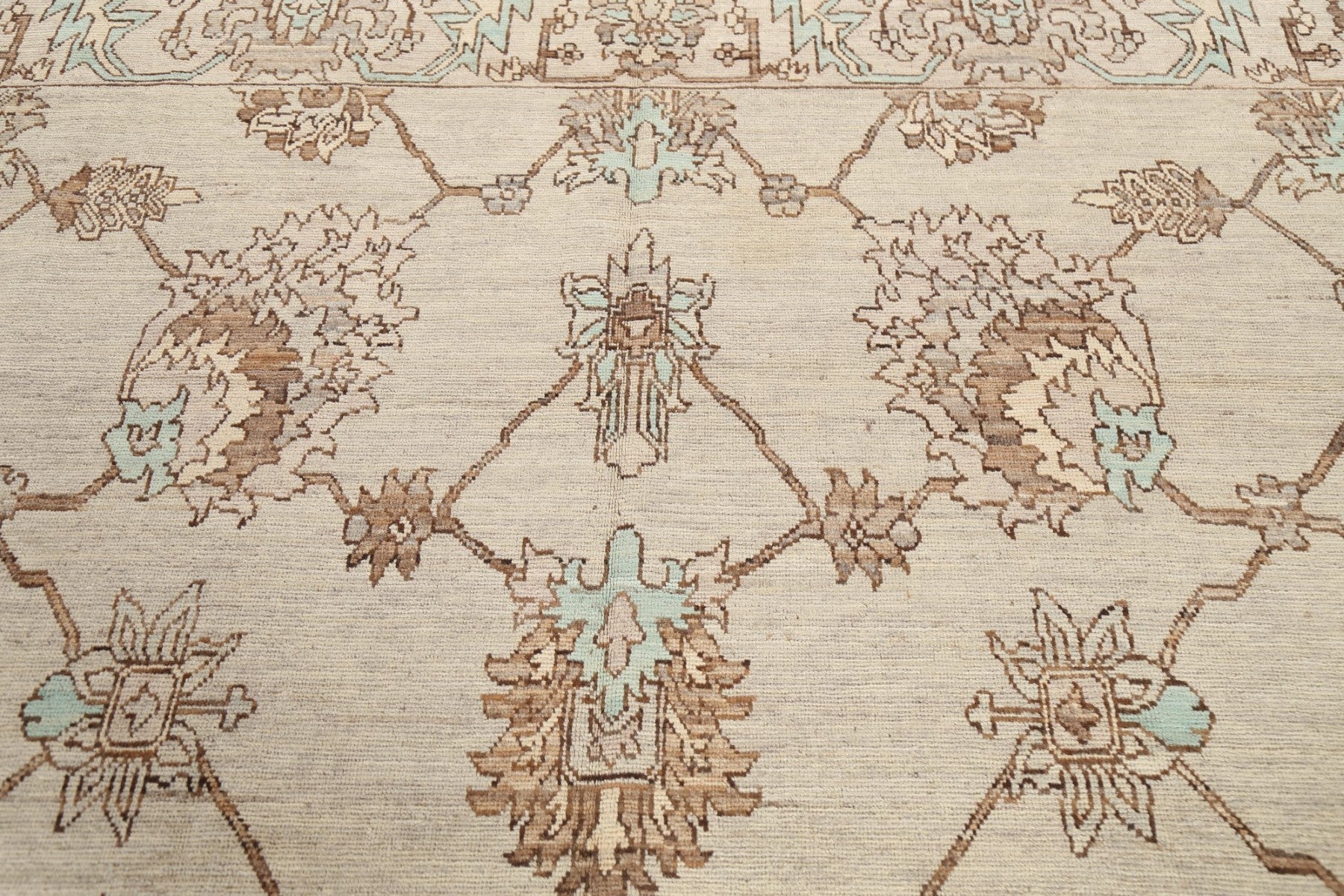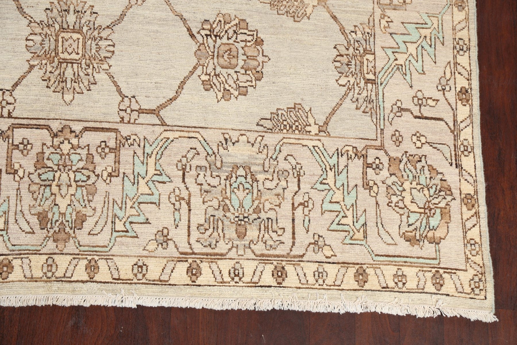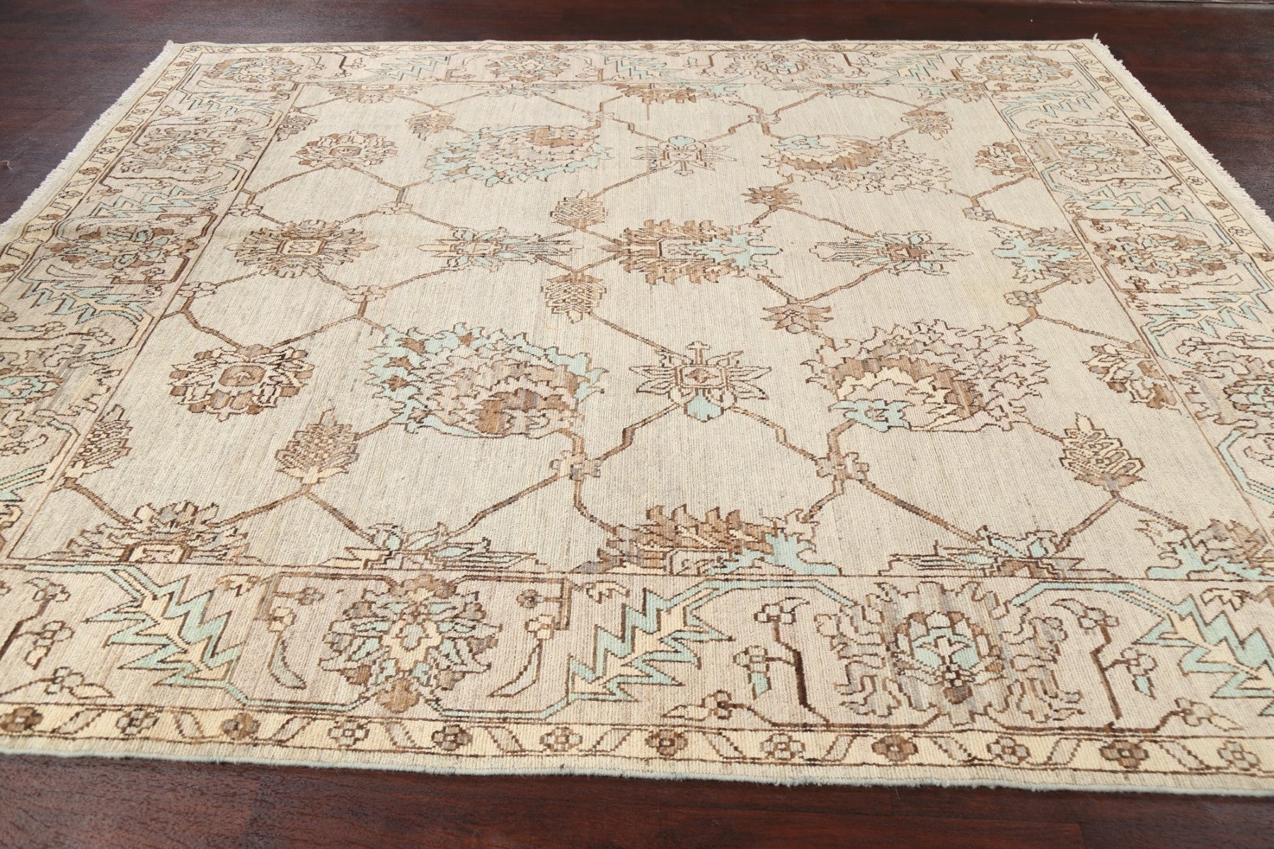 A Beautiful Genuine Pakistan Ziegler rug is Hand Knotted by skillful weavers in Pakistan with 100% Wool Material. This rug is in New, First Quality condition. dimensions are 9' 4'' X 7' 11'' in foot and 284 X 241 in centimeter. the primary color is Beige & Ivories.