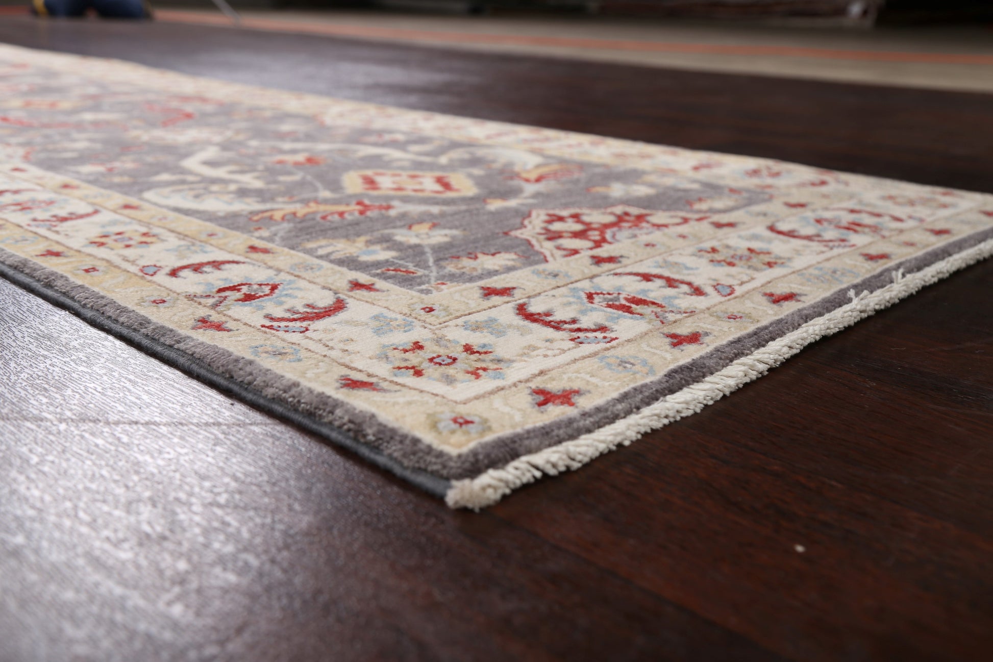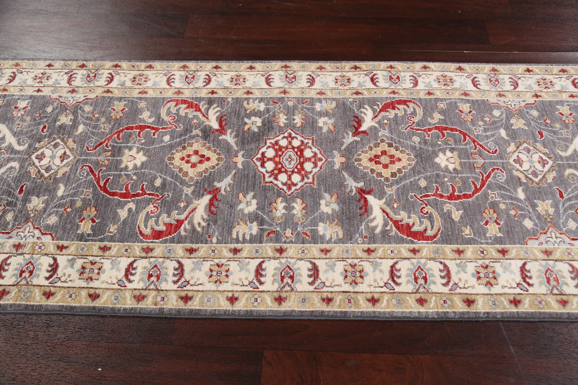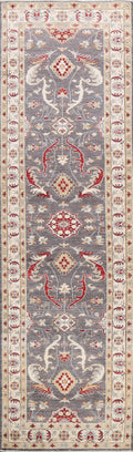 A Beautiful Genuine Pakistan Ziegler rug is Hand Knotted by skillful weavers in Pakistan with 100% Wool Material. This rug is in New, First Quality condition. dimensions are 9' 10'' X 2' 8'' in foot and 300 X 81 in centimeter. the primary color is Greys & Charcoal.