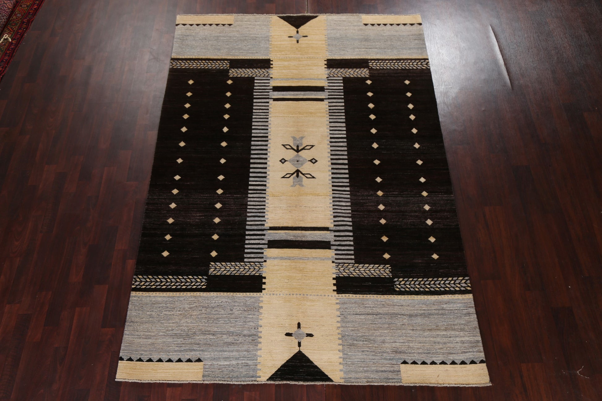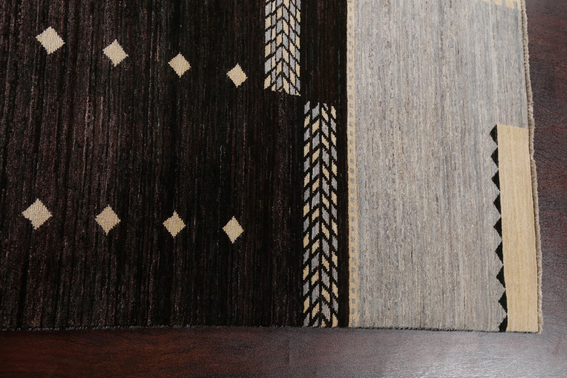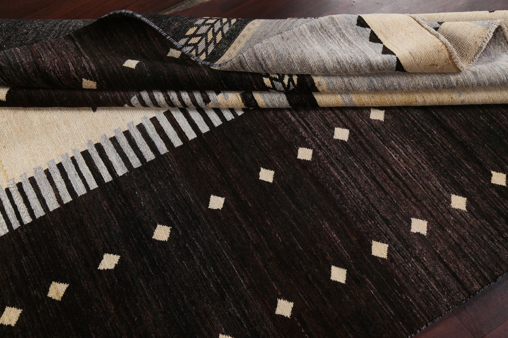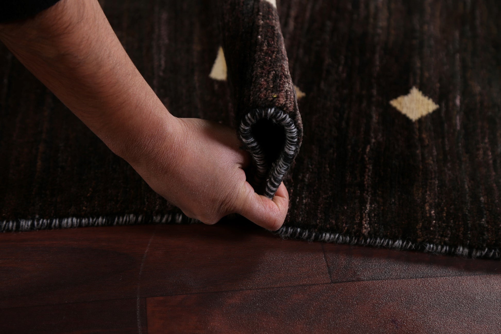 A Beautiful Genuine Pakistan Gabbeh (kashkoli) rug is Hand Knotted by skillful weavers in Pakistan with 100% Wool Material. This rug is in New, First Quality condition. dimensions are 9' 7'' X 6' 7'' in foot and 292 X 201 in centimeter. the primary color is Black.