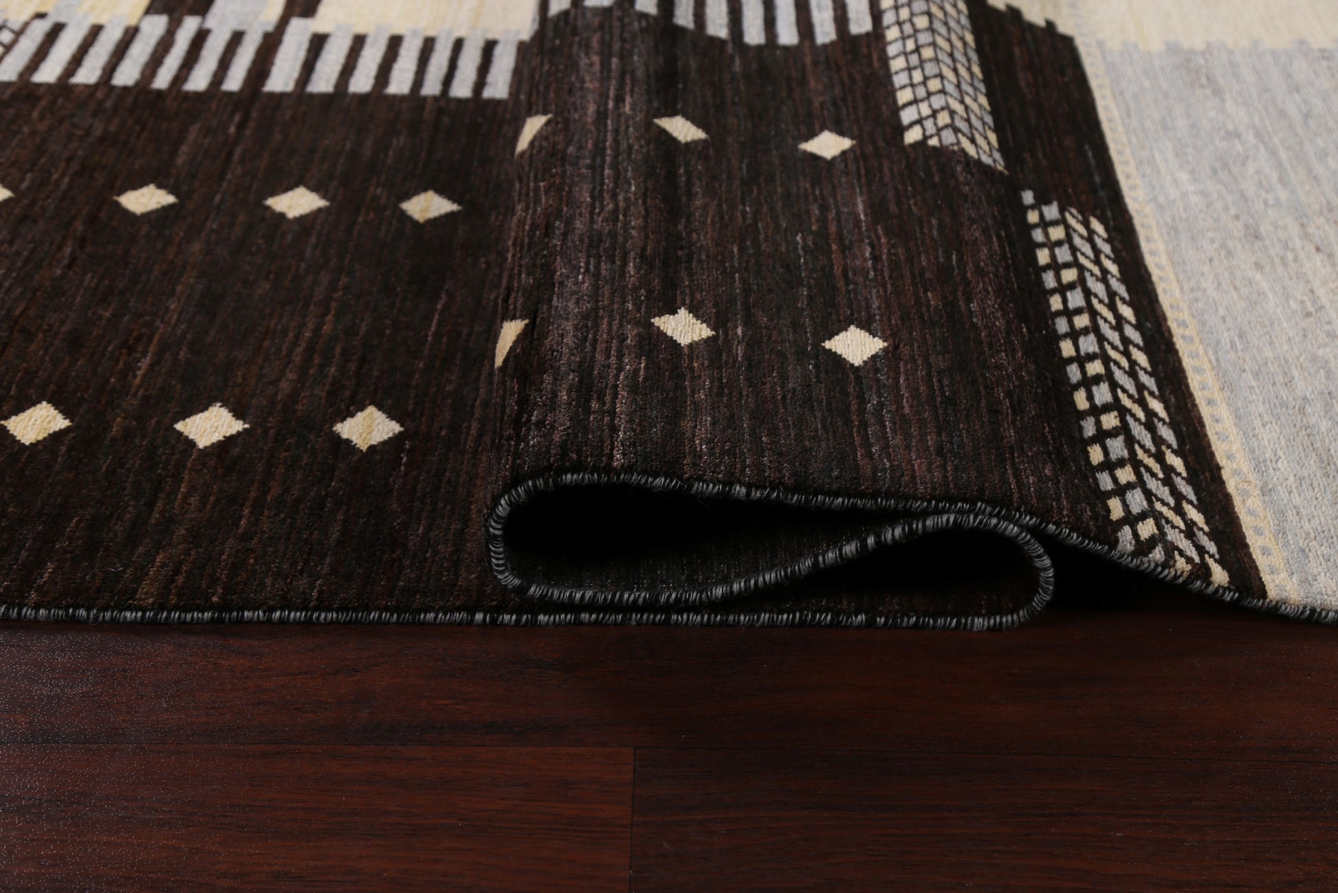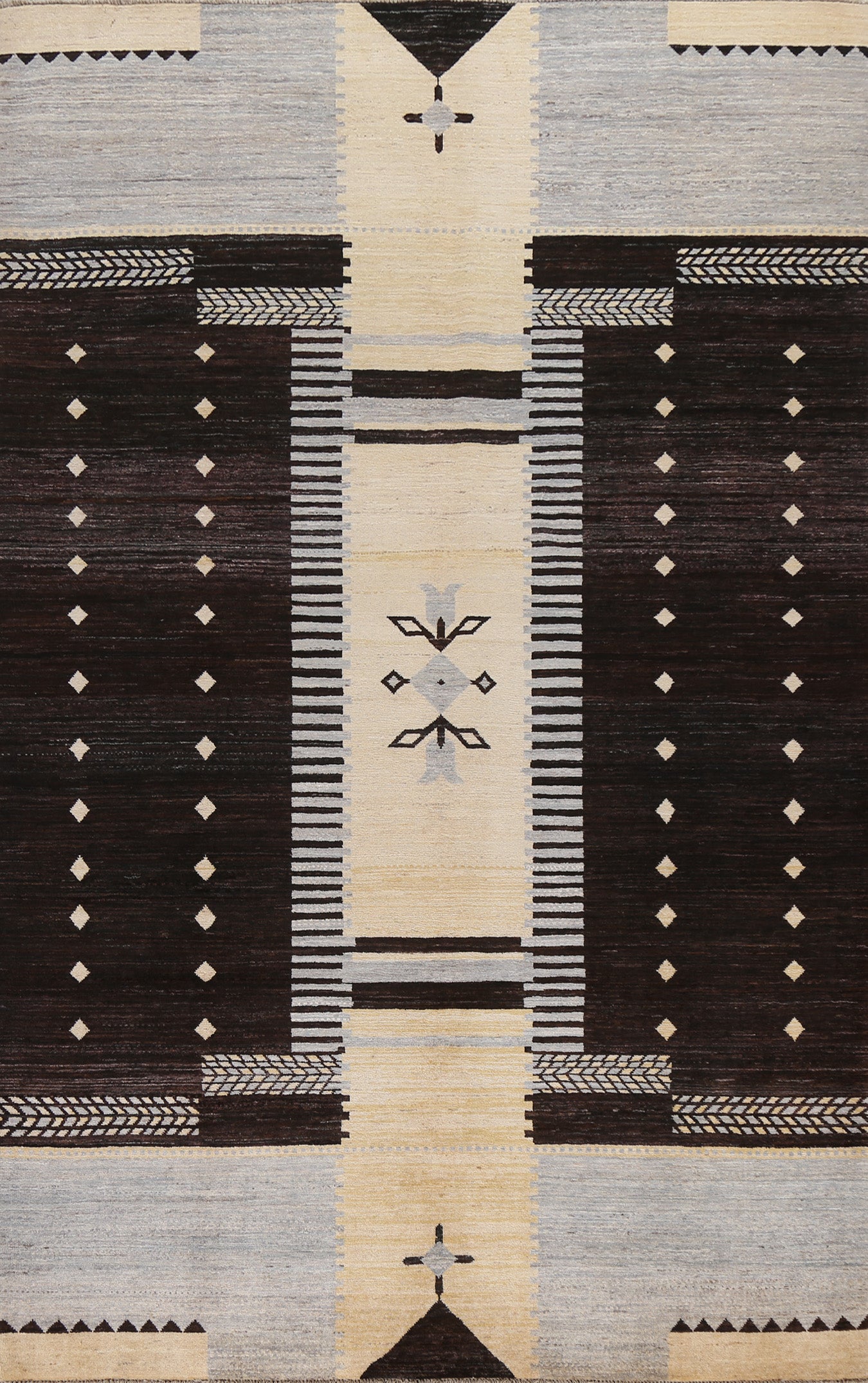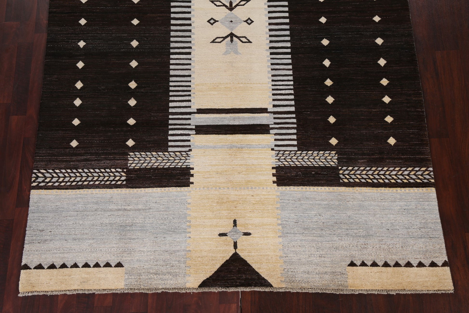 A Beautiful Genuine Pakistan Gabbeh (kashkoli) rug is Hand Knotted by skillful weavers in Pakistan with 100% Wool Material. This rug is in New, First Quality condition. dimensions are 9' 7'' X 6' 7'' in foot and 292 X 201 in centimeter. the primary color is Black.