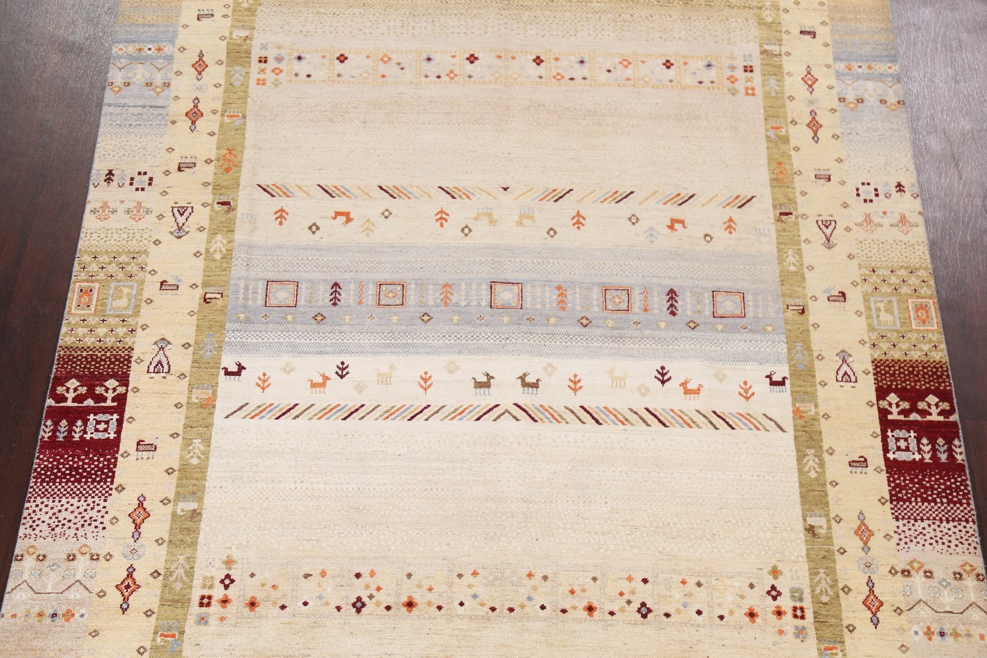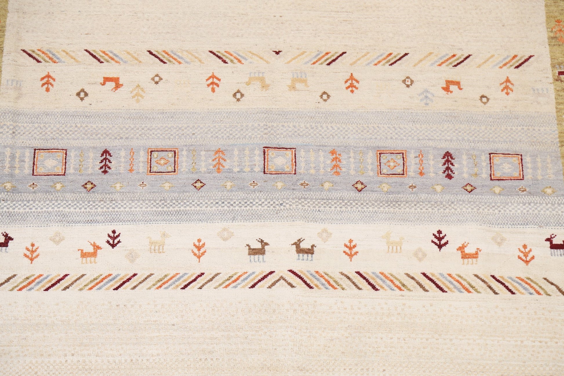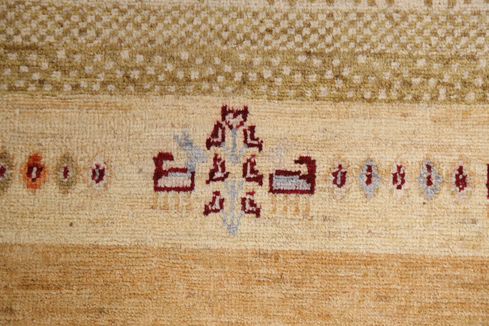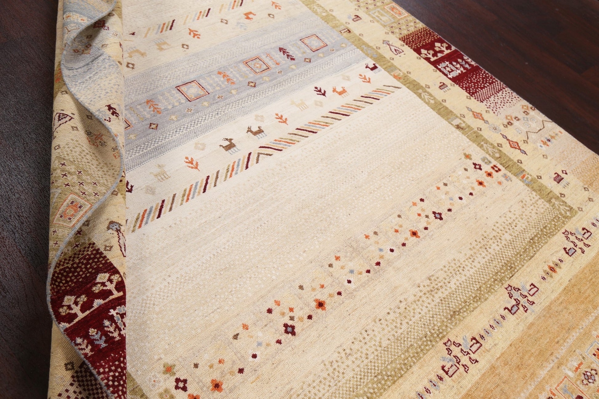 A Beautiful Genuine Pakistan Gabbeh (kashkoli) rug is Hand Knotted by skillful weavers in Pakistan with 100% Wool Material. This rug is in New, First Quality condition. dimensions are 9' 10'' X 6' 6'' in foot and 300 X 198 in centimeter. the primary color is Beige & Ivories.