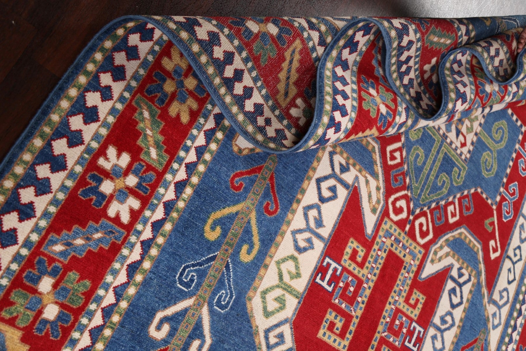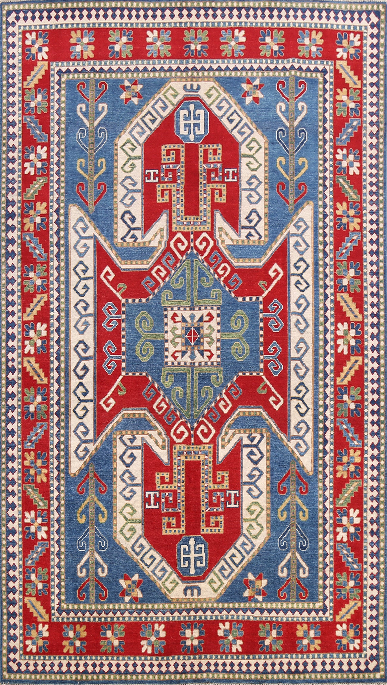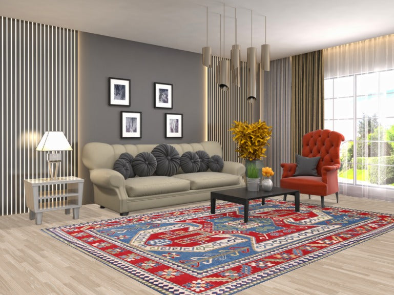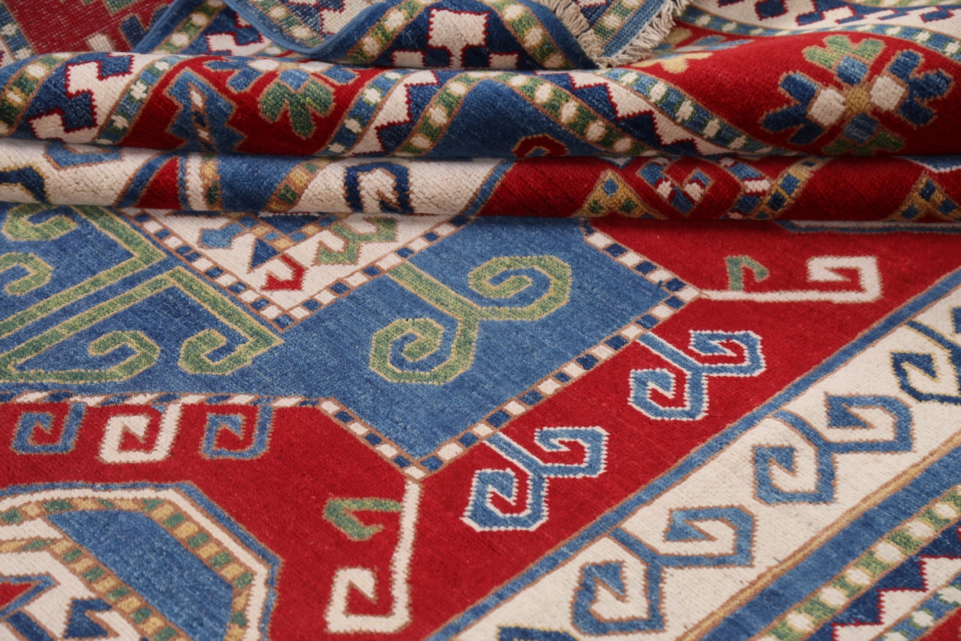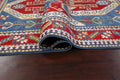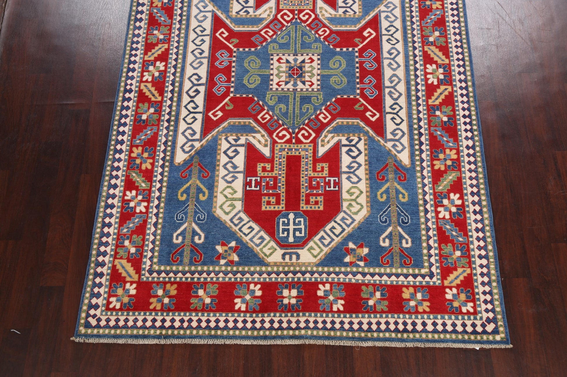 A Beautiful Genuine Pakistan Kazak rug is Hand Knotted by skillful weavers in Pakistan with 100% Wool Material. This rug is in New, First Quality condition. dimensions are 9' 8'' X 6' 6'' in foot and 295 X 198 in centimeter. the primary color is Navy Blue & Blues.
