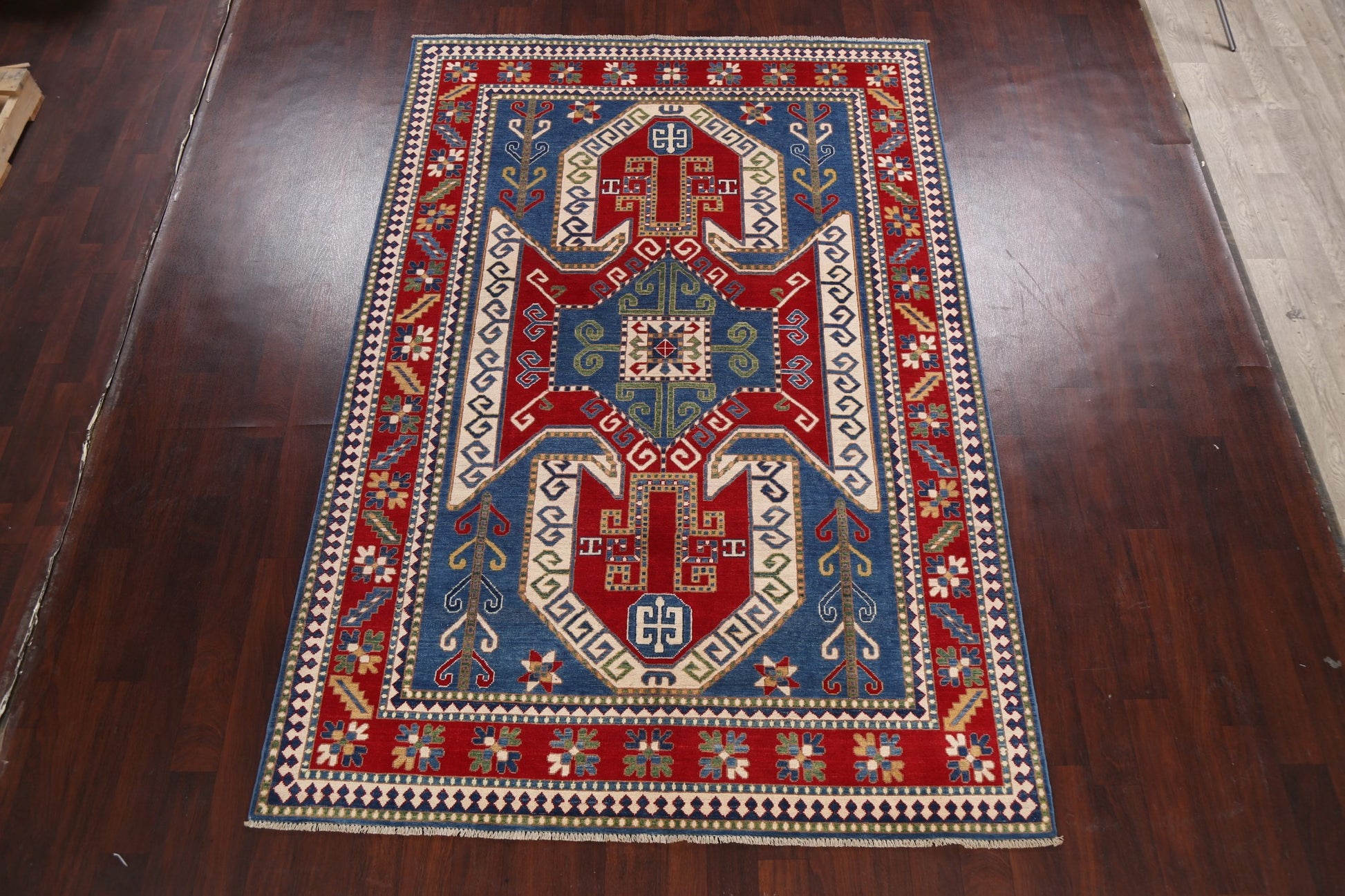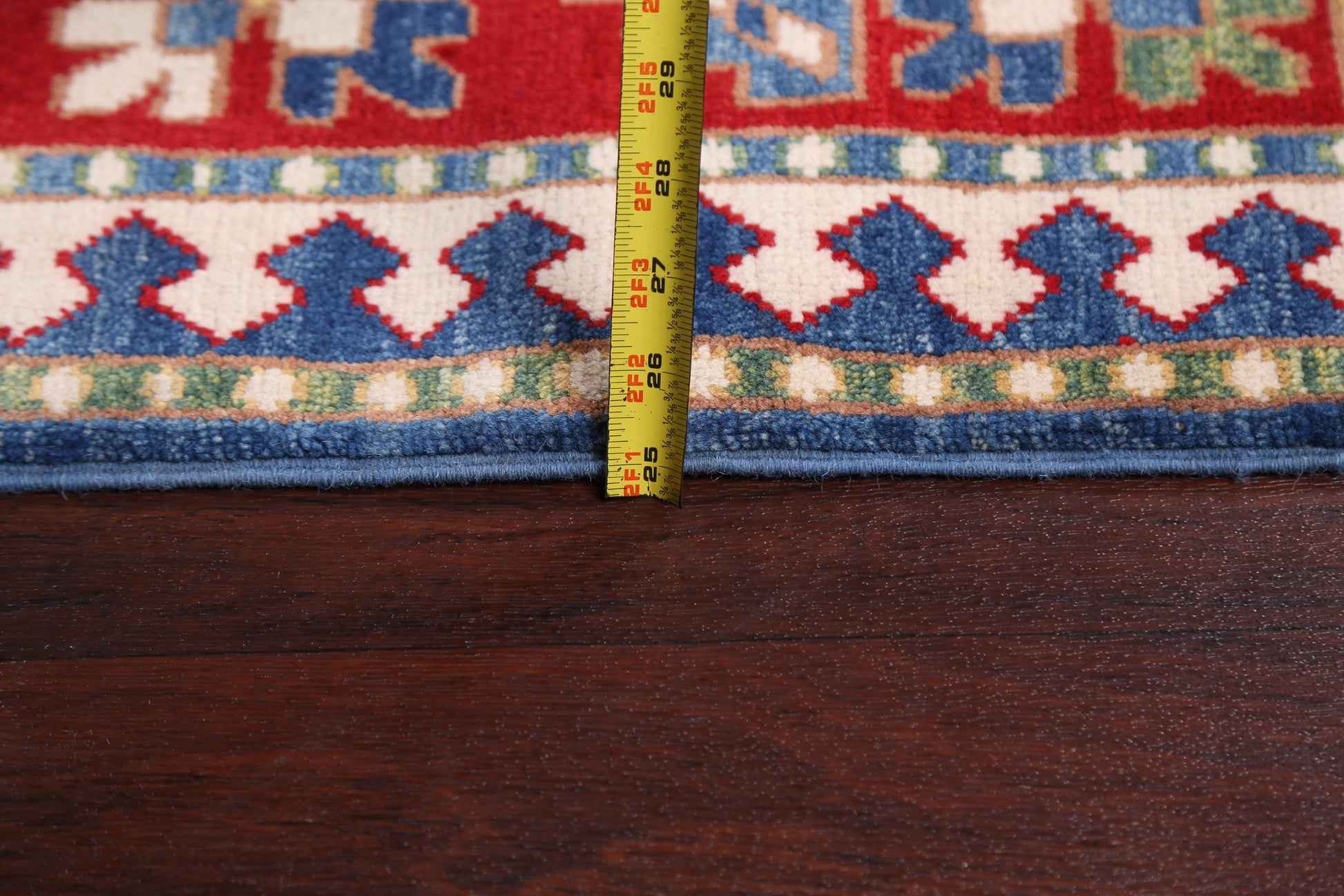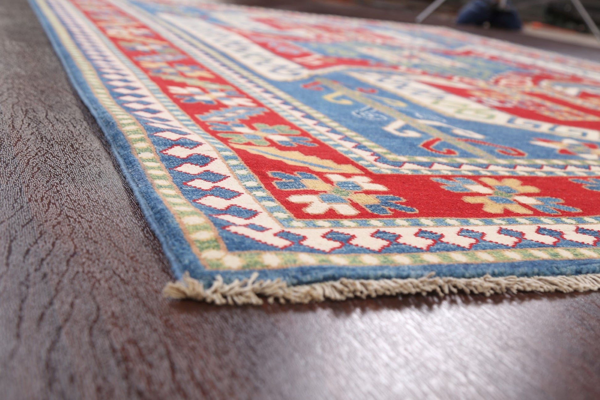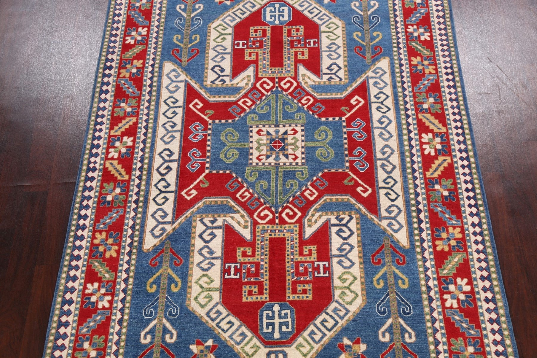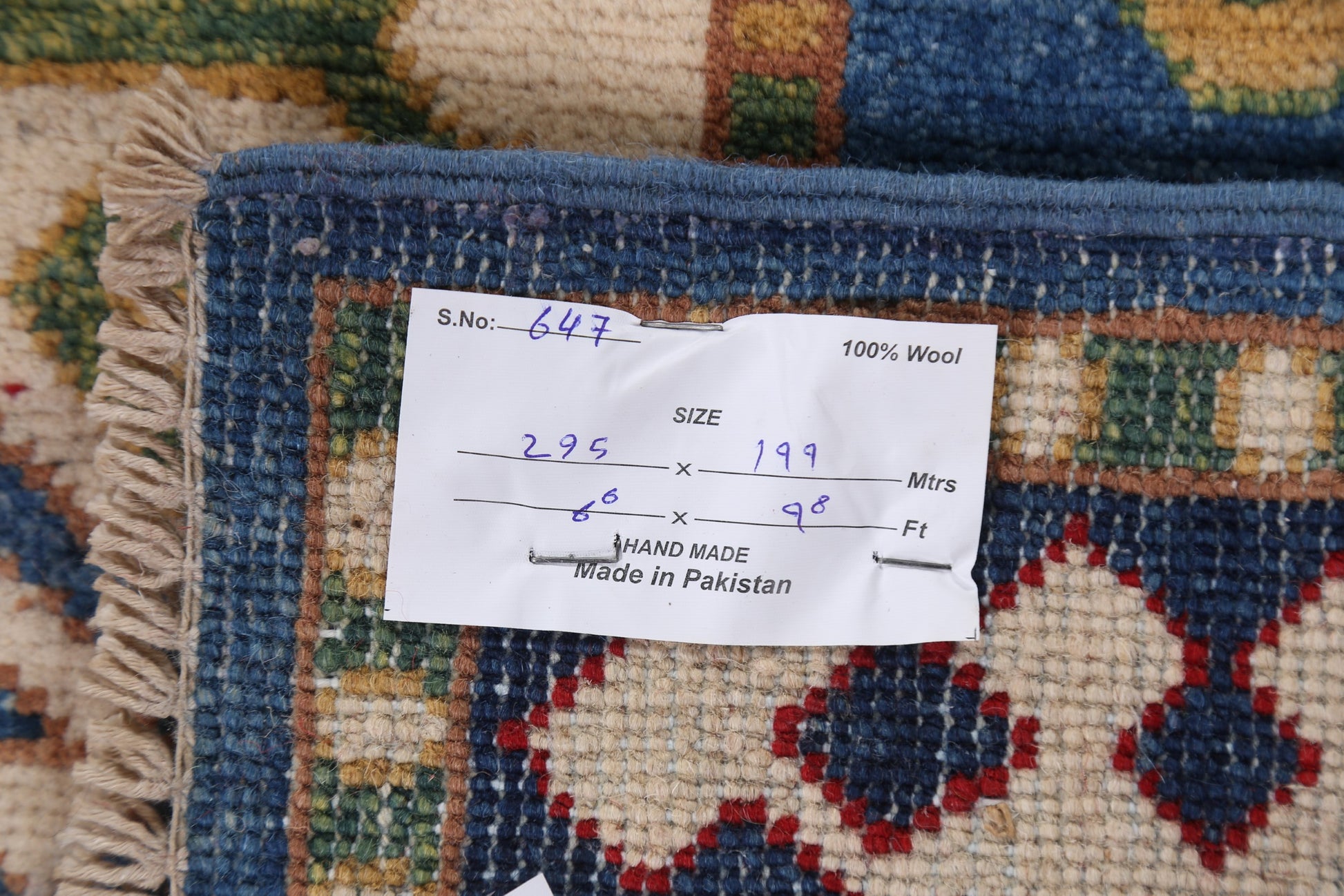 A Beautiful Genuine Pakistan Kazak rug is Hand Knotted by skillful weavers in Pakistan with 100% Wool Material. This rug is in New, First Quality condition. dimensions are 9' 8'' X 6' 6'' in foot and 295 X 198 in centimeter. the primary color is Navy Blue & Blues.