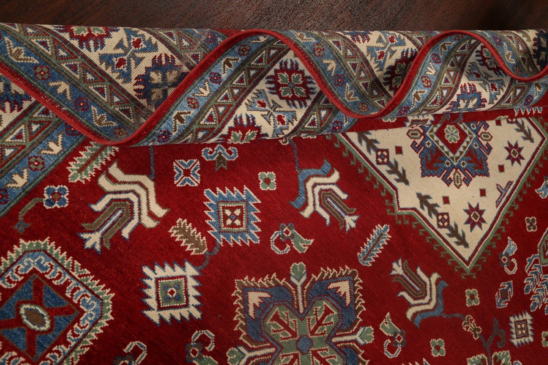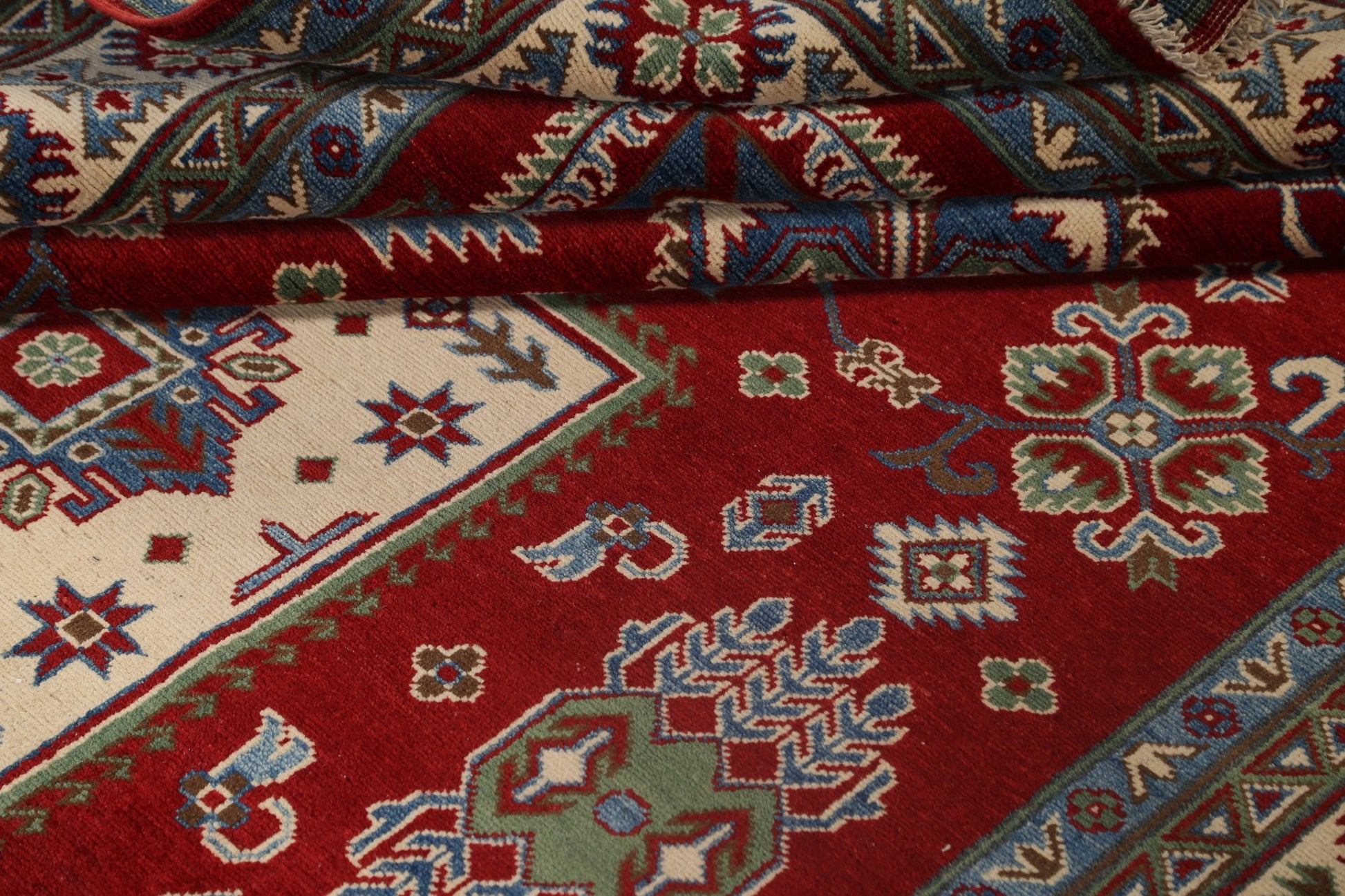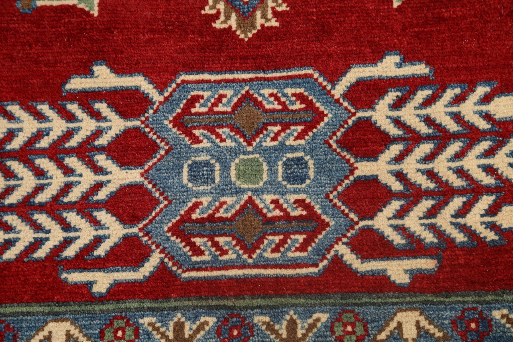 A Beautiful Genuine Pakistan Kazak rug is Hand Knotted by skillful weavers in Pakistan with 100% Wool Material. This rug is in New, First Quality condition. dimensions are 9' 10'' X 6' 8'' in foot and 300 X 203 in centimeter. the primary color is Red.