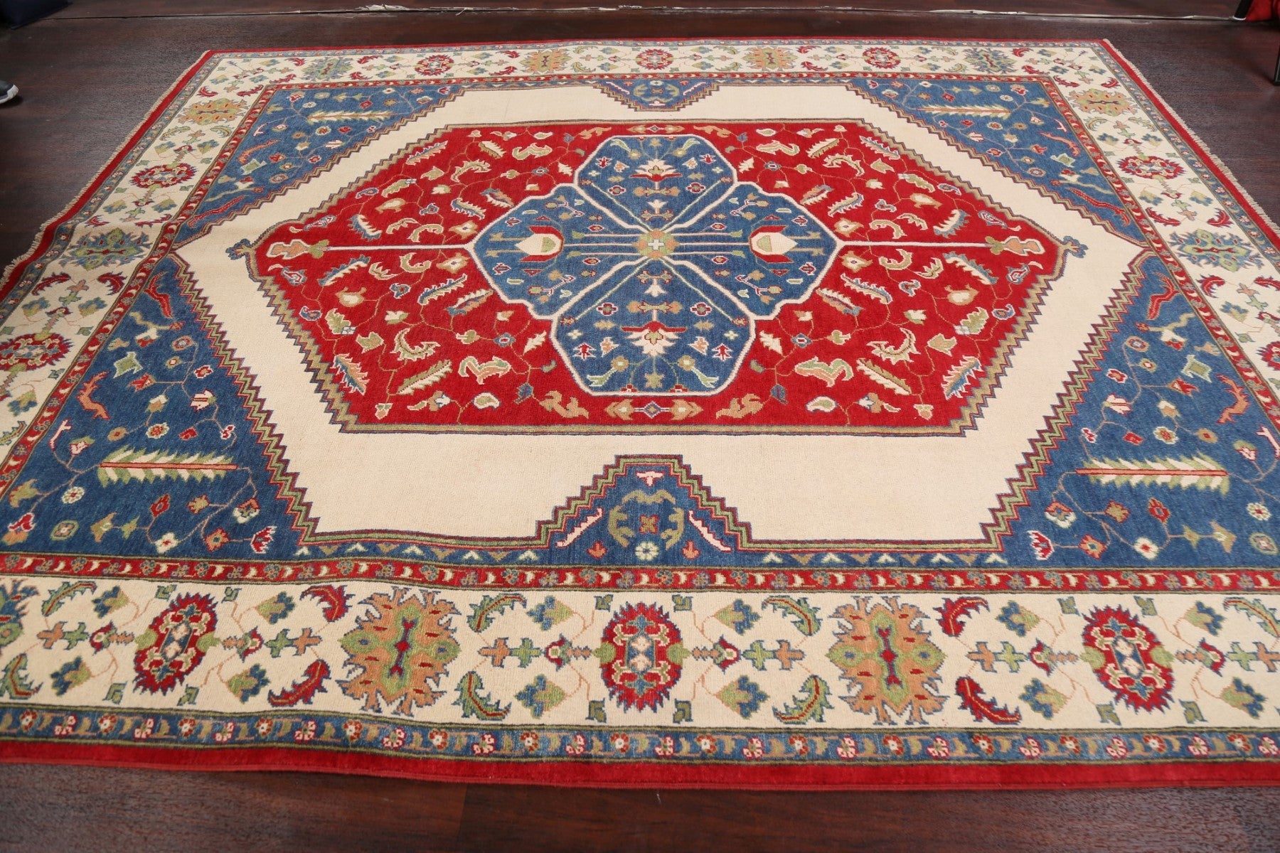 A Beautiful Genuine Pakistan Kazak rug is Hand Knotted by skillful weavers in Pakistan with 100% Wool Material. This rug is in New, First Quality condition. dimensions are 9' 9'' X 8' 0'' in foot and 297 X 244 in centimeter. the primary color is Red.