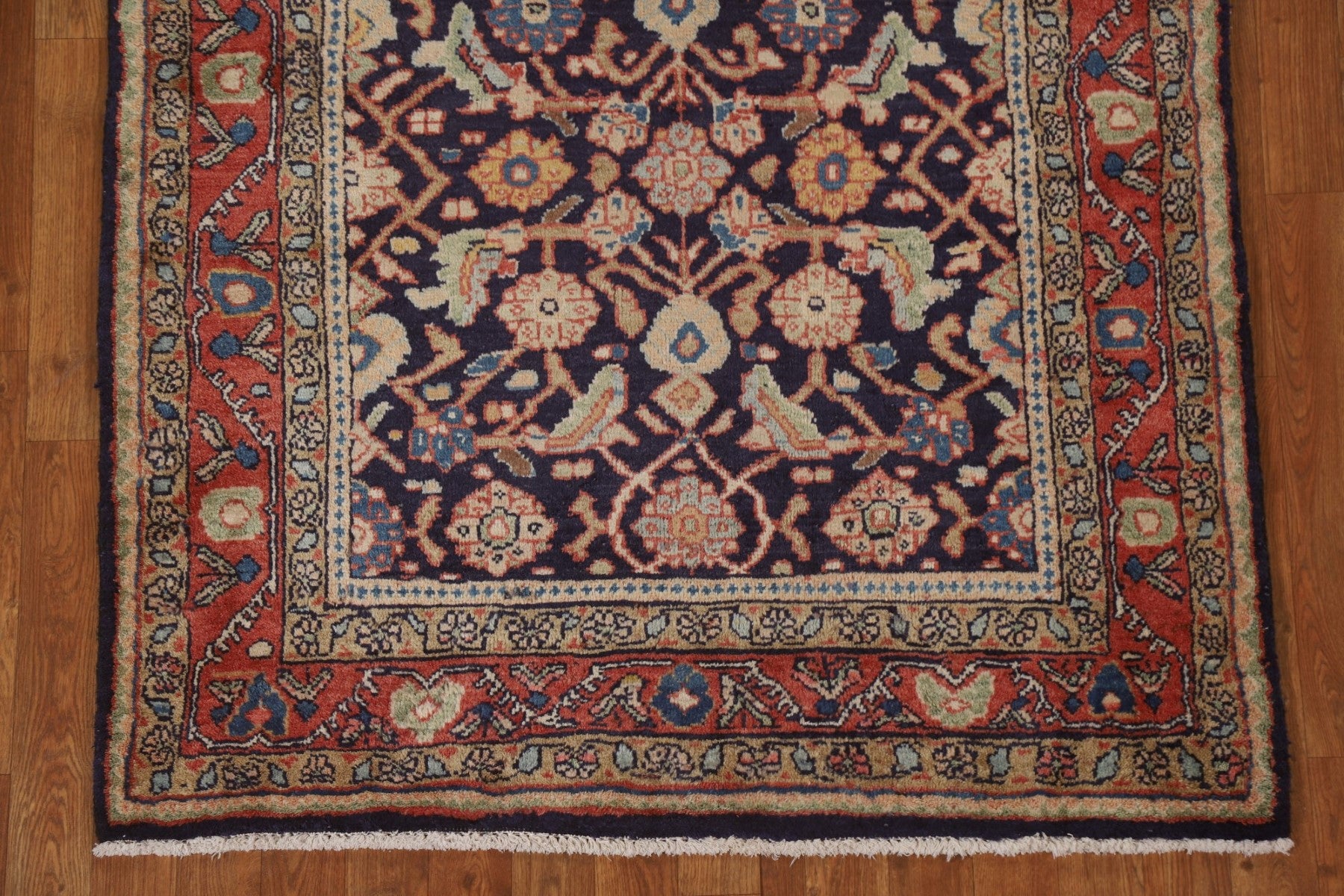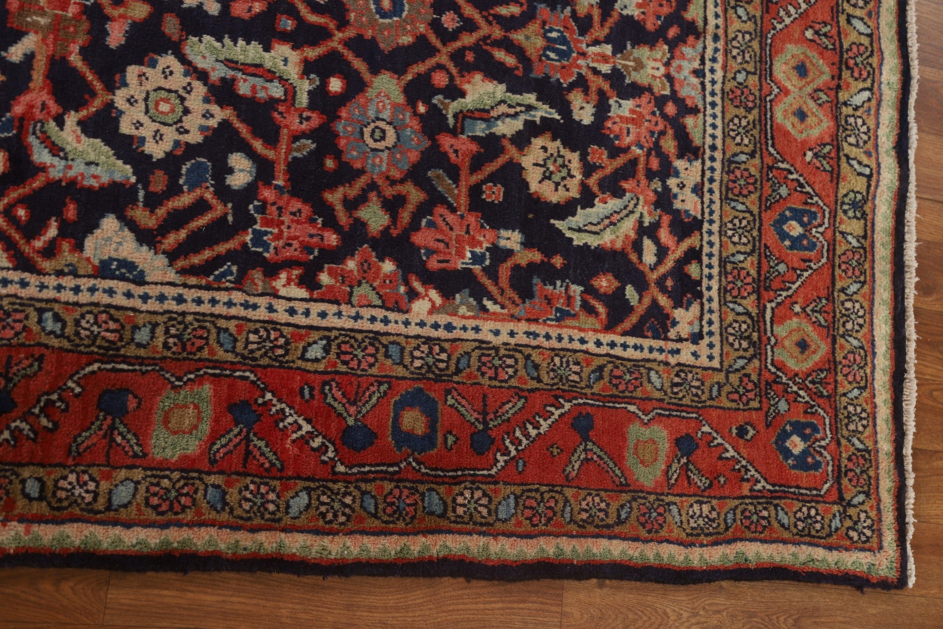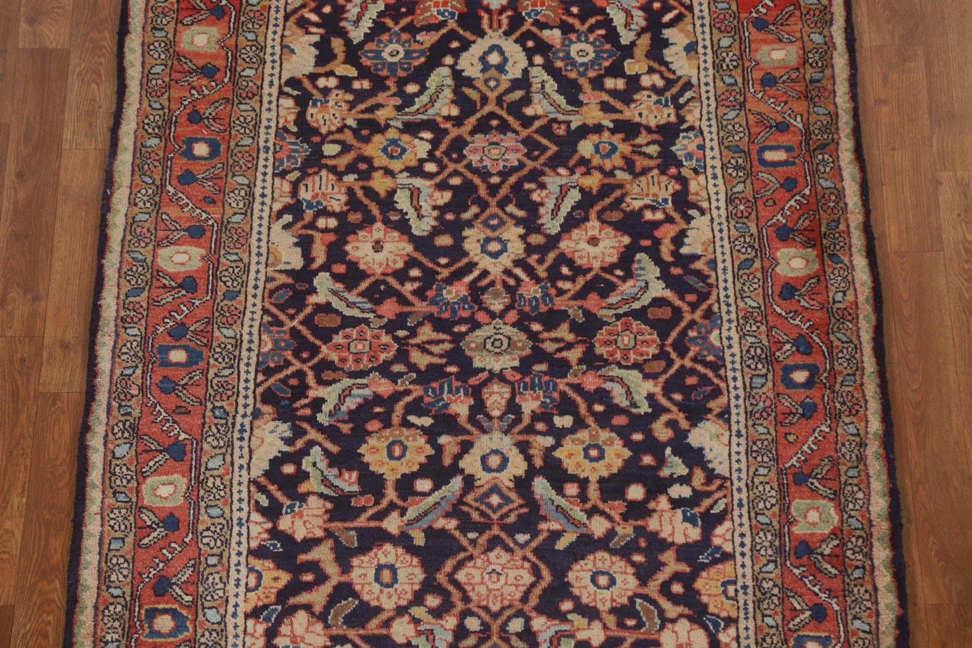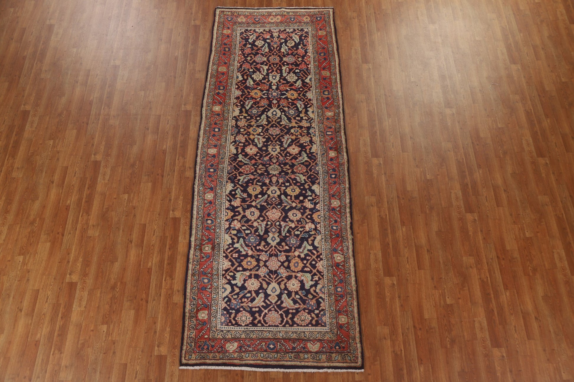 A Beautiful Genuine Persia ( Persia ) Mahal rug is Hand Knotted by skillful weavers in Persia ( Persia ) with 100% Wool Material. This rug is in Very Good condition. dimensions are 10' 11'' X 3' 11'' in foot and 333 X 119 in centimeter. the primary color is Navy Blue & Blues.