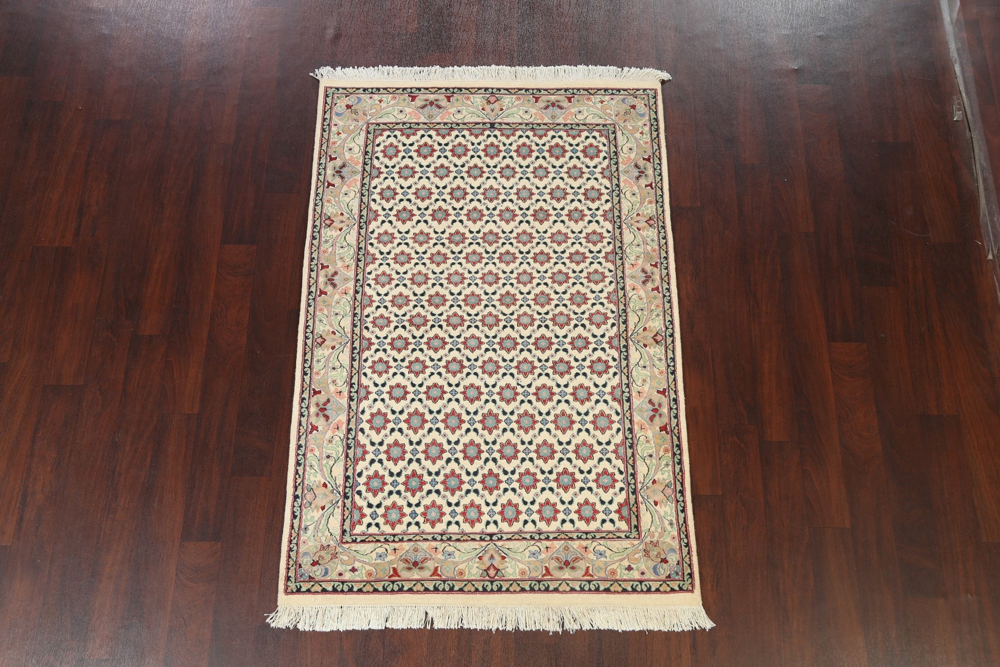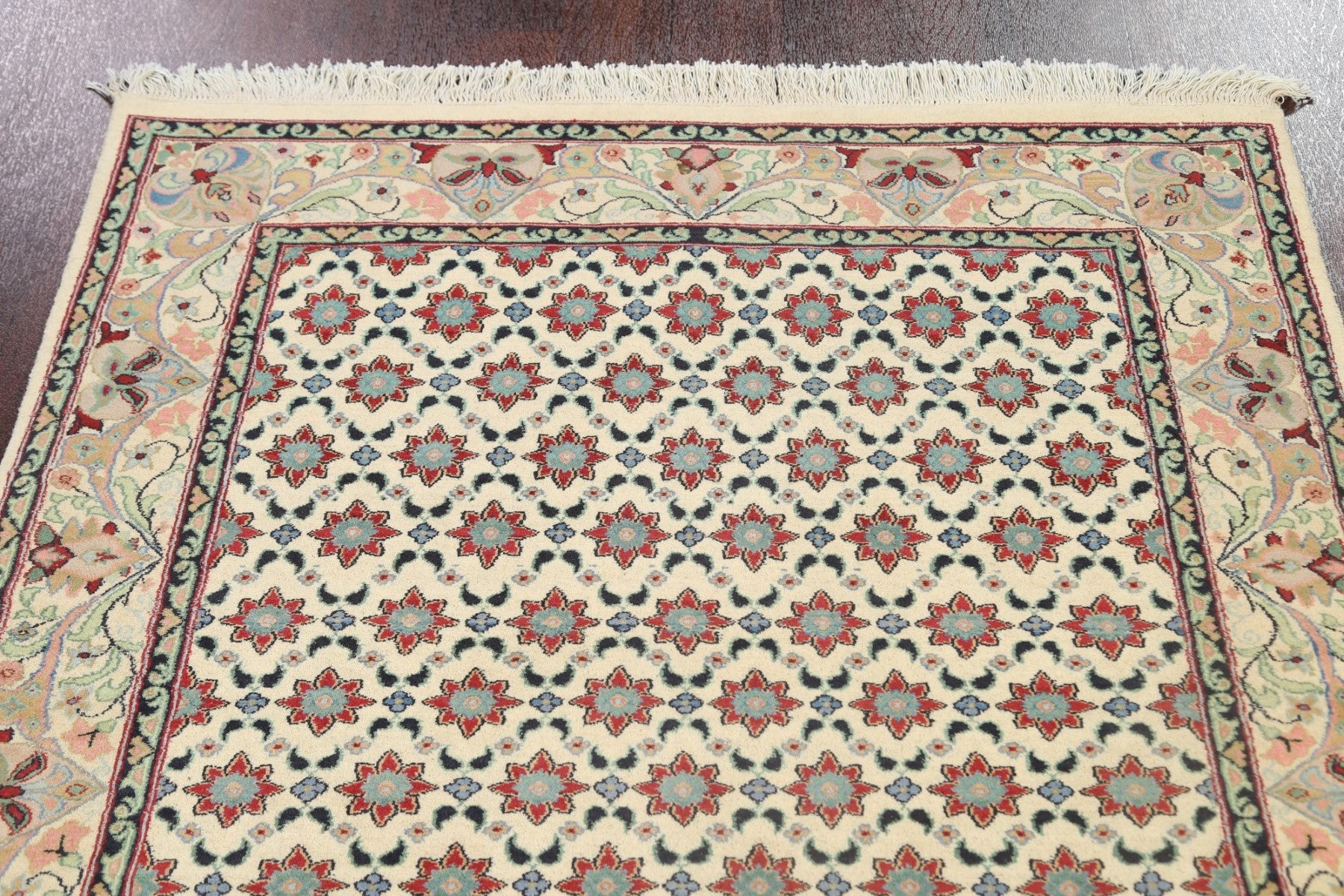A Beautiful Genuine Pakistan Tabriz rug is Hand Knotted by skillful weavers in Pakistan with Wool & Silk Material. This rug is in New, First Quality condition. dimensions are 6' 1'' X 4' 1'' in foot and 185 X 124 in centimeter. the primary color is Beige & Ivories.