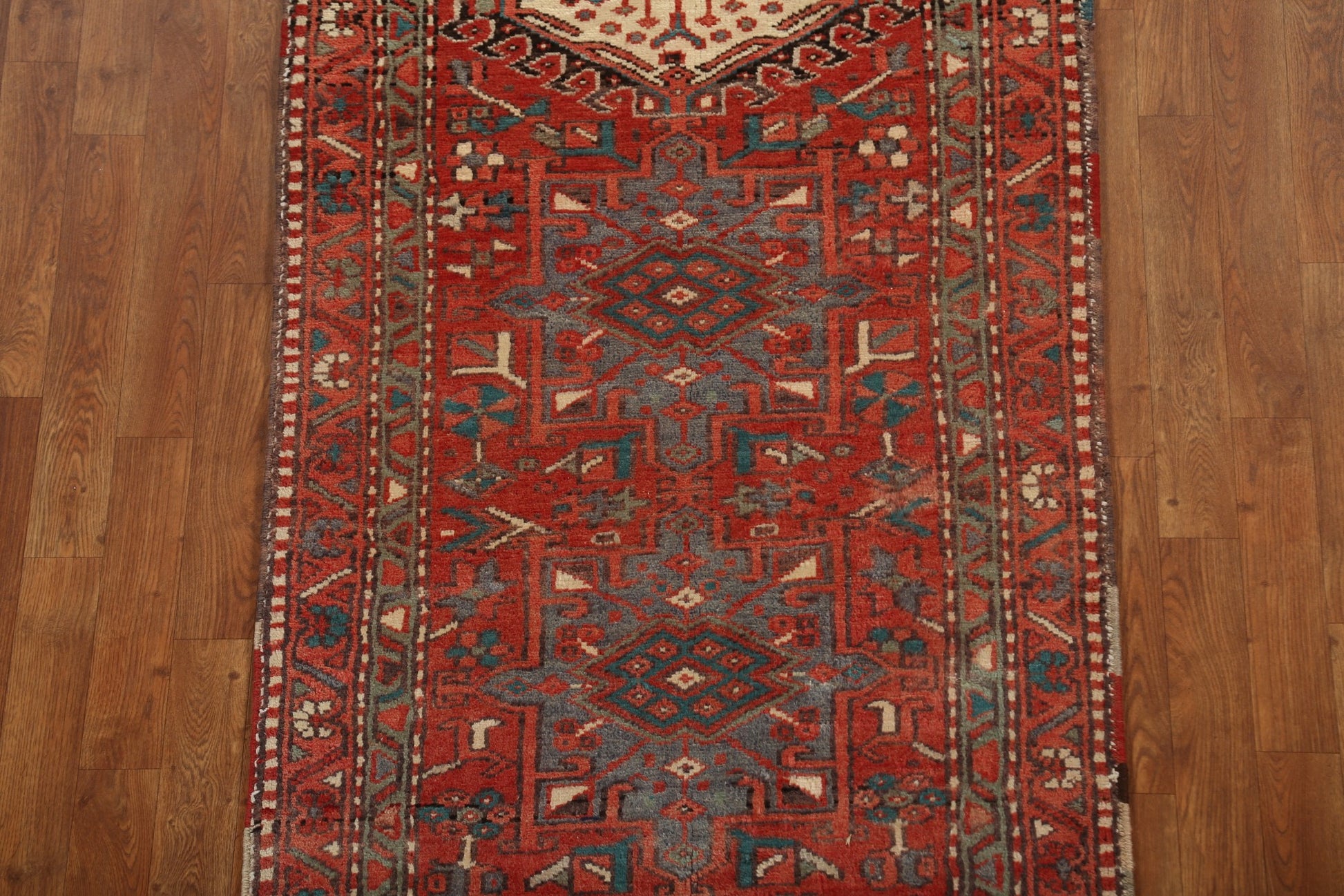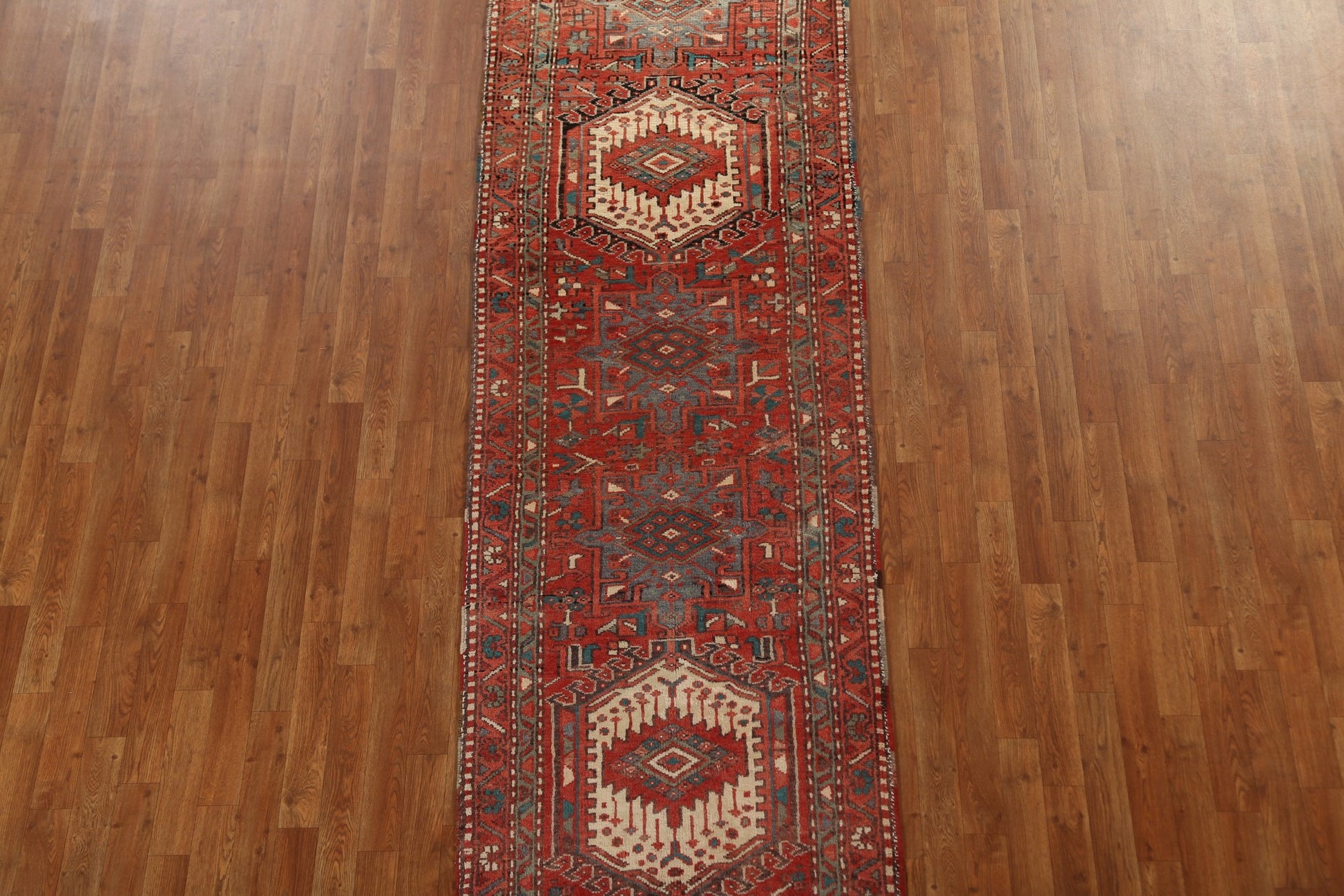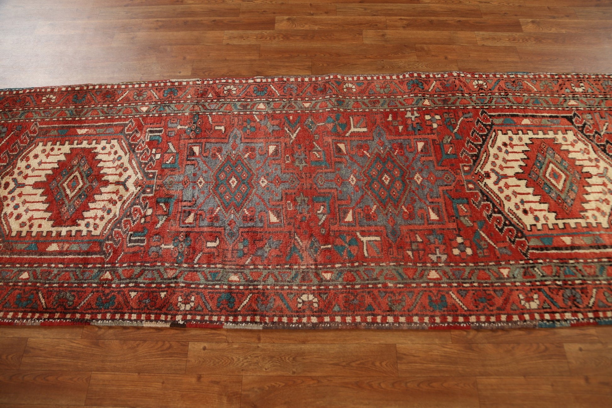 A Beautiful Genuine Persia ( Persia ) Gharajeh rug is Hand Knotted by skillful weavers in Persia ( Persia ) with 100% Wool Material. This rug is in Very Good condition. dimensions are 11' 0'' X 2' 11'' in foot and 335 X 89 in centimeter. the primary color is Red.