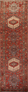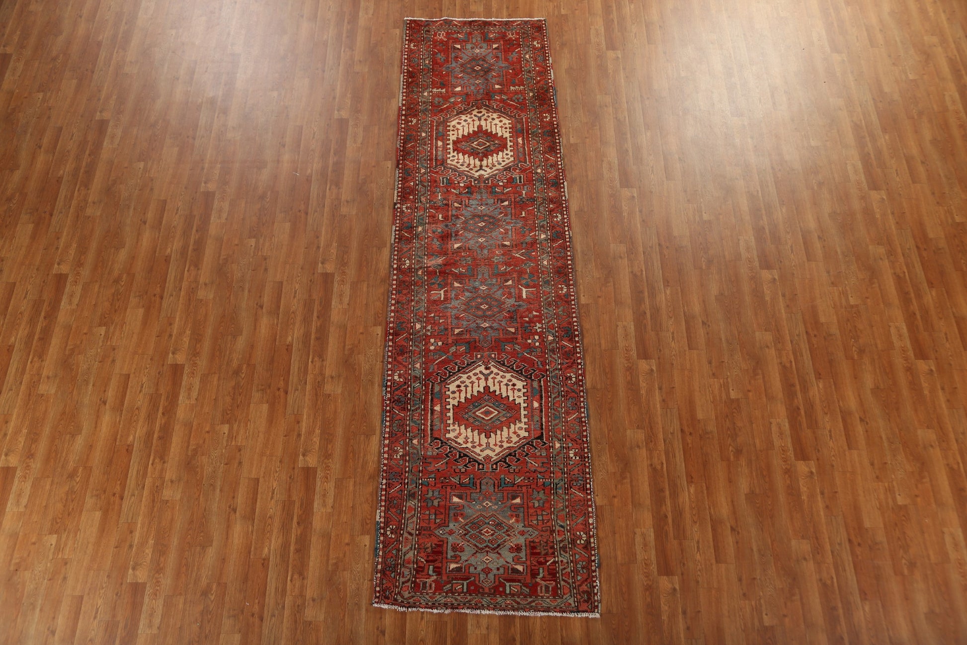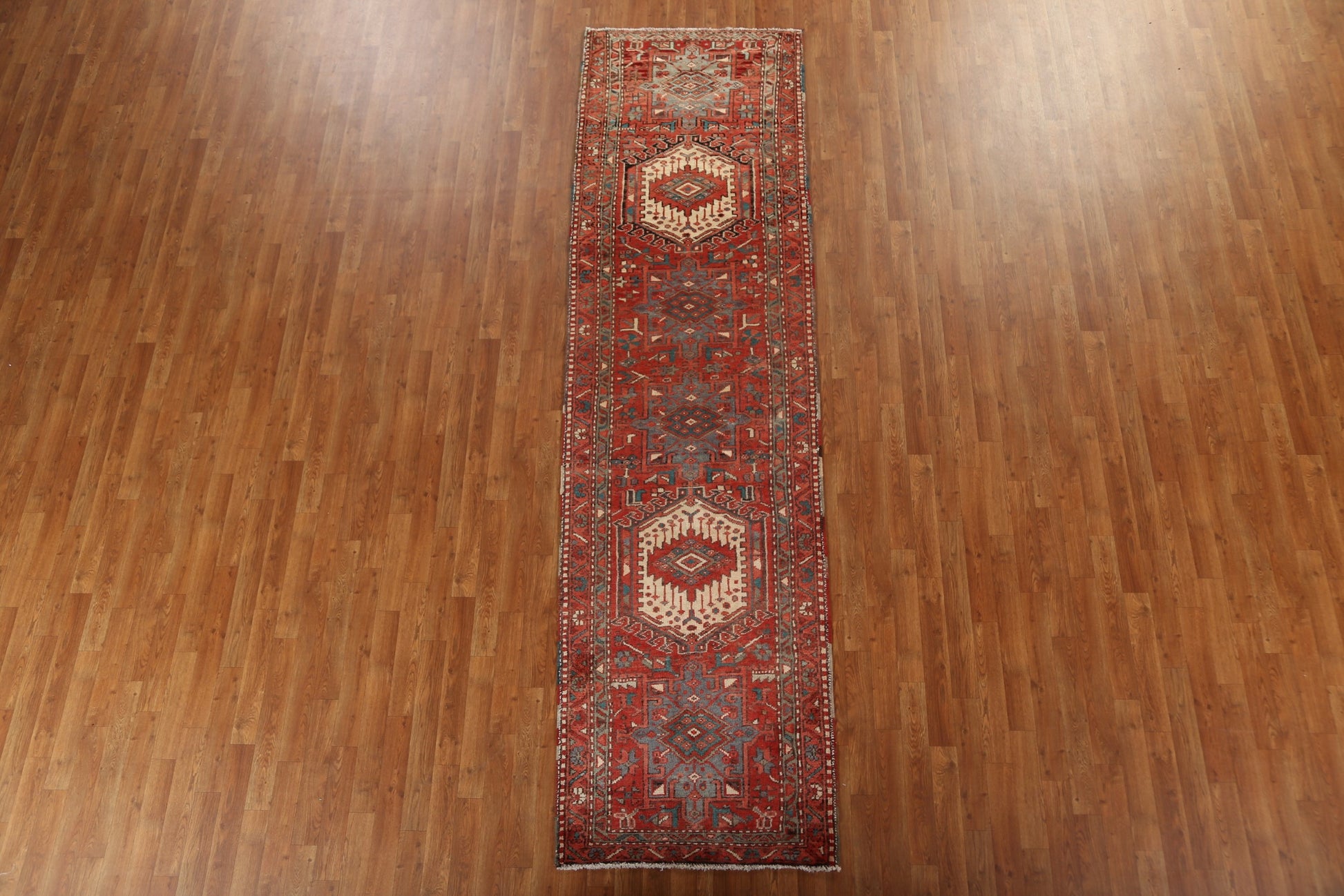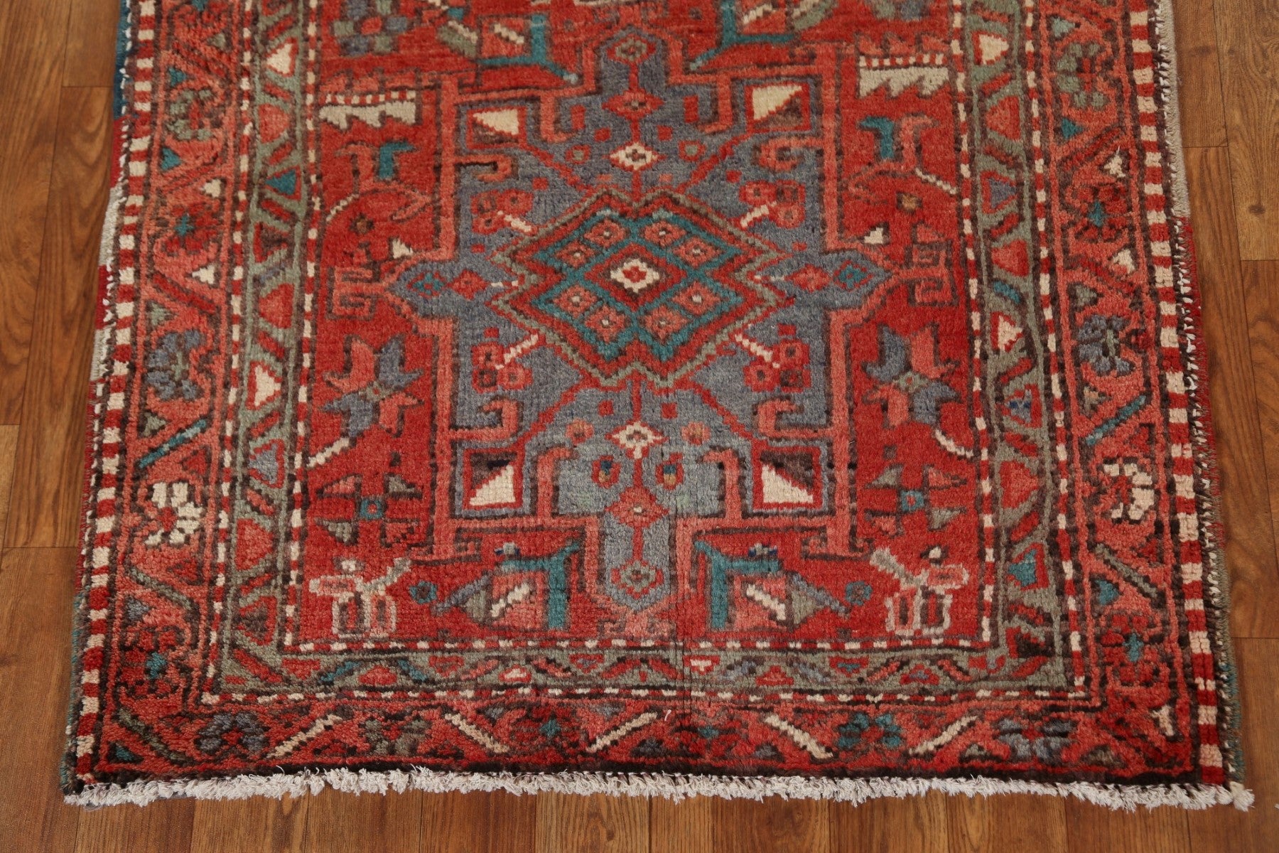 A Beautiful Genuine Persia ( Persia ) Gharajeh rug is Hand Knotted by skillful weavers in Persia ( Persia ) with 100% Wool Material. This rug is in Very Good condition. dimensions are 11' 0'' X 2' 11'' in foot and 335 X 89 in centimeter. the primary color is Red.