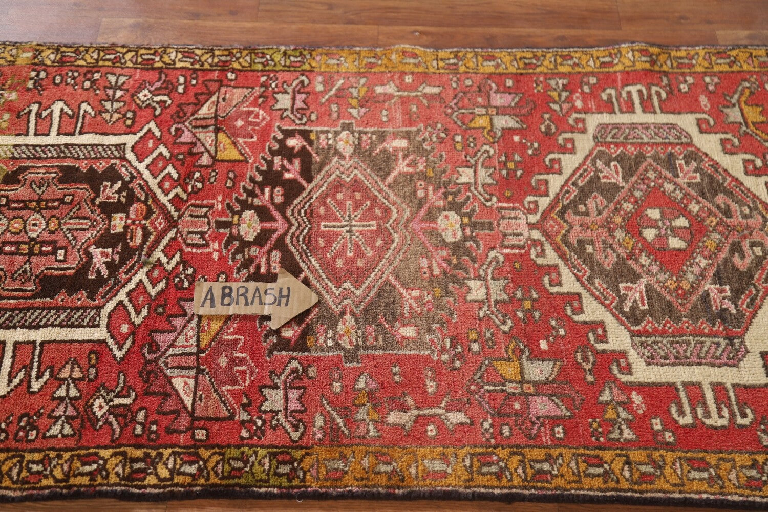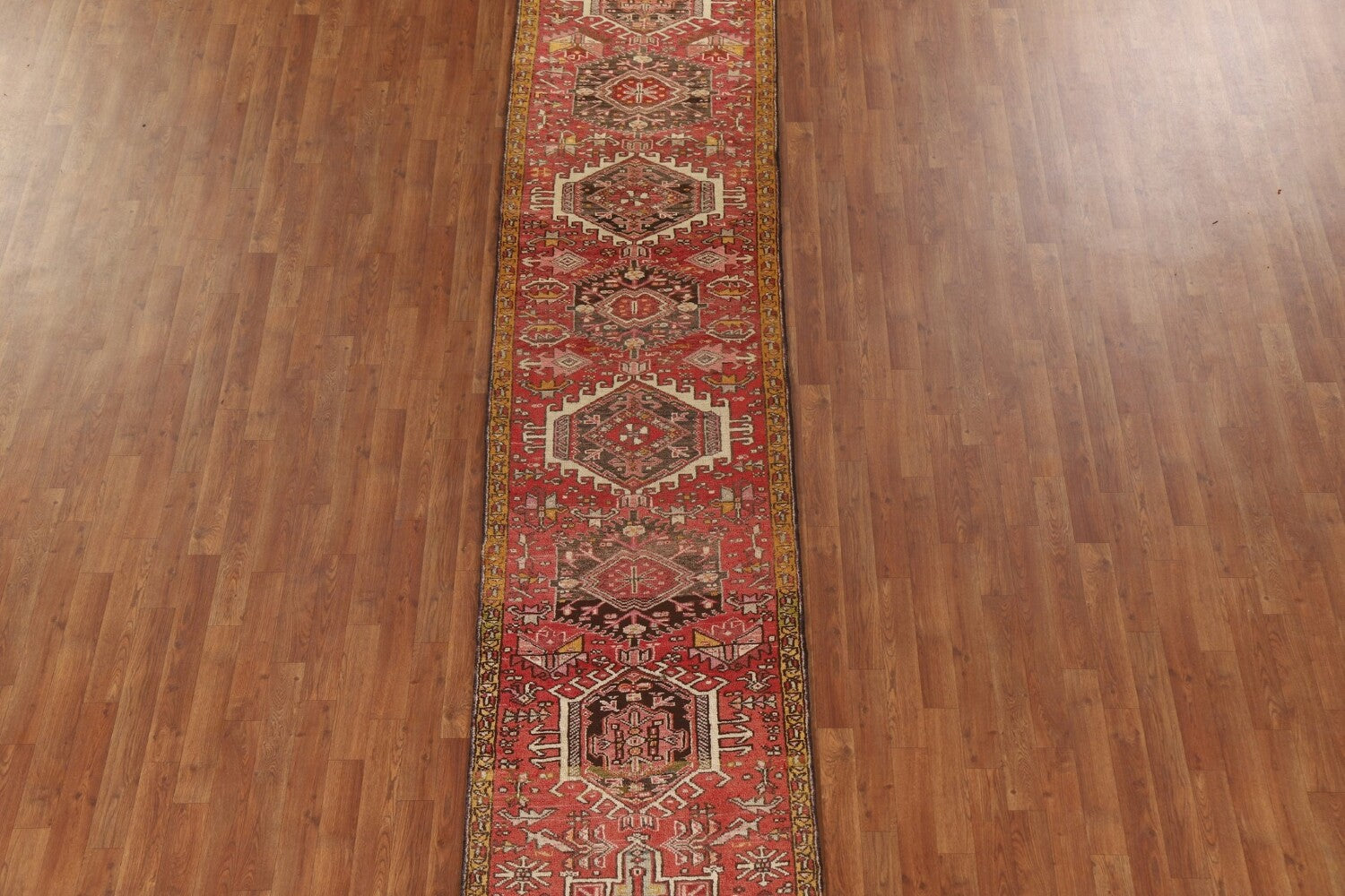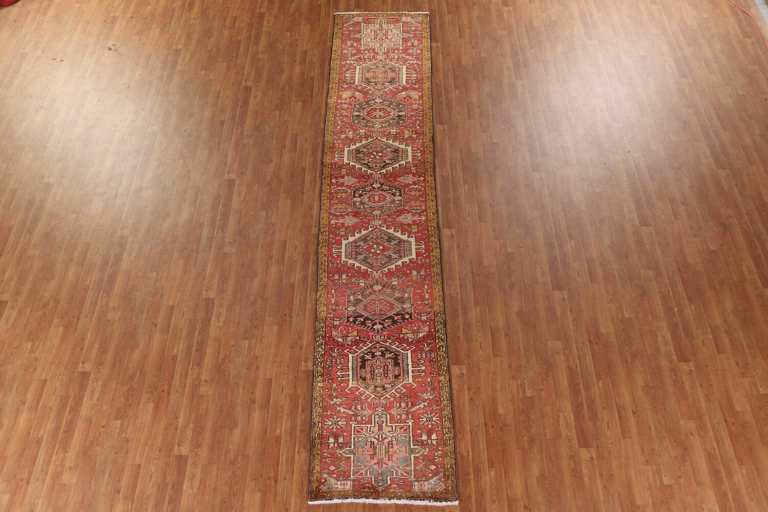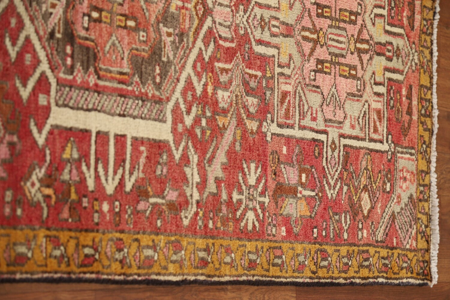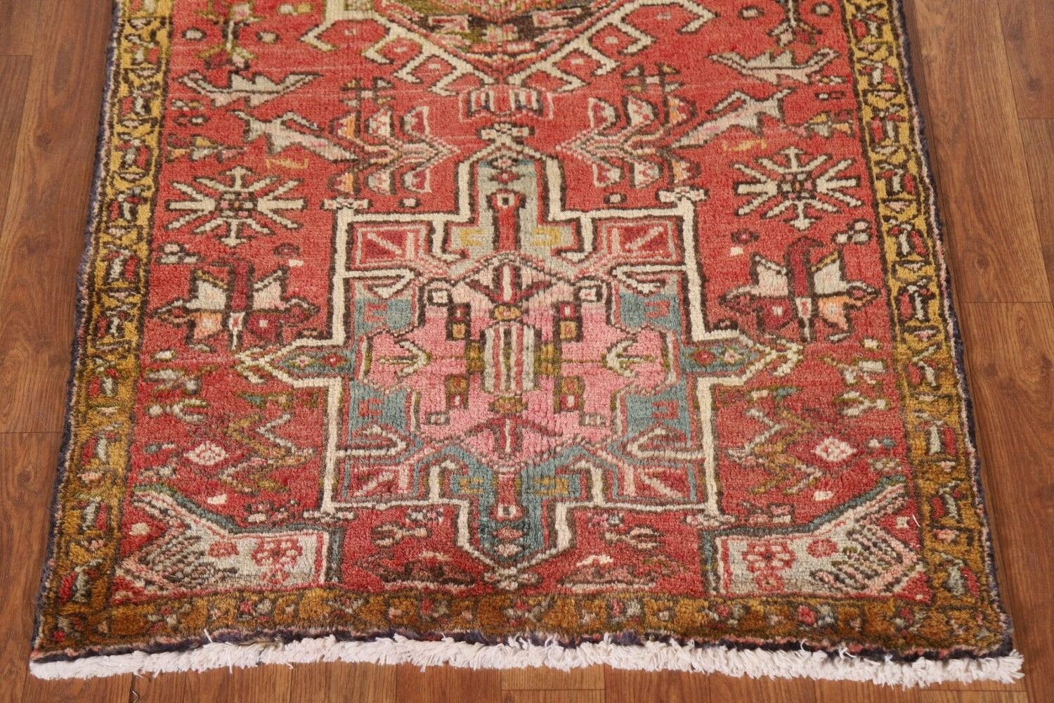 A Beautiful Genuine Persia ( Persia ) Gharajeh rug is Hand Knotted by skillful weavers in Persia ( Persia ) with 100% Wool Material. This rug is in Very Good (Abrash) condition. dimensions are 13' 7'' X 2' 8'' in foot and 414 X 81 in centimeter. the primary color is Pink.