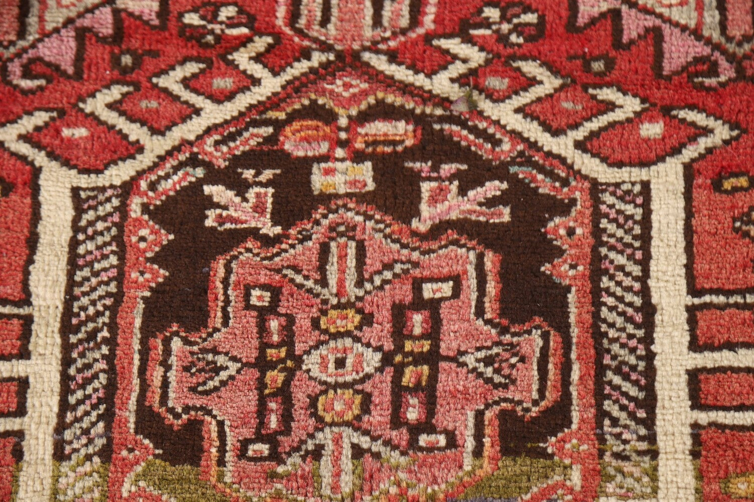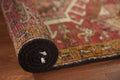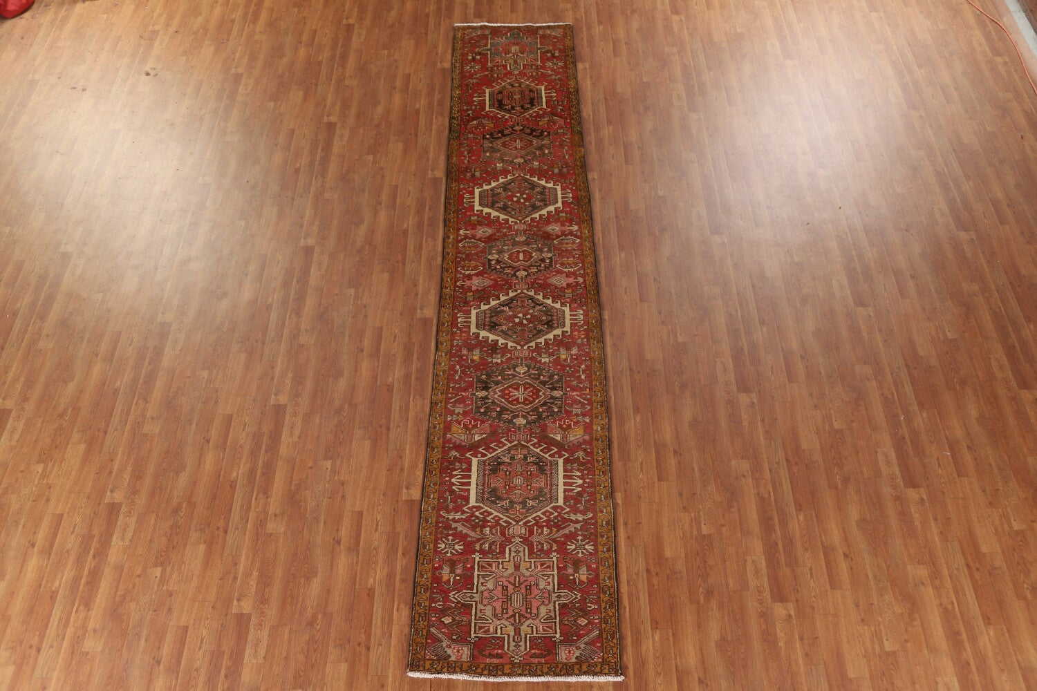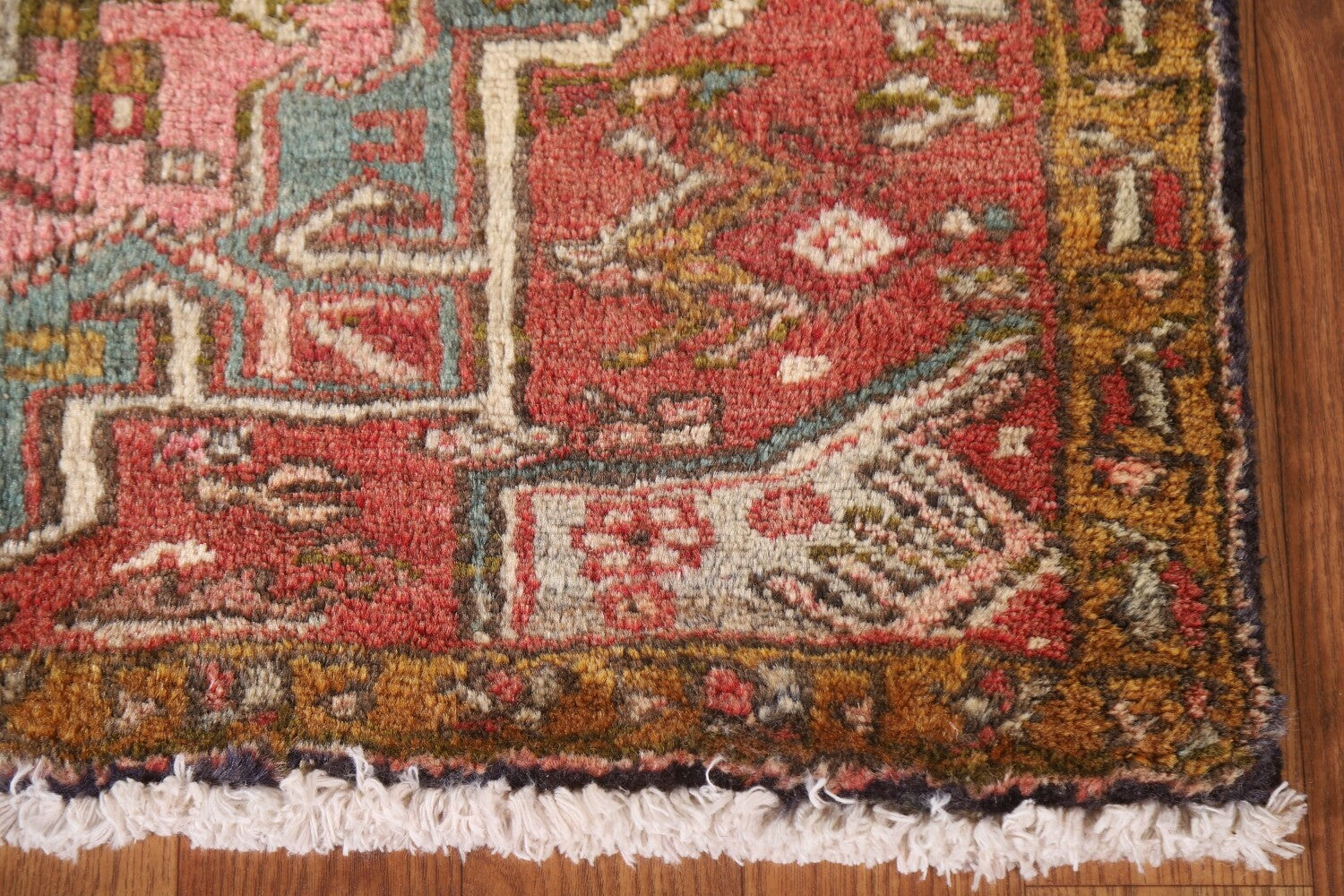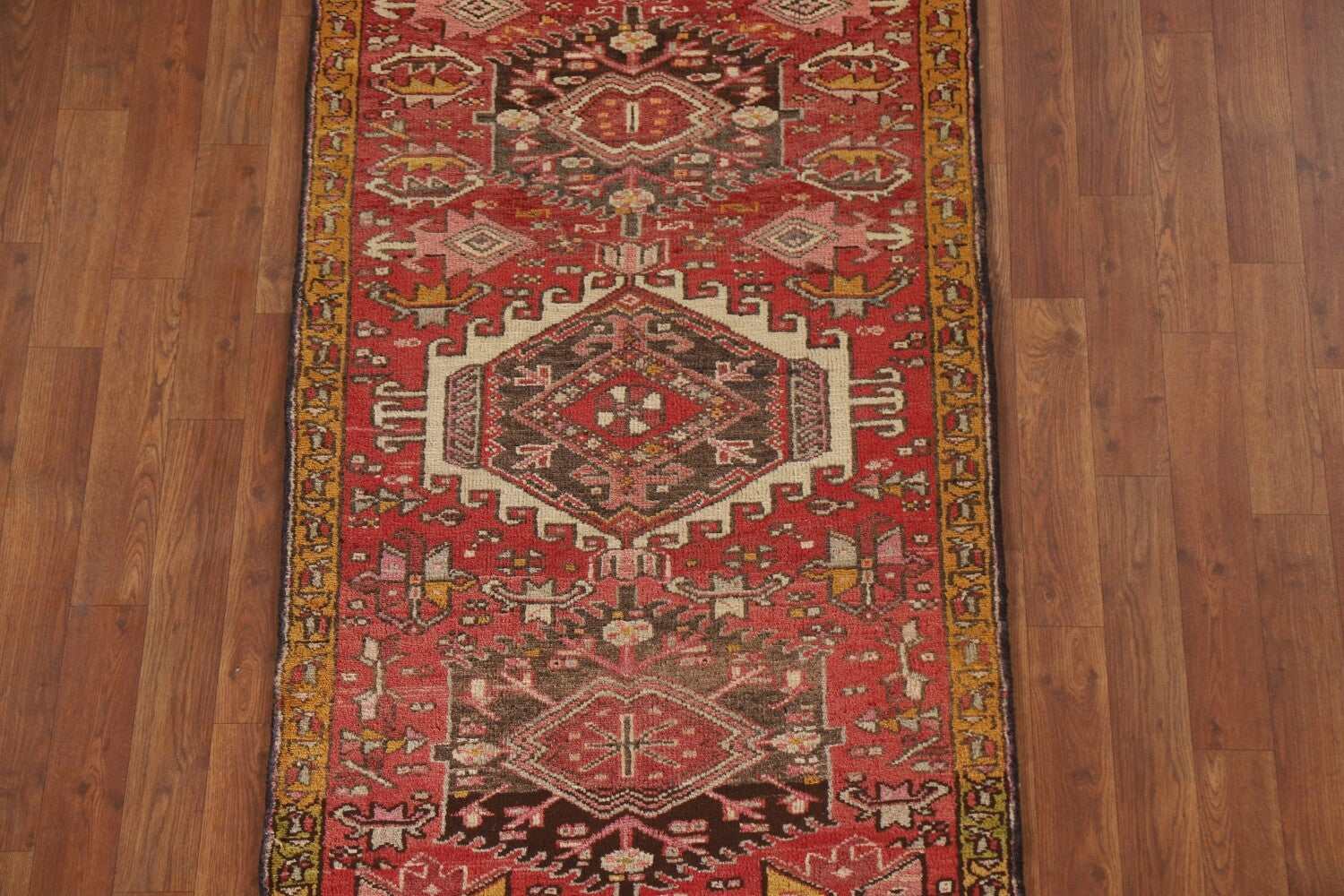 A Beautiful Genuine Persia ( Persia ) Gharajeh rug is Hand Knotted by skillful weavers in Persia ( Persia ) with 100% Wool Material. This rug is in Very Good (Abrash) condition. dimensions are 13' 7'' X 2' 8'' in foot and 414 X 81 in centimeter. the primary color is Pink.