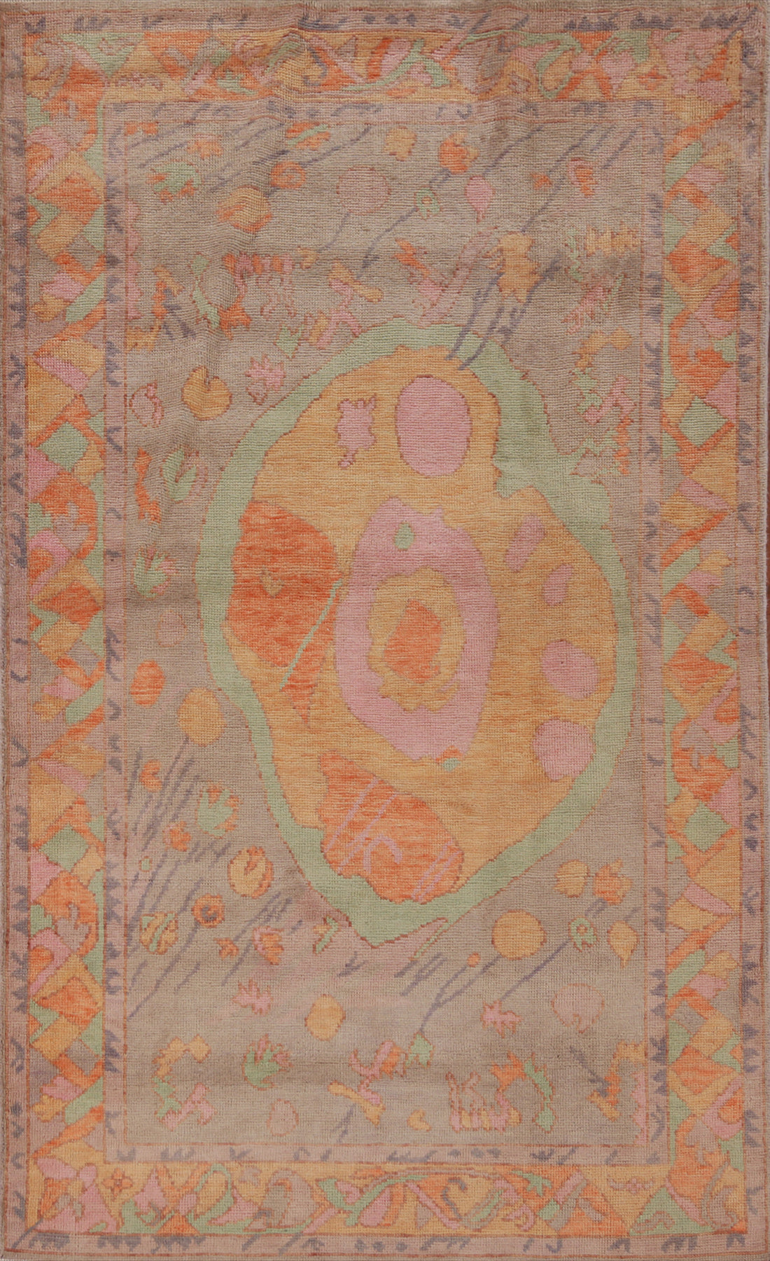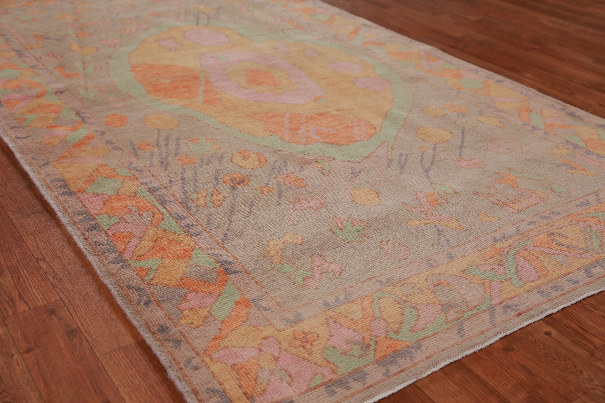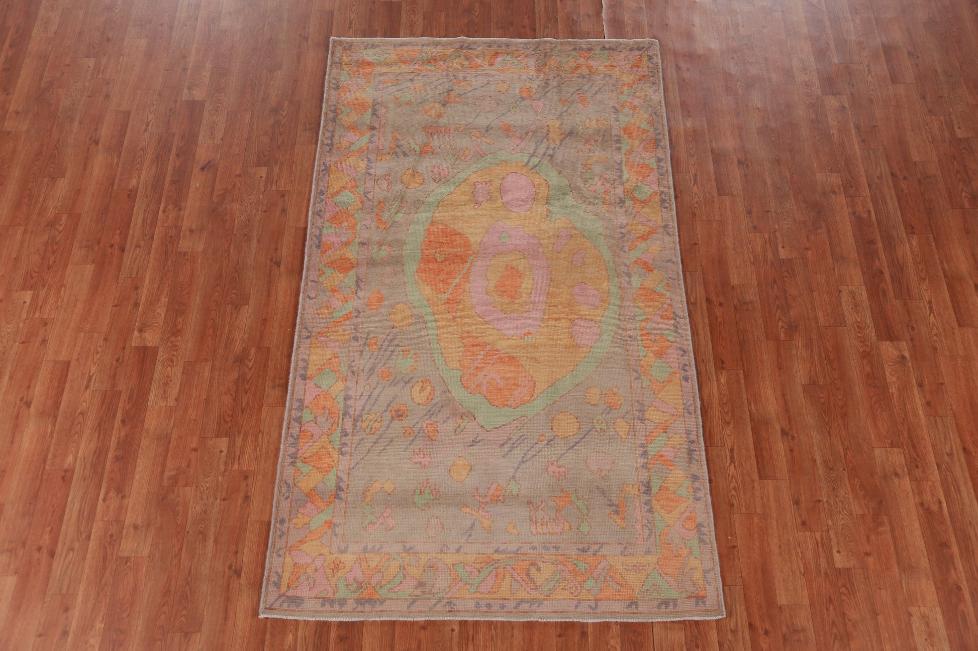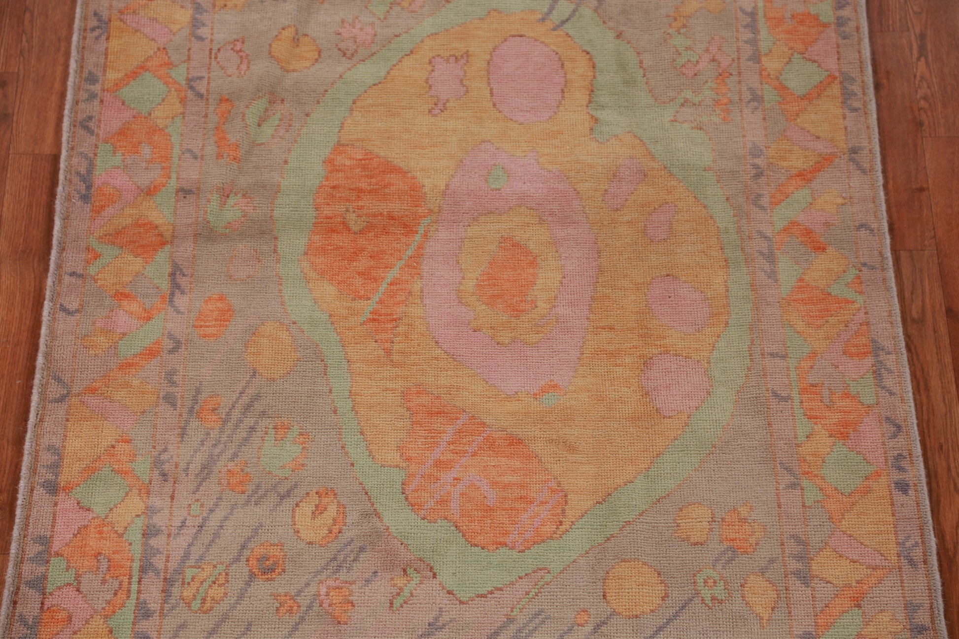 A Beautiful Genuine Turkey Oushak rug is Hand Knotted by skillful weavers in Turkey with 100% Wool Material. This rug is in New, First Quality condition. dimensions are 7' 0'' X 4' 0'' in foot and 213 X 122 in centimeter. the primary color is Oranges & Rust.