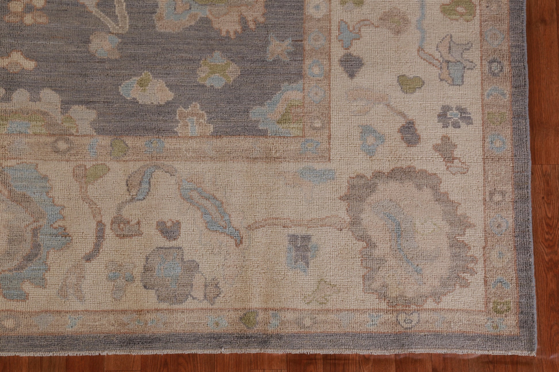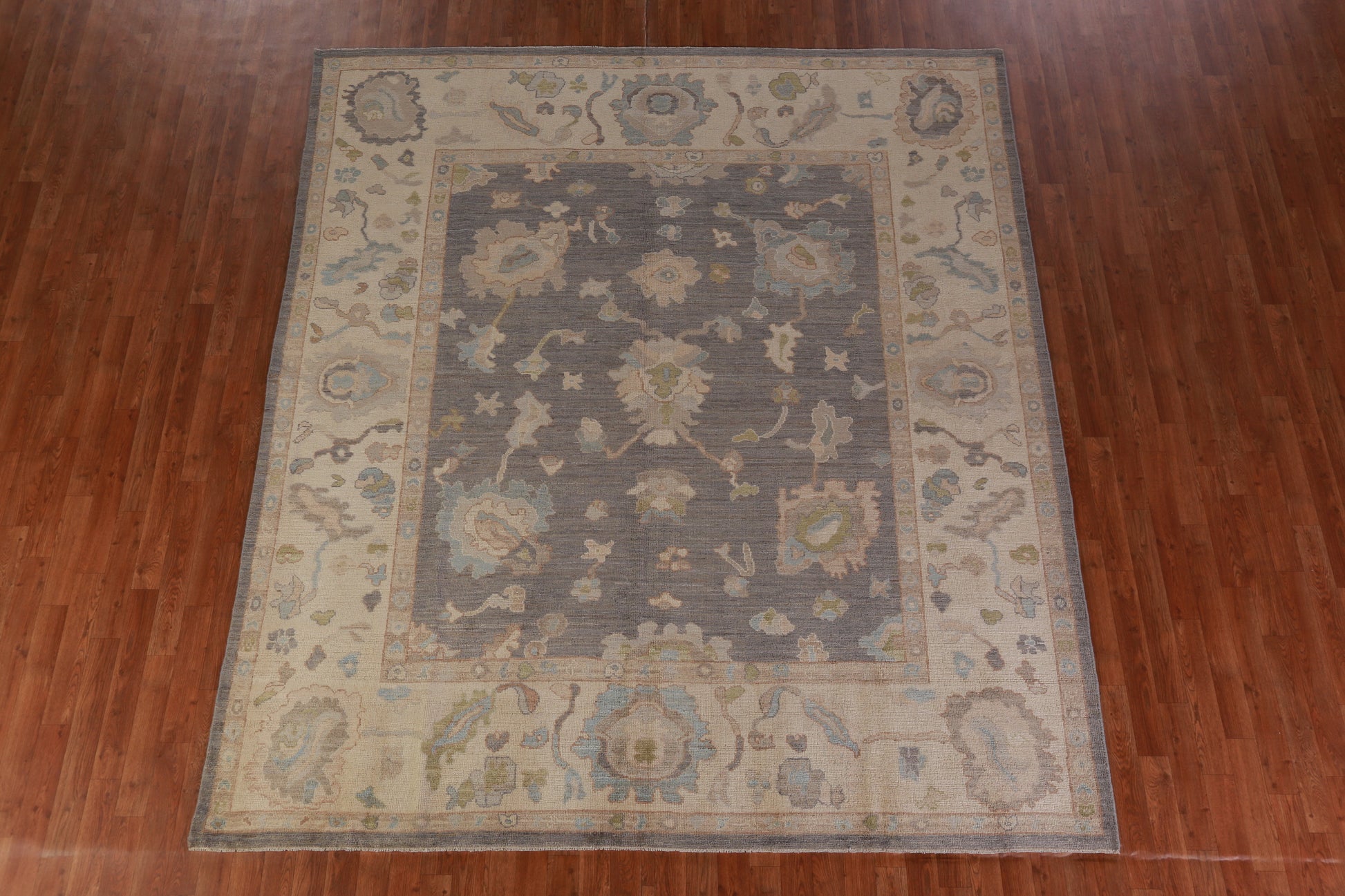 A Beautiful Genuine Turkey Oushak rug is Hand Knotted by skillful weavers in Turkey with 100% Wool Material. This rug is in New, First Quality condition. dimensions are 9' 5'' X 8' 2'' in foot and 287 X 249 in centimeter. the primary color is Greys & Charcoal.