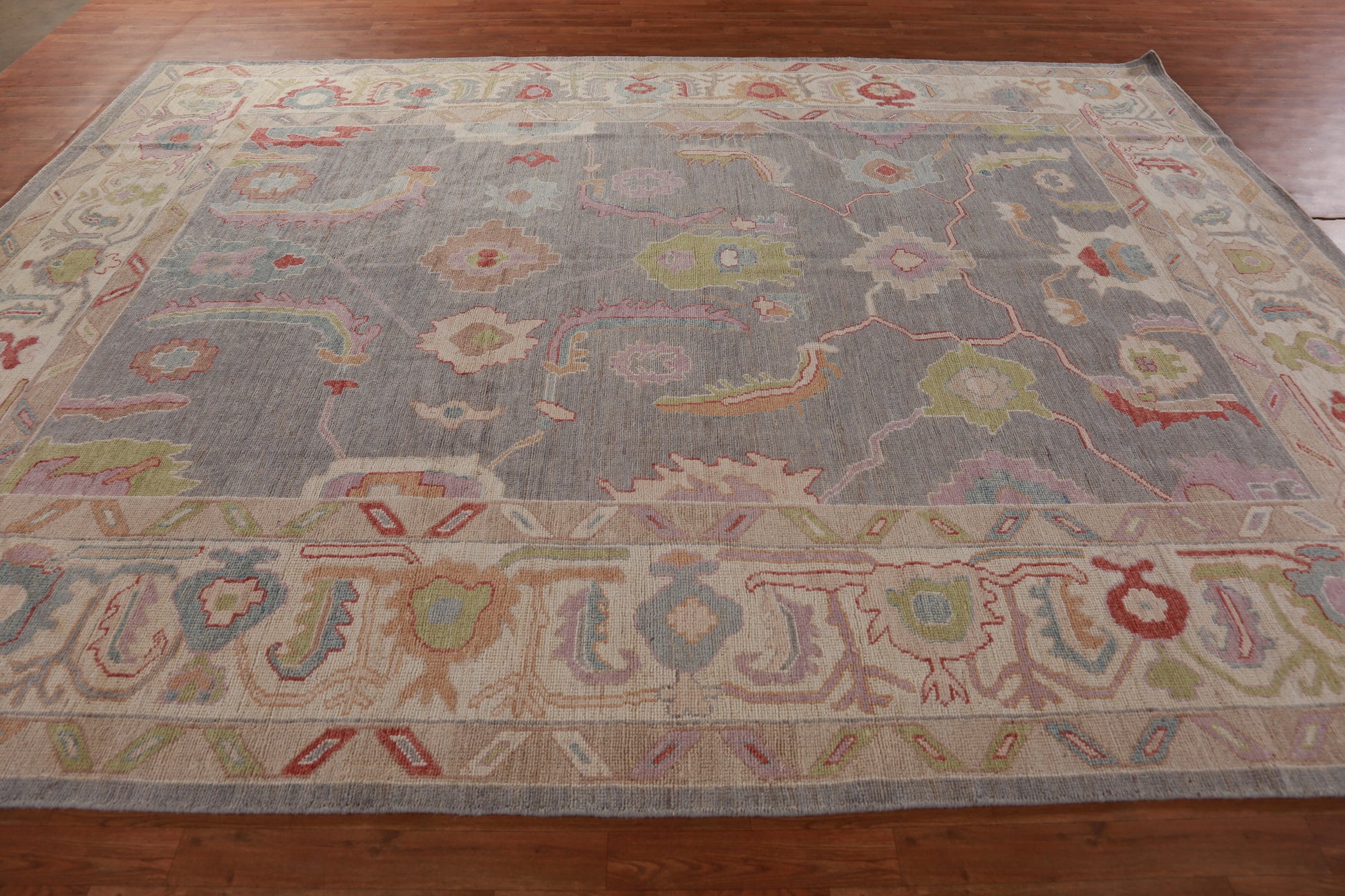 A Beautiful Genuine Turkey Oushak rug is Hand Knotted by skillful weavers in Turkey with 100% Wool Material. This rug is in New, First Quality condition. dimensions are 11' 10'' X 9' 1'' in foot and 361 X 277 in centimeter. the primary color is Greys & Charcoal.