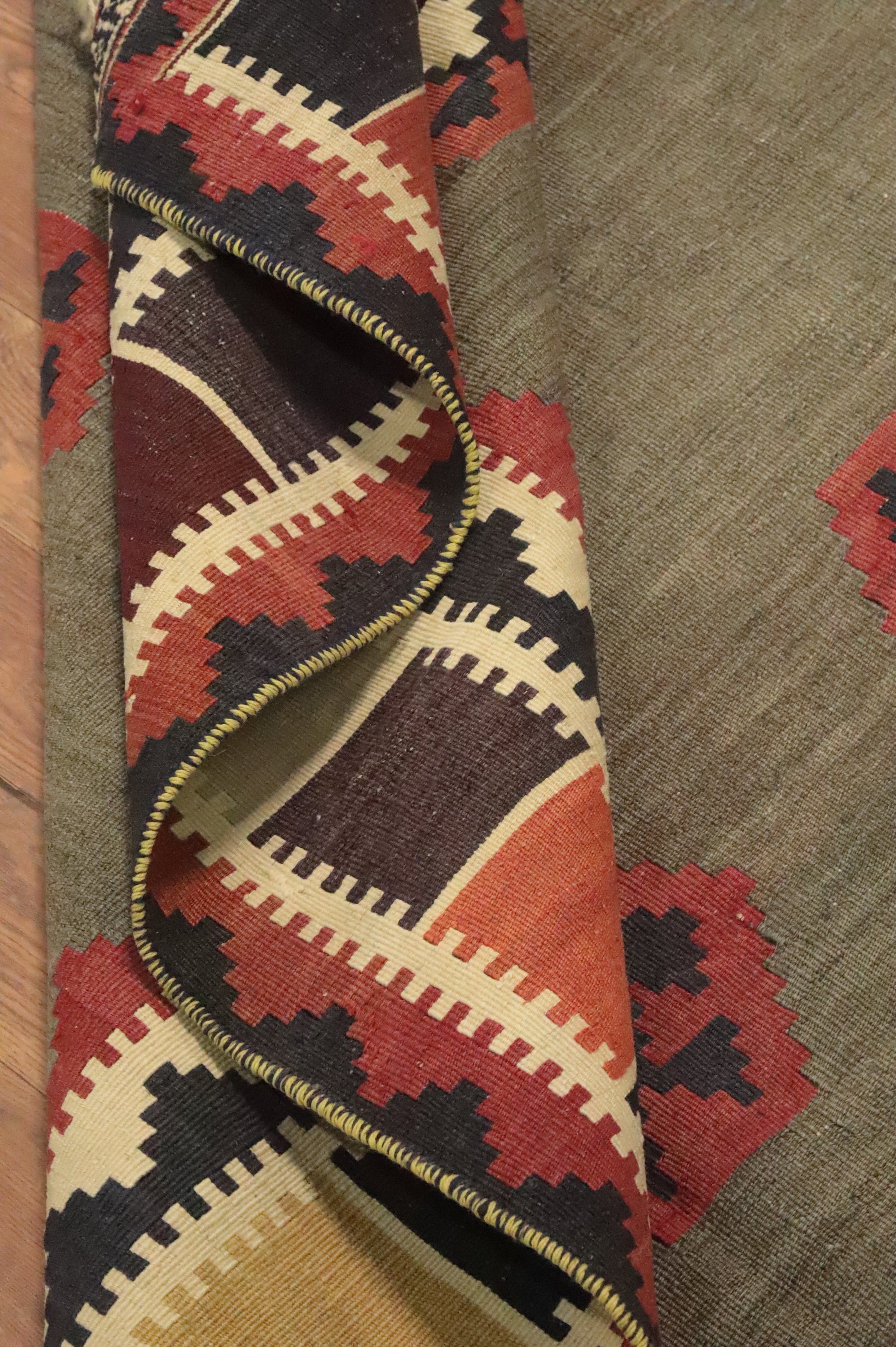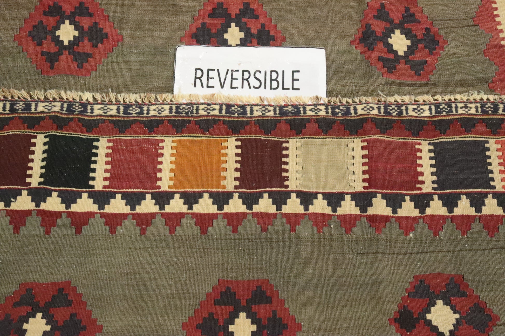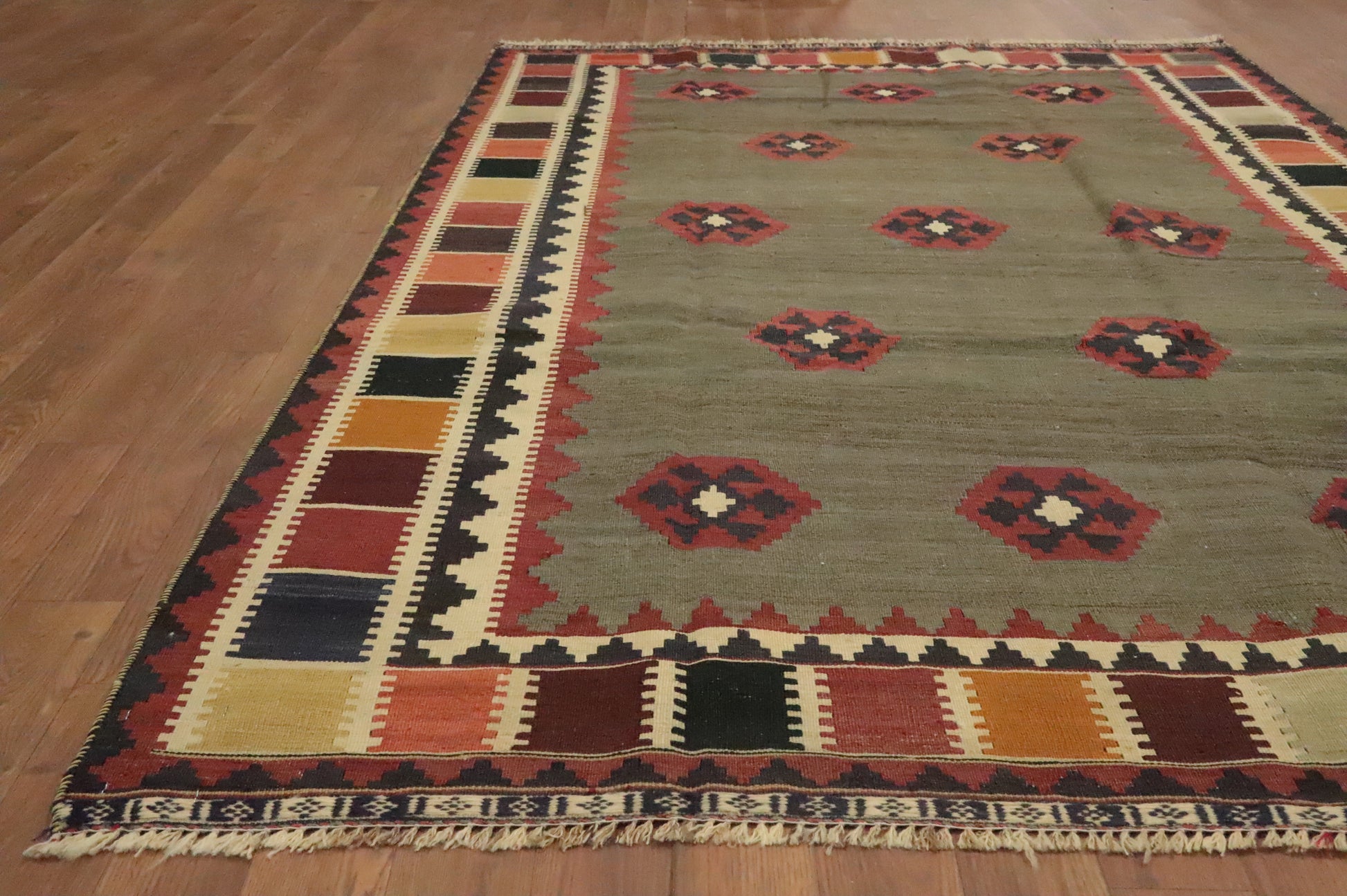 A Beautiful Genuine Persia ( Persia ) Kilim (Qashqai) rug is Hand Woven by skillful weavers in Persia ( Persia ) with 100% Wool Material. This rug is in Very Good (Abrash-Stain) condition. dimensions are 6' 11'' X 4' 7'' in foot and 211 X 140 in centimeter. the primary color is Green.