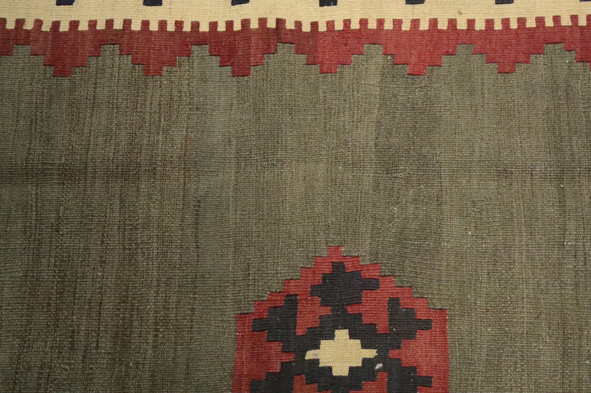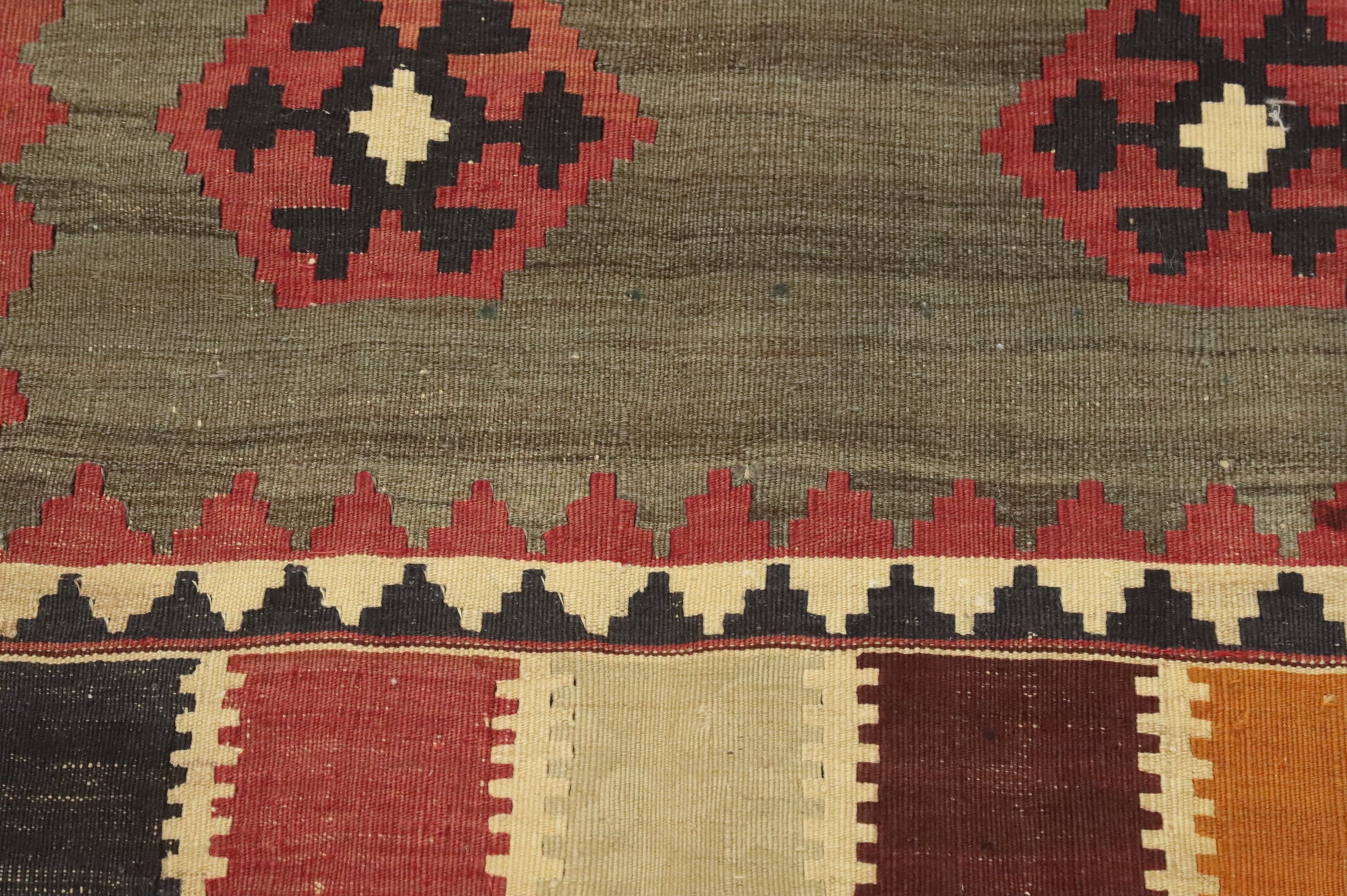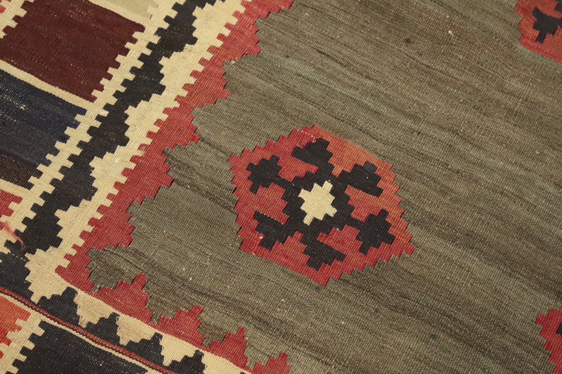 A Beautiful Genuine Persia ( Persia ) Kilim (Qashqai) rug is Hand Woven by skillful weavers in Persia ( Persia ) with 100% Wool Material. This rug is in Very Good (Abrash-Stain) condition. dimensions are 6' 11'' X 4' 7'' in foot and 211 X 140 in centimeter. the primary color is Green.