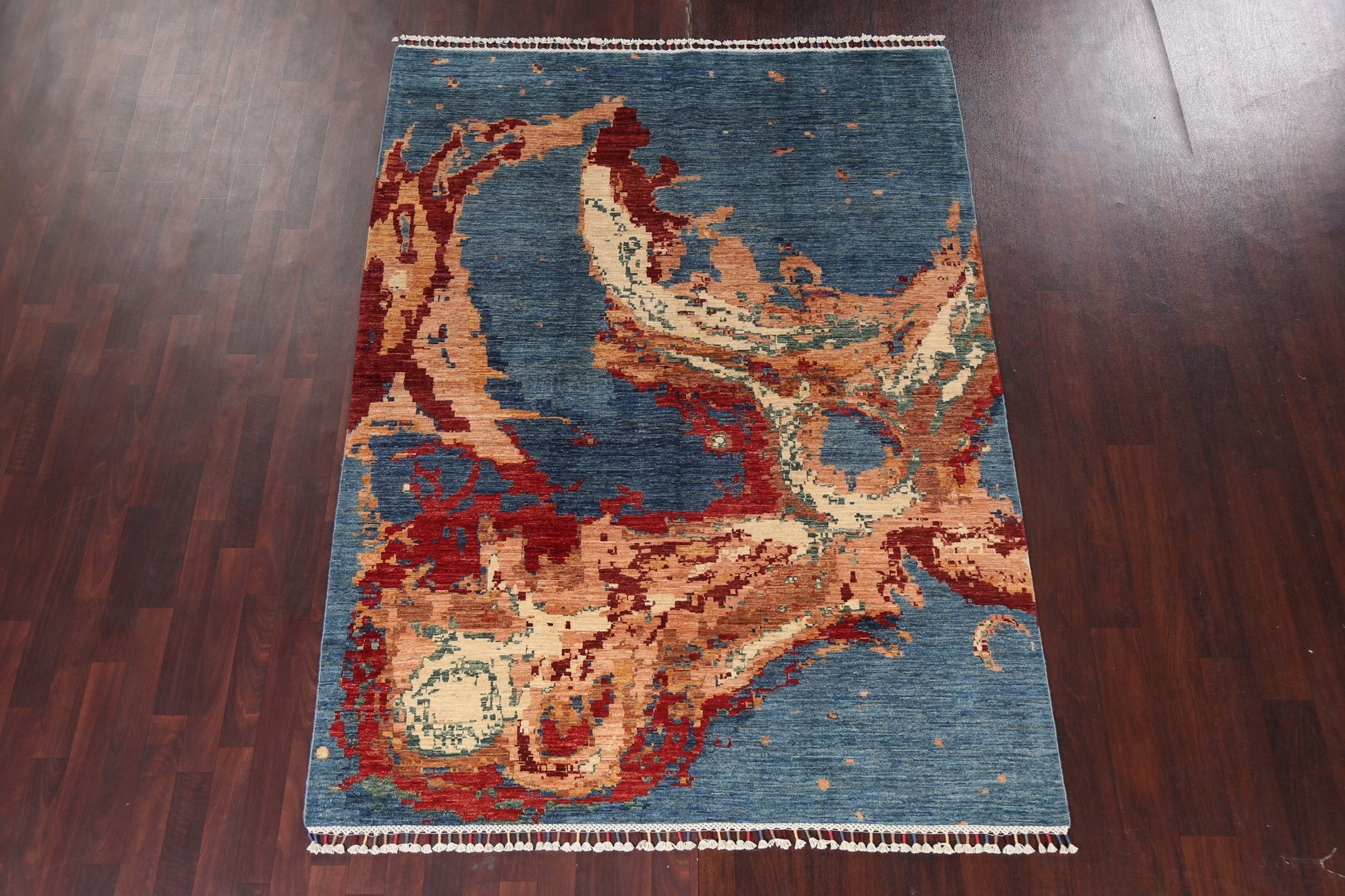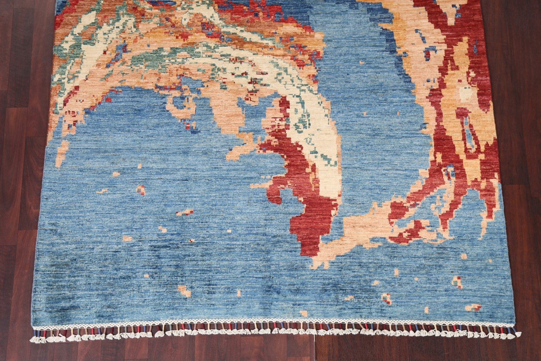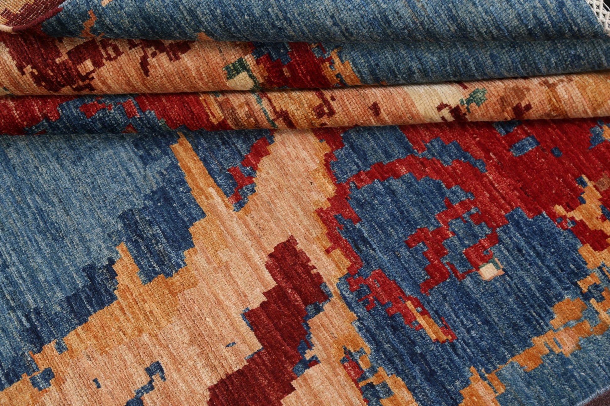 A Beautiful Genuine Pakistan Abstract rug is Hand Knotted by skillful weavers in Pakistan with 100% Wool Material. This rug is in New, First Quality condition. dimensions are 7' 10'' X 5' 8'' in foot and  239 X 173 in centimeter. the primary color is Navy Blue & Blues.