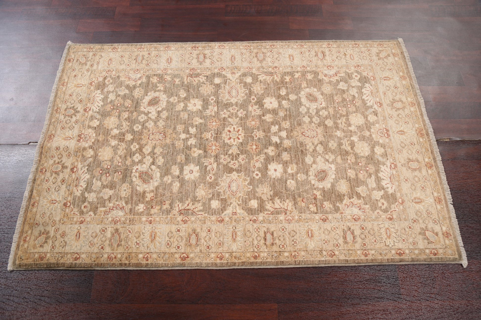 A Beautiful Genuine Pakistan Chobi-Peshawar rug is Hand Knotted by skillful weavers in Pakistan with 100% Wool Material. This rug is in New, First Quality condition. dimensions are 4' 11'' X 3' 2'' in foot and 150 X 97 in centimeter. the primary color is Brown.