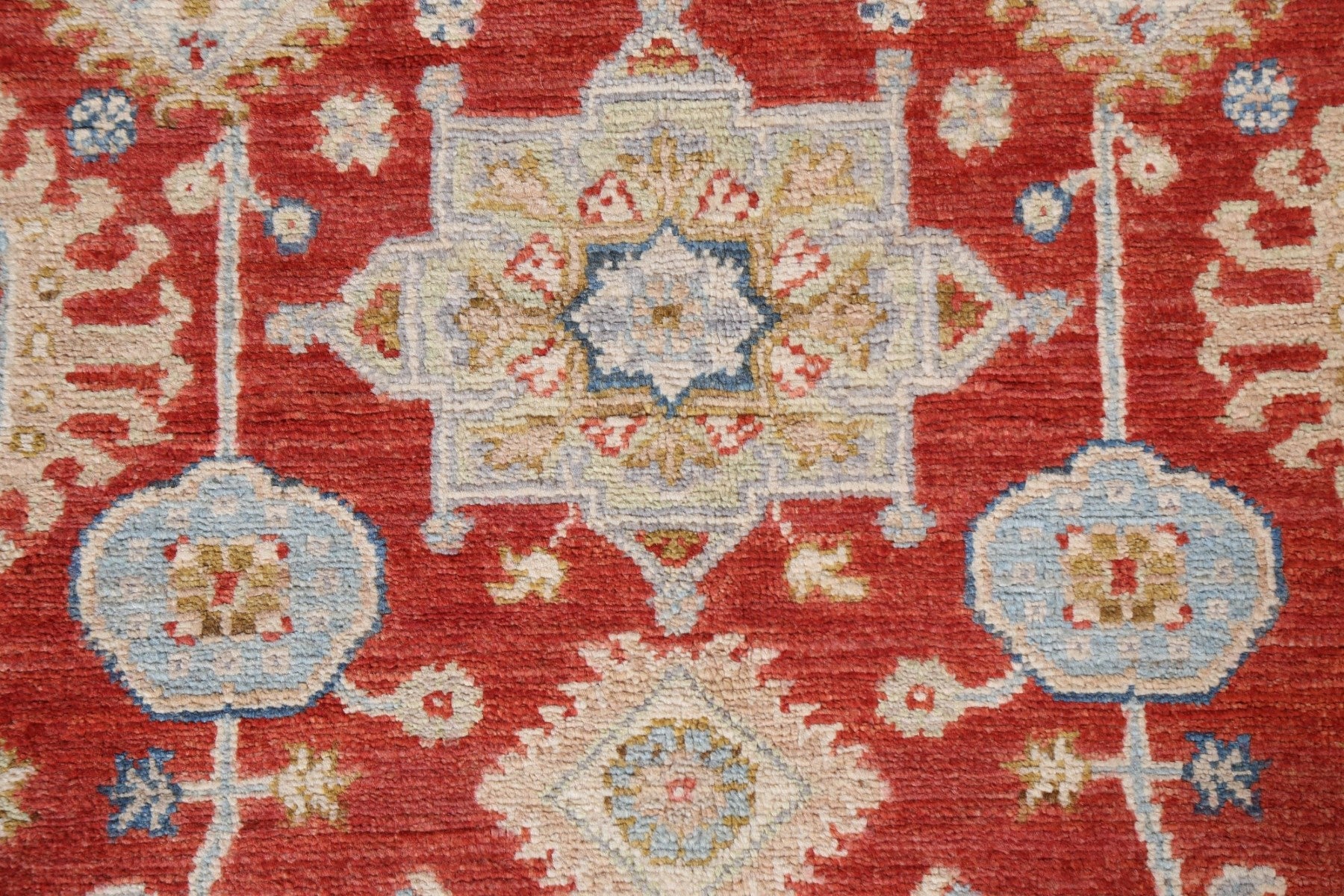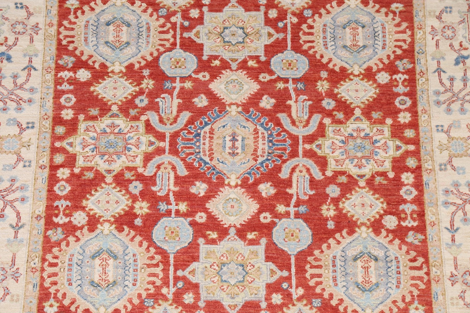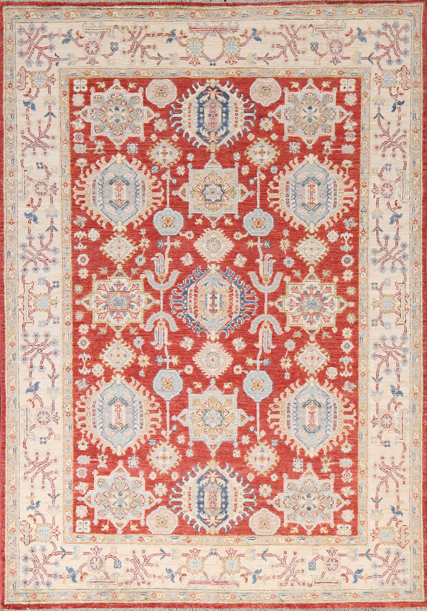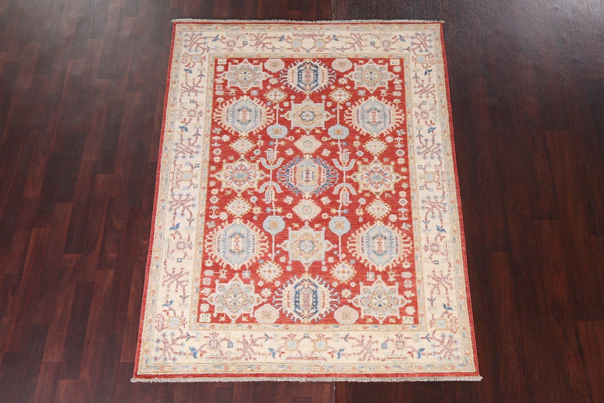 A Beautiful Genuine Pakistan Heriz rug is Hand Knotted by skillful weavers in Pakistan with 100% Wool Material. This rug is in New, First Quality condition. dimensions are 6' 5'' X 4' 10'' in foot and 196 X 147 in centimeter. the primary color is Red.