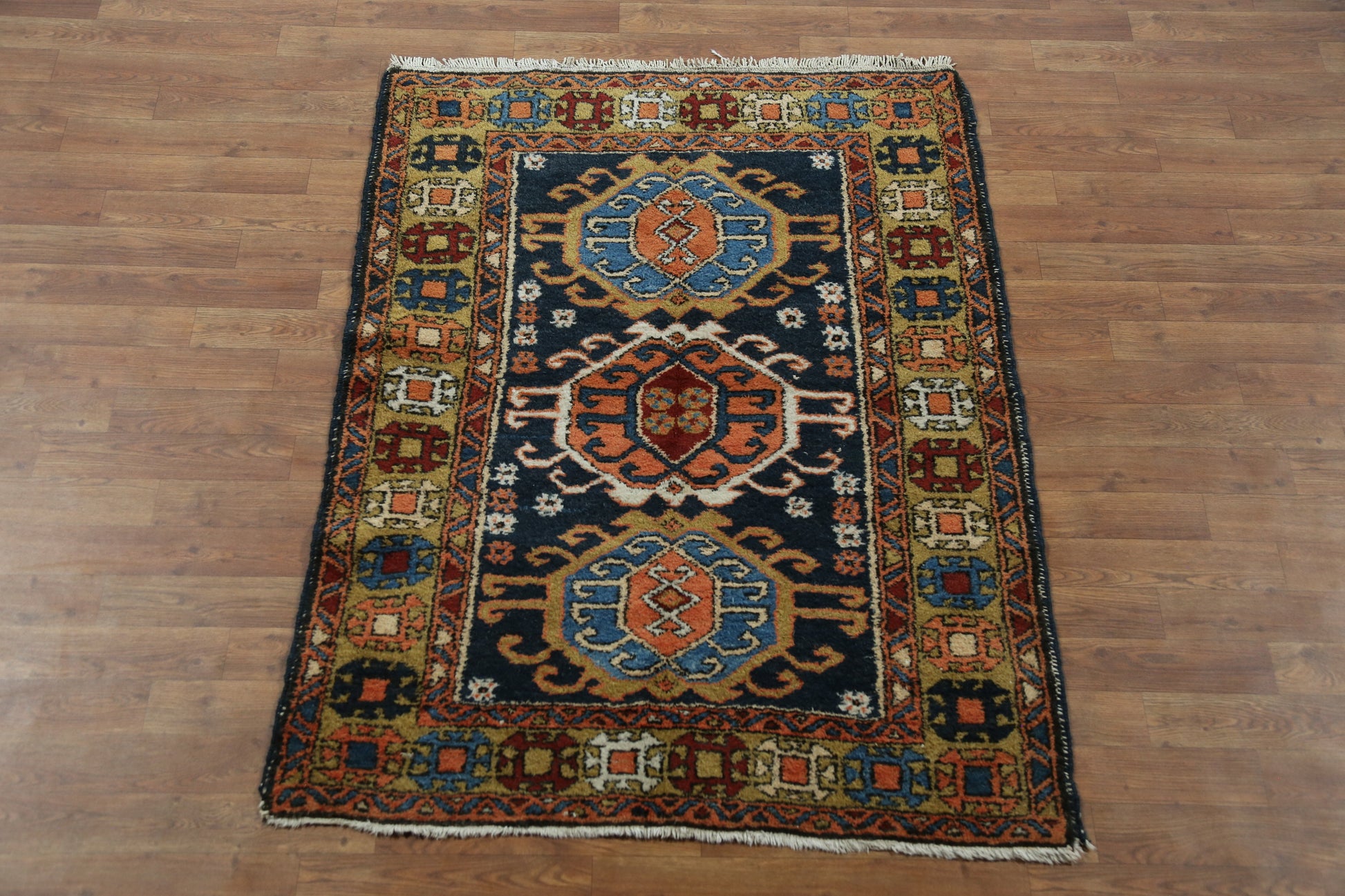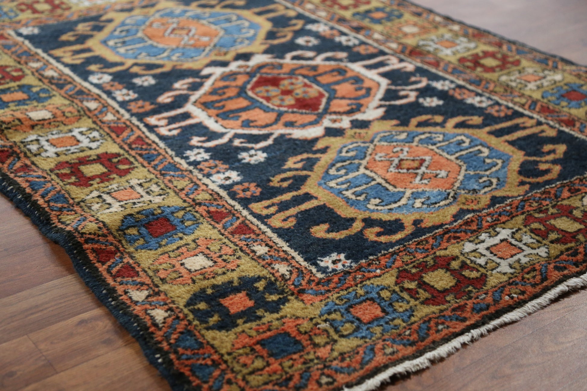 A Beautiful Genuine Persia ( Persia ) Heriz (Bakhshayesh) rug is Hand Knotted by skillful weavers in Persia ( Persia ) with 100% Wool Material. This rug is in Very Good condition. dimensions are 4' 9'' X 3' 8'' in foot and 145 X 112 in centimeter. the primary color is Navy Blue & Blues.